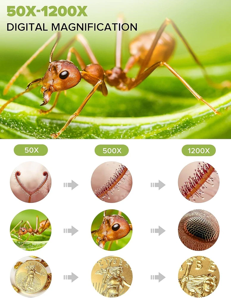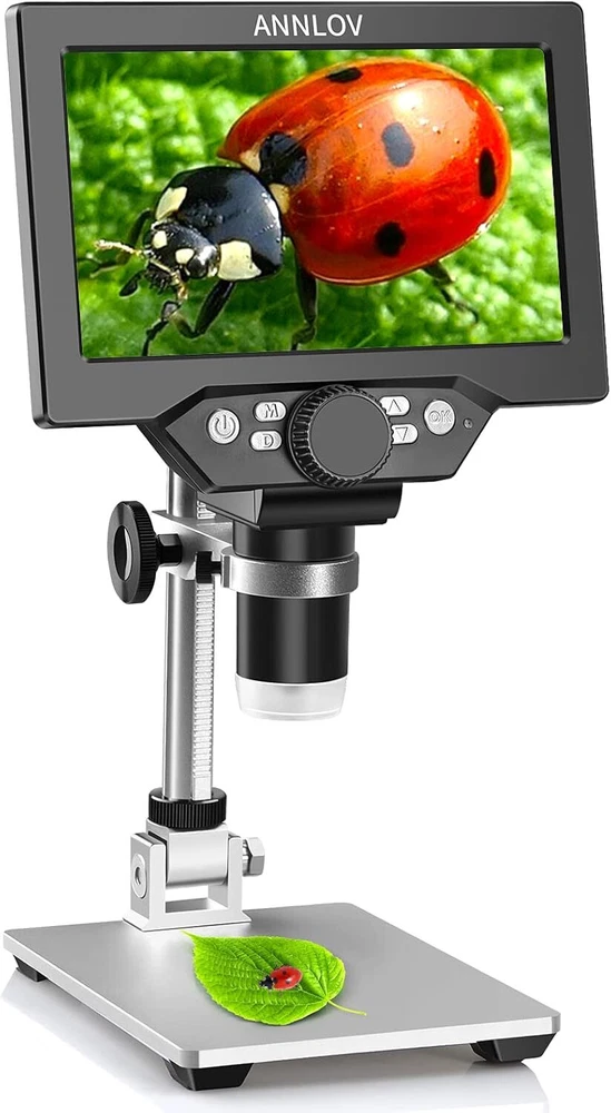 7" LCD Digital Microscope ANNLOV 1200X Maginfication 1080P Coin Microscope with Metal Stand,12MP Ultra-Precise Focusing Video Camera for Kids Adults,8 LED Fill Lights Windows/Mac Compatible Product Details Light Source Type: LED Material: Metal Real Angle of View: 45 Degrees Magnification Maximum: 1200 x Voltage: 5 Volts Brand: ANNLOV Compatible Devices: Laptop Objective Lens Description: Achromatic Power Source: Battery Powered Manufacturer: ANNLOV 50-1200X digital magnification: ANNLOV 7 inch digital microscope allows you to observe objects in the range of 50-1200X. (The actual magnification depends on the screen size, the distance between the camera and the observation point) The microscope is compatible with Win10, so you can connect it to your computer to get a larger image for easy viewing and sharing. 7" LCD Screen: ANNLOV LCD digital microscope has a built-in 7" HD screen that allows you to view directly, which is larger, clearer and has higher magnification than other similar 4.3" screen microscopes. Great for viewing errors in coins, leaf textures, skin textures, fine parts in watches, soldering circuit boards, and more. Easy to focus: Adjust the object to be close to the lens (2cm-10cm), then you can get a clear image by slowly rotating the focus wheel, also you can press the up or down button to resize the image between 1-4X , which is helpful for observing details. Adjustable Stand and Solid Metal and Base: The metal material is stronger, more stable, and more durable than other plastic versions, minimizing shock and keeping your sample in sharp focus, you'll have a more stable and accurate view of your object. At the same time, you can adjust the stand as needed to find the best viewing angle and avoid eye and neck strain. Enhanced Image Quality: Beyond a mere microscope, the ANNLOV Coin Microscope enables real-time image capture and video recording without any delay. After inserting a memory card, you can capture stunning 12MP (4023*3024) photos, record 1080p Full HD (1920*1080) video at 30fps. Ideal for preserving and sharing precious moments with unparalleled clarity.