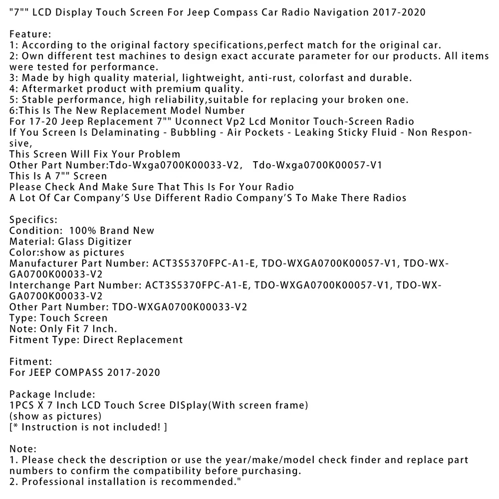 Gas Tank Fuel Cock Valve Petcock fit for Yamaha YZF R1 XJ900 YZ80 4KM-24500-00 18.76 USD Free shipping For BMW E46 323i 325i 328i 330i M3 305 02-06 LHD Center Console Trim Base BE F13 70.61 USD 74.33 USD Free shipping 5% off NEW Set of 4 Door Handles Chrome For Chrysler 300 & 300C 2005-2010 4589009AH USA 74.87 USD Free shipping 7" LCD Digitizer Touch-Screen C070EAT01.0 For Uconnect Radios VP2 2018-2022 83.4 USD 87.79 USD Free shipping 5% off 6L80 6L90 Transmission Rebuild 1-2-3-4 3-5-Reverse Clutch Seals Pack O-Rings 20.89 USD 21.99 USD Free shipping 5% off 1pcs Fuel Injectors 7561277 13537561277 Fit BMW N45 N46N E93 320I 2.0L 17.87 USD Free shipping M18X1.5 Female Aluminum Weld On Fitting Bung US 11.2 USD 11.79 USD Free shipping 5% off Oil Cooler Filter Housing Seal Gasket O-ring 21304-JA11A For Nissan Armada Titan 10.68 USD Free shipping CNC Adjustable Kickstand Side Stand Fit HONDA CBR 600 1000 RR 600RR 1000RR 41.86 USD Free shipping CARBURETOR CARB REPAIR REBUILD KIT FOR GY6 125CC Aprilia PD24J BMW ATV Go Kart 15.79 USD Free shipping Pair Silver Motorcycle Handlebar Riser Kit Moves Bar Up For BMW F800GS 2008-2017 33.13 USD 34.87 USD Free shipping 5% off Engine Oil Filter Housing Gasket 2781840280 for Mercedes-Benz M278 V8 2014-2020 14.05 USD 14.79 USD Free shipping 5% off A Fantastic Shop Send us a message Our Store Seller Profile Feedbacks Save this seller Contact 7" LCD Display Touch Screen For Jeep Compass Car Radio Navigation 2017-2020 7" LCD Display Touch Screen For Jeep Compass Car Radio Navigation 2017-2020 Feature: 1: According to the original factory specifications,perfect match for the original car. 2: Own different test machines to design exact accurate parameter for our products.All items were tested for performance. 3: Made by high quality material, lightweight, anti-rust, colorfast and durable. 4: Aftermarket product with premium quality. 5: Stable performance, high reliability,suitable for replacing your broken one. 6:This Is The New Replacement Model Number For 17-20 Jeep Replacement 7" Uconnect Vp2 Lcd Monitor Touch-Screen Radio If You Screen Is Delaminating - Bubbling - Air Pockets - Leaking Sticky Fluid - Non Responsive, This Screen Will Fix Your Problem Other Part Number:Tdo-Wxga0700K00033-V2, Tdo-Wxga0700K00057-V1 This Is A 7" Screen Please Check And Make Sure That This Is For Your Radio A Lot Of Car Company'S Use Different Radio Company'S To Make There Radios Specifics: Condition: 100% Brand New Material: Glass Digitizer Color:show as pictures Manufacturer Part Number: ACT3S5370FPC-A1-E, TDO-WXGA0700K00057-V1, TDO-WXGA0700K00033-V2 Interchange Part Number: ACT3S5370FPC-A1-E, TDO-WXGA0700K00057-V1, TDO-WXGA0700K00033-V2 Other Part Number: TDO-WXGA0700K00033-V2 Type: Touch Screen Note: Only Fit 7 Inch. Fitment Type: Direct Replacement Fitment: For JEEP COMPASS 2017-2020 Package Include: 1PCS X 7 Inch LCD Touch Scree DISplay(With screen frame) (show as pictures) [* Instruction is not included!] Note: 1.Please check the description or use the year/make/model check finder and replace part numbers to confirm the compatibility before purchasing. 2.Professional installation is recommended. About US About Our Items We strive to describe all items accurately and thoroughly, with the utmost care and attention to detail. However, to ensure a mutually satisfactory transaction, we kindly ask for your assistance in thoroughly reviewing the item description and photos, and addressing any questions before placing a bid. Customer Satisfaction We stand behind our commitment with exceptional service, a 100% money-back guarantee, and a dedication to customer satisfaction. I am readily available to address any inquiries or concerns you may have, both before and after your purchase. Our aim is to ensure your shopping experience is enjoyable and that you're delighted with your purchase. Feedback Your feedback is crucial to our business's success. If you're satisfied with your purchase and the service you received, we would greatly appreciate your positive feedback, along with an overall Detailed Selling Rating (DSR) of 5. Please take a moment to leave us positive feedback. Our eBay account is set up to automatically reciprocate positive feedback once yours is received. If you're considering leaving neutral/negative feedback or opening an eBay/PayPal case, we encourage you to reach out to us immediately. We're committed to resolving any issues to the best of our ability. Shipping Parcel will be shipped using Standard shipping method. For security purposes, items will be shipped exclusively to the confirmed address on Paypal. Please ensure your Shipping address is up to date before proceeding with payment. Estimated delivery time within the United States ranges from 3 to 10 business days, depending on your location. Returns We accept returns within 60 days from the date the buyer receives the item. If the item is found to be defective upon receipt, the customer has up to 30 days from the date of receipt to request an exchange for a new item or a refund. For returns due to a change of mind, we accept items in their original selling condition. However, if the package has been opened due to a mistaken order, it does not qualify for our return policy. Please note that the buyer is responsible for covering the cost of return postage. If you encounter any issues, please reach out to us via eBay message, and we'll respond within 24 hours. NEW 7" Navigation Display Touch Screen Radio 39710-TBA-A11 For Honda Civic 16-18 268.87 USD Free shipping 2x Tailgate Cable M159508 For John Deere Gator HPX615E HPX815E 17.71 USD Free shipping 4" to 8" PNP Conversion Power Harness HC3Z-19A387-B Fit Ford SYNC 1 to SYNC 2USA 36.87 USD Free shipping 6.5" LCD Touch Screen Display For VW Skoda MIB STD2 684 200 TDO-WVGA0633F00045 203.09 USD 213.78 USD Free shipping 5% off 8' 55 Pin Touch Screen DJ080PA-01A For Chevr GMC MYLINK Navigation Raido 31.87 USD Free shipping Parking Brake Release Handle 7L6711878F For VW To