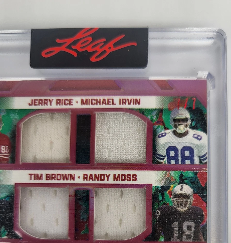 This rare and highly sought-after sports trading card features some of the greatest names in NFL football, including Jerry Rice, Michael Irvin, Cris Carter, Tim Brown, Randy Moss, Don Maynard, Terrell Owens, and Marvin Harrison. The card is a limited edition 2023 Leaf Art of Sport set with a print run of only 7, and is a red spectrum holofoil parallel/variety. Game Used jersey patches!! In addition to the exclusive and highly sought-after design, this card also features memorabilia from some of the featured players, including the New York Jets, San Francisco 49ers, Minnesota Vikings, Dallas Cowboys, Philadelphia Eagles, and Indianapolis Colts. With its short print, serial numbering, and other unique features, this card is a must-have for any serious football card collector.