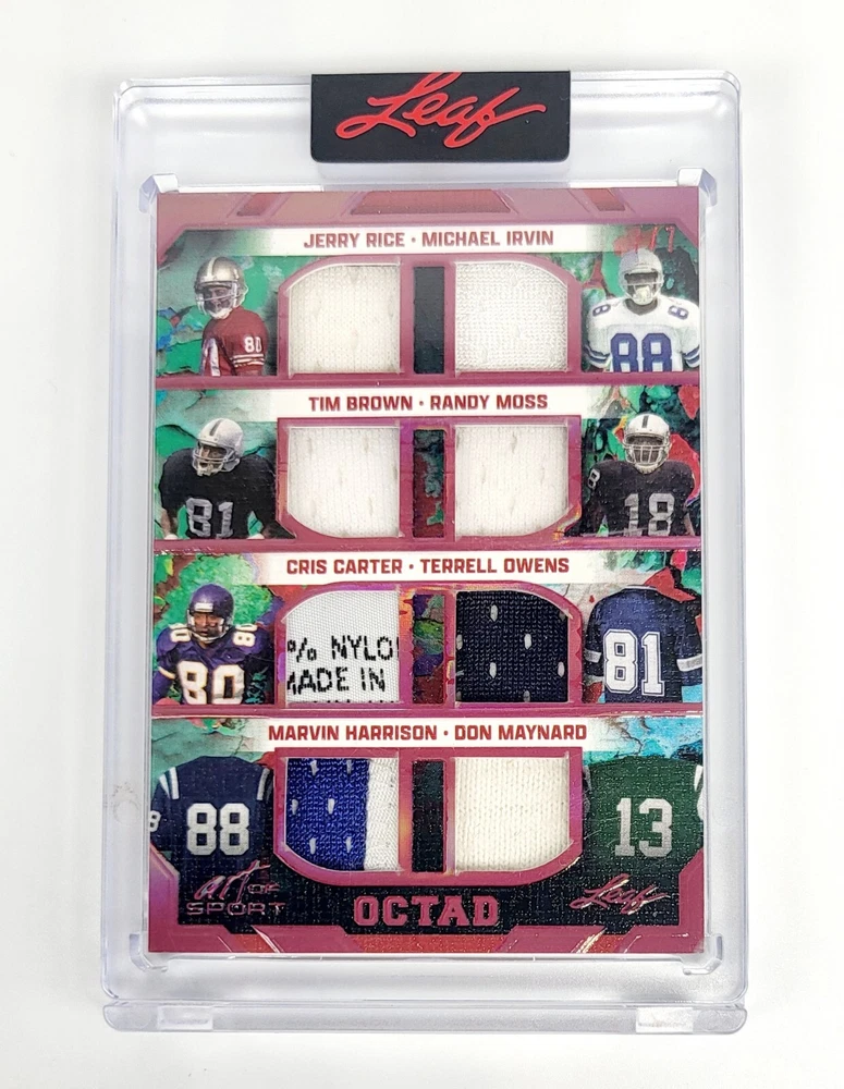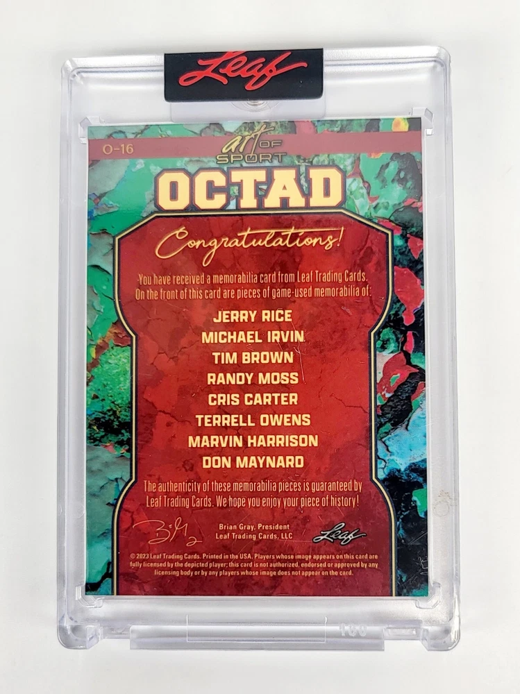 Set: 2023 Leaf Art of Sport Autographed: No Parallel/Variety: Red Spectrum Holofoil Season: 2023 Year Manufactured: 2023 Type: Sports Trading Card Card Number: O-16 Team: Minnesota Vikings, Dallas Cowboys, New York Jets, Indianapolis Colts, San Francisco 49ers, Philadelphia Eagles Sport: Football Player/Athlete: Cris Carter, Don Maynard, Jerry Rice, Marvin Harrison, Michael Irvin, Randy Moss, Terrell Owens, Tim Brown Features: Memorabilia, Parallel/Variety, Serial Numbered, Short Print, Limited Edition, Insert, Exclusive, Chase League: National Football League (NFL) Manufacturer: Leaf Print Run: 7