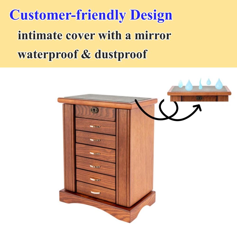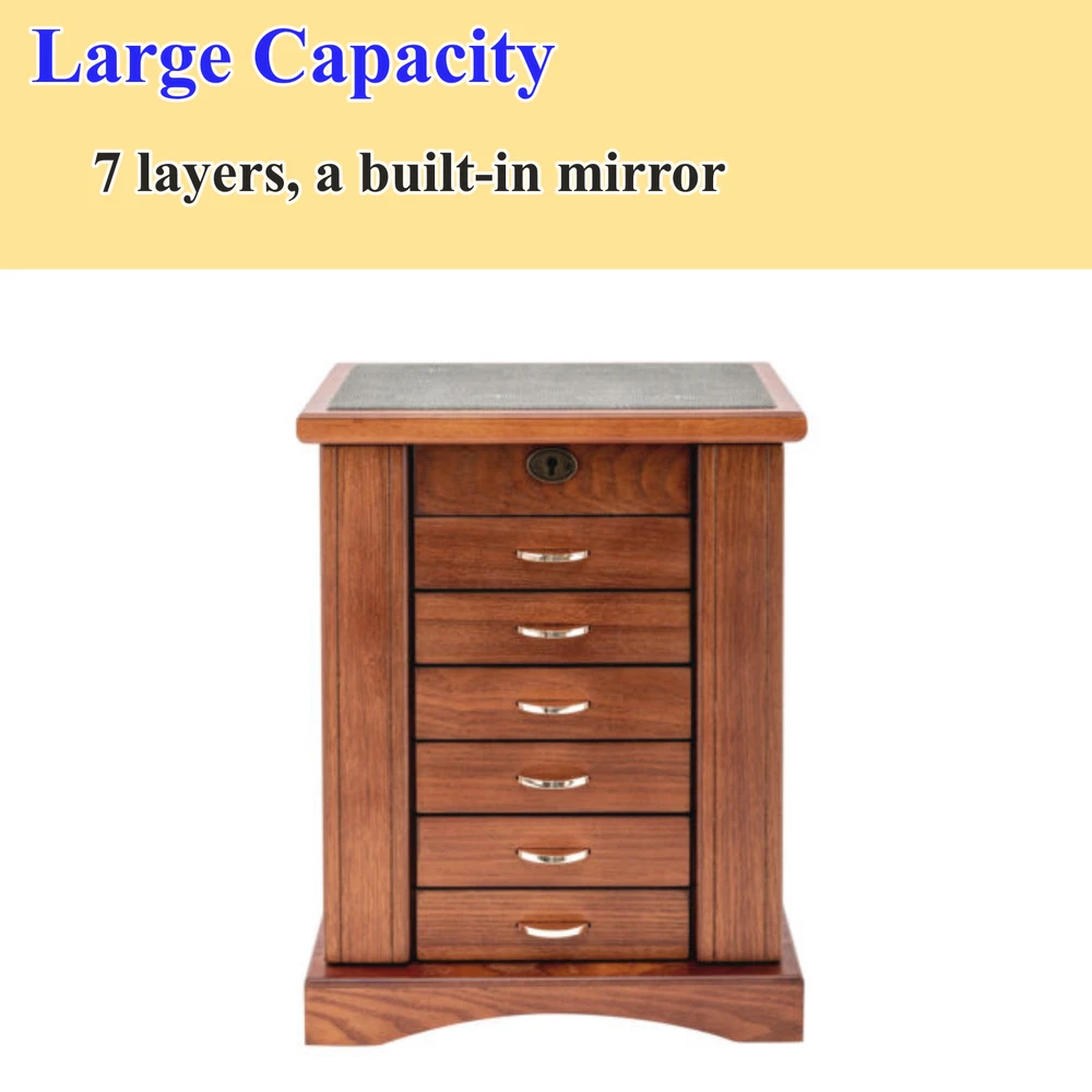 7 Layers Wooden Jewelry Ring Display Organizer Case Large Earring Storage Box US Description Every girl has some beautiful jewelry, which can provide us with a better mental outlook. But how to store it often makes us feel distressed. Our seven-layer jewelry box can help you solve this problem. It is made of MDF. The jewelry box is sturdy and durable, ensuring that you can use it for a long time. Large capacity and reasonable layout can help you store all kinds of jewelry in boxes and create a clean environment for you. It will be a good assistant in your daily life. Specifications Material: MDF Lining Material: Flocking Cloth Surface Treatment: Grinding, Color Repairing, and Painting Color: Walnut Style: Retro Shape: Rectangular Mounting Type: Free-standing Closure Type: Key Lock Number of Layers: 7 Net Weight: 6kg/13.23lbs Gross Weight: 6.5kg/14.33lbs Product Size: 28.3*17.6*36cm/11.1*6.9*14.2inch Package Size: 34.5*26*43cm/13.58*10.24*16.93inch Package Included 1* Jewelry Box 1* Key Key Features Premium Material: The jewelry box is made of MDF and flocking cloth, which is durable and not easy to deform. The flocking cloth can better protect your jewelry from scratches. Exquisite Workmanship: The jewelry box adopts grinding, color repairing, and painting to make the surface of the product smoother and brighter, which shows our attitude toward beauty and life. Large Capacity: The jewelry box is equipped with seven layers in total. Such a large capacity allows you to store many items, such as necklaces, watches, etc. at one time, saving desktop space and fully meeting your needs. Reasonable Layout : According to different sizes and types of jewelry, this jewelry box is designed with compartments of different sizes, as well as special necklace hangers, ring rolls, etc., so that you can store, take and display your jewelry better. Beautiful Appearance: The jewelry box is walnut in color, demonstrating antiquity and nobility. With smooth lines, the whole jewelry box is full of fashion and elegance. It can also make your room more attractive. Customer-friendly Design: The intimate cover with a mirror provides waterproof and dustproof performance to better protect your jewelry while facilitating your makeup. Ready to Use : The jewelry box does not need to be assembled. You can use it directly after receiving the goods, saving you time. Easy to Clean: The surface of the jewelry box is smooth, so you don't need to spend much effort to clean it. When dust accumulates, you can clean it with a wet towel. Small Floor Space: The overall size of the jewelry box is 11.1 * 6.9 inches, which will not occupy too much space, so you can put it in the bedroom, dresser, and other places at will. Ideal Gift: With a beautiful appearance, unique design, and enough space, you can give it to your mother, lover, or friend, or regard it as a gift for Valentine’s Day, Christmas, and birthdays. Protective Packaging: Both foam and bubble bag are used in the package of the jewelry box, which can protect the product well during transportation so that it can be delivered to you completely. Details Key: A key is provided in the package of the product, and the top of the product is equipped with a lock catch, which is convenient for you to access jewelry and prevent the loss of items. Beautiful Handle: Each drawer of the jewelry box is equipped with a handle with a metallic luster, which is beautiful and convenient for you to take jewelry. Hook: The compartments on both sides of the jewelry box for storing necklaces are respectively equipped with four hooks, which are solid and firm. You can better place and store necklaces and avoid knotting necklaces. Base: The base of the jewelry box is very firm, which can make the jewelry box more stable and not easy to shake. Round Corners: The edges of the jewelry box are very round, which can prevent your hands from being scratched, so as to better protect your safety. Application The product can be widely used to store watches, necklaces, earrings, rings, and other items, and can be placed in the living room, bedroom, dressing table, and so on. Notes Please pull the drawer carefully when using it, and do not use force to destroy the handicraft. Please keep this product away from water sources. Please allow the slight color difference caused by the shooting light and 1-3cm error due to manual measurement, and make sure you do not mind before you order. Payment Delivery details Terms of sales About us Contact us Payment We accept ebay payment 。 Fees such as import duties, taxes are not included in the item price or shipping costs. These charges are the buyer's responsibility. Delivery details Shipping: 2-9 working days to: USA Terms of sales We maintain high standards of excellence and strive for hundred percent customer satisfaction. Feedback is very important to us. We hope that you contact us immediately before you give neutral or negative feedback, so that we can address your concerns. It is impossible to address issues if we do not know about them! About us Your satis faction is our ultimate goal. We work hard to earn your trust and future business. Our certified technicians have tested each item before shipping. The unit comes with 1 year limited warranty on all manufacturing defects. a) If you receive a defective item, you may return it or ask for a discount. Please contact us within 14 days after you receive the package. b) What you returned must be intact and in its original packaging as re? u. Customer is responsible for shipping costs of the returned item. c) We will cover the cost of shipping back t with the shipping rate indicated in the registration page. We will send you a new unit or refund the full payment you paid. Thank you. Contact us Business Hour Business Hour: Monday To Friday: 8:30 AM to 5:00 PM (Beijing China time) Due to time zones, our reply to your questions may not be immediately. But within above working time, we will reply your email within 24 hour