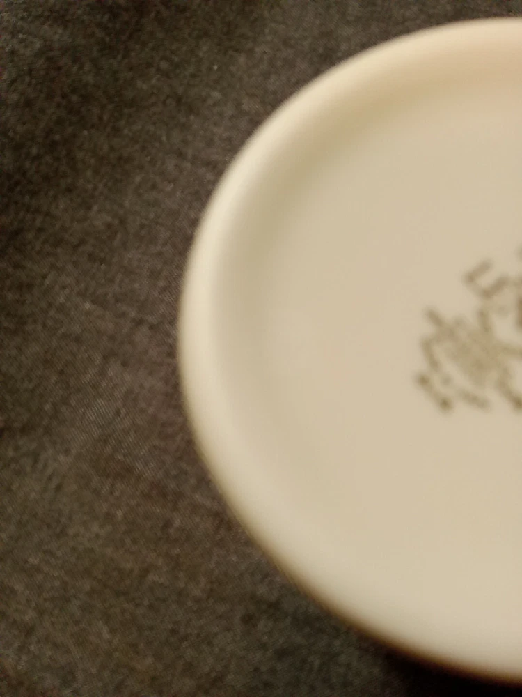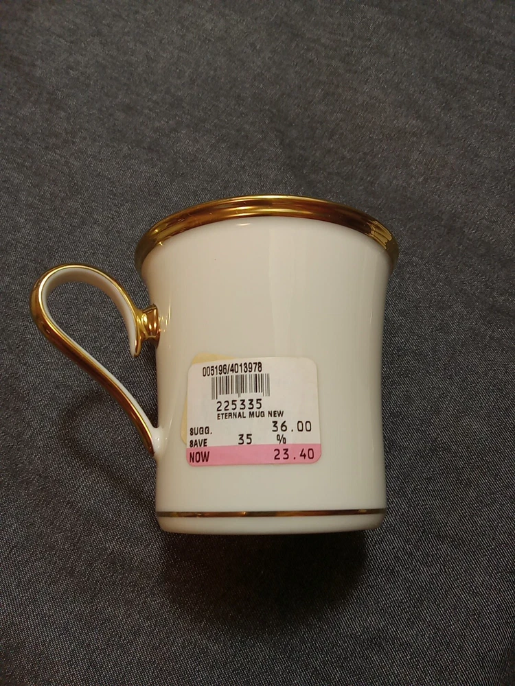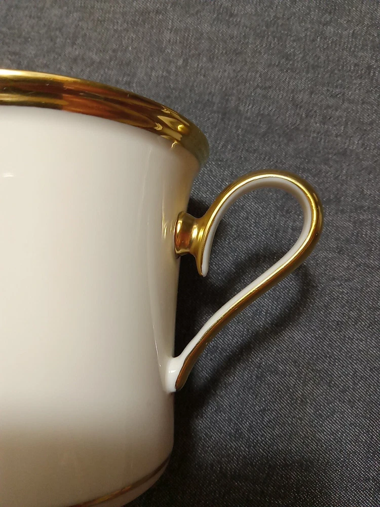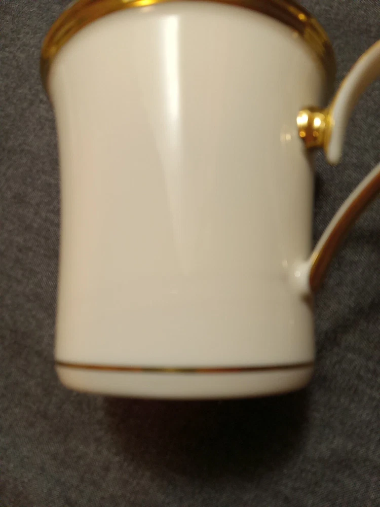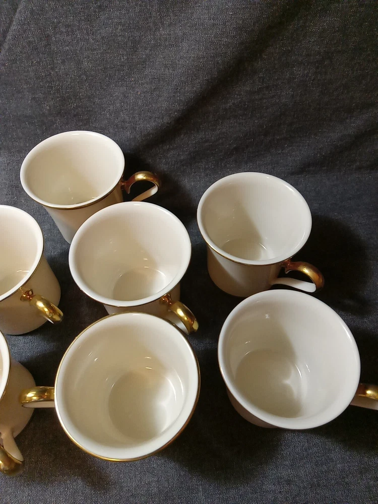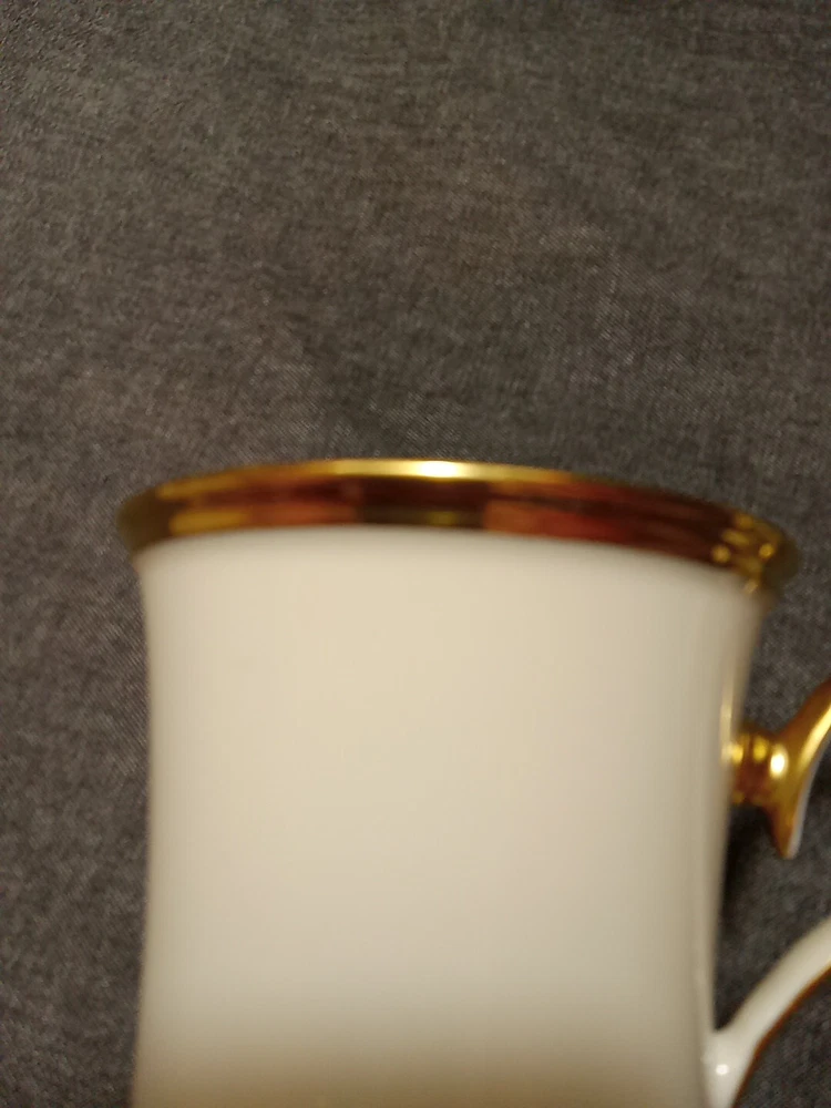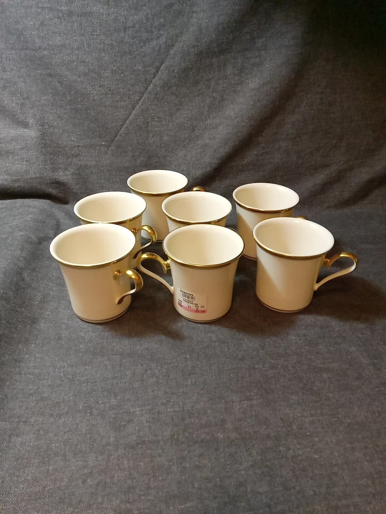 Very clean. No chips, cracks, scratches, crazing. Very little sign of usage. One mug has the original price sticker of $23. They are factory second. One mug has a light dot shown in the third photo from the last. One has light paint smear on the bottom shown in the second from the last photo. All the gold trims are clear, not worn off. It measures 3 1/2 by 3 1/2.