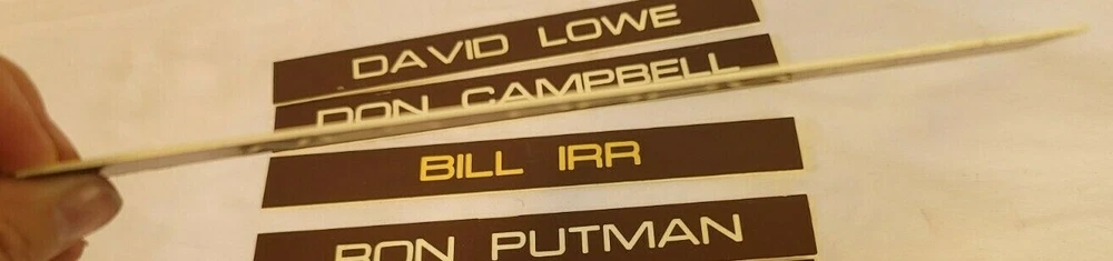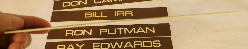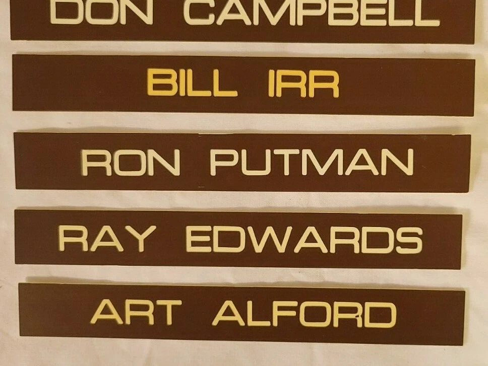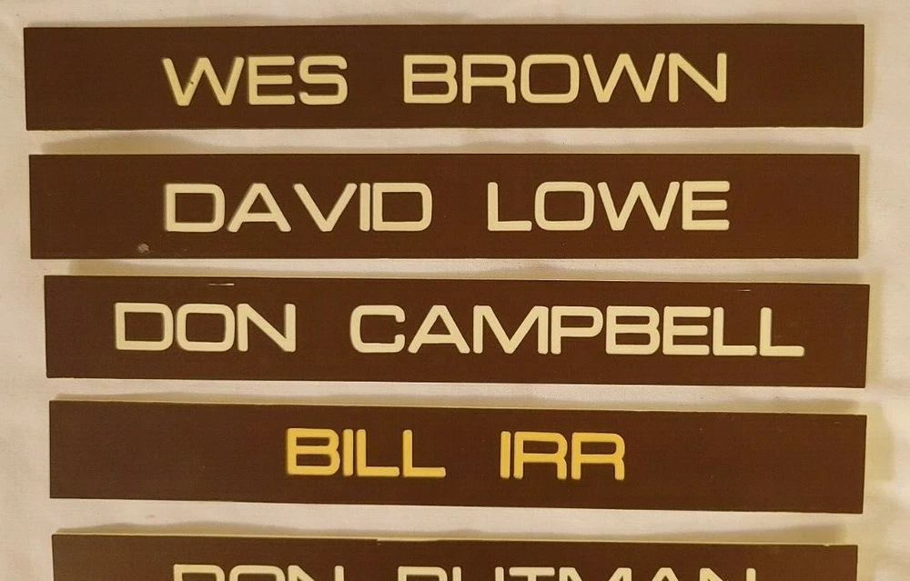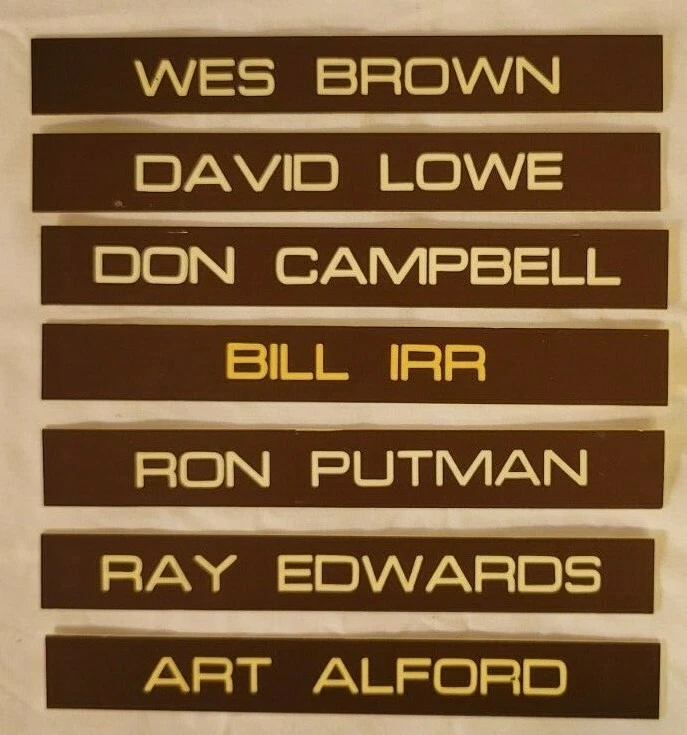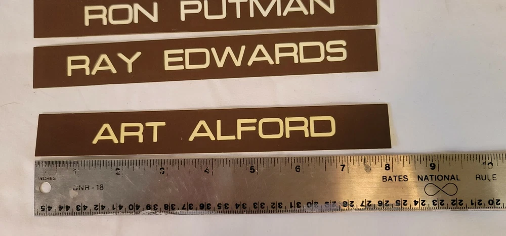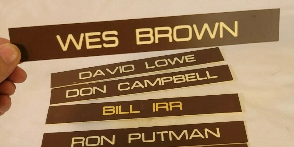 7 Office door name plates plastic. Brown and white 8in x 1 in. These were the name plates that slide in a frame on the outside of a door for a salesman at a car dealership. The car dealership was Kircher Pontiac in Fort Worth, TX. The dealership closed in 1980. Wes Brown David Lowe Don Campbell Bill Irr Ron Putman Ray Edwards Art Alford