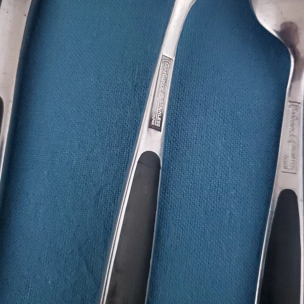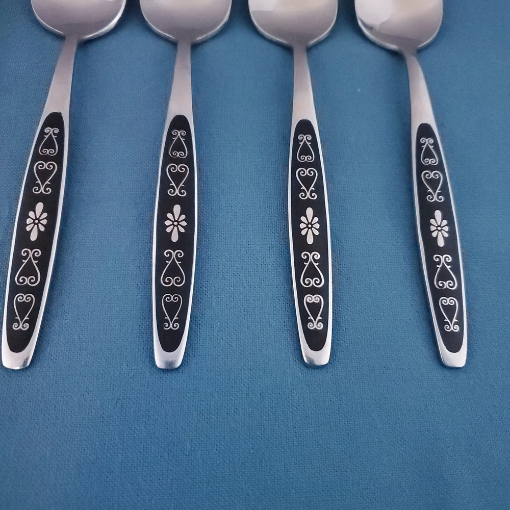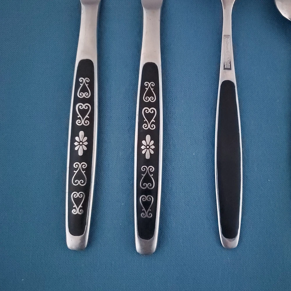 7 Pcs Riviera RIF25 ~ (1) Dinner Fork, (2) Dinner Knives, (4) Teaspoons ~ Black These beautiful pieces are in Used Vintage Condition. There are some marks, scuffs, nicks and surface scratches consistent with age and use as well as some spots and darkening . *Two Pieces have small cracks across the top of the black section ~ the fork and one of the spoons (see photos)* Please view the photos carefully for condition details. Don't forget to check out the other items in my shop. I'm getting in new fun things all the time. Thank you for looking! Have a great day!
