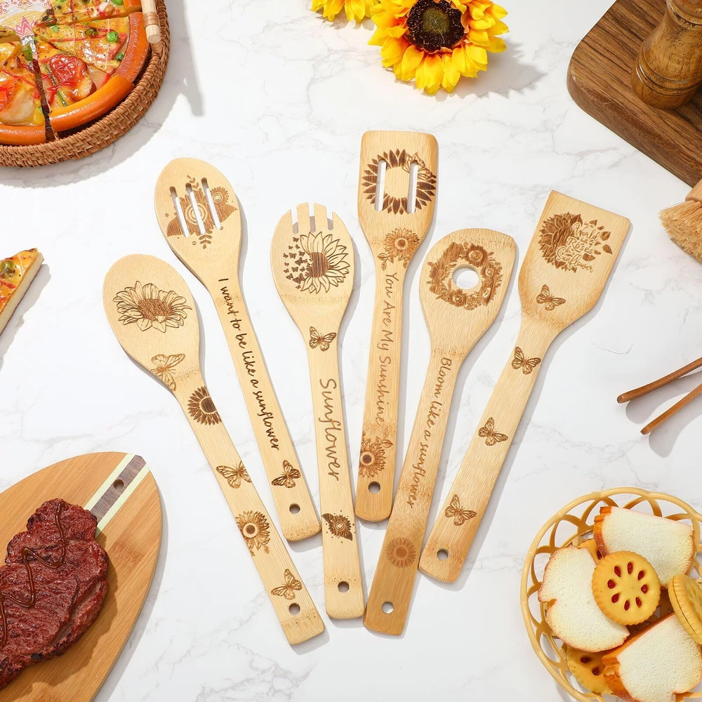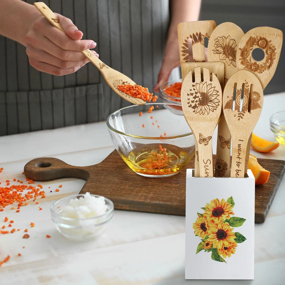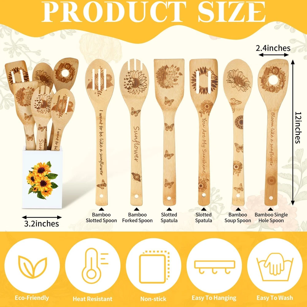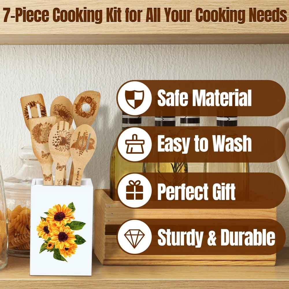 Features: Functional and convenient design: Integrated with a handle hole, the funny spoons can be hung for immediate accessibility. The sturdy wood holder not only fortifies this set but allows for the utensils to be placed conveniently near the stove, ready to be applied when needed. Embellish your kitchen with the lively sunflower motif for a fresh and contemporary look. Ideal gift choice: With its unparalleled sunflower theme, this funny spoon set makes for an apt gift for sunflower and cooking enthusiasts alike. Be it for birthdays, housewarming parties, Mother's Day, or Christmas, this beautiful kitchen set adds a touch of modern charm and positive vibes to any kitchen, elevating the overall cooking experience. Specifications: Material: wood, Color: Holder: white background, sunflower pattern Utensils: natural Size: Holder: about 5.91 x 3.94 x 3.94 inches/ 15 x 10 x 10 cm Utensils: about 2.36 x 11.81 inches/ 6 x 30 cm Package includes: 1 x Holder 6 x Sunflower kitchen utensils Notes: Manual measurement, please allow slight errors on size. The color may exist a slight difference due to different screen displays. Blooming Sunflower Aesthetics: imbued with elegant 3D sunflower engraving and quotes, these sunflower kitchen accessories lend a cheerful touch to your kitchen decor; With sunflowers denoting positivity and optimism, this unique combination can instill a spirit of happiness and create a modern yet cozy ambience in your kitchen setup Comprehensive Variety for Most Cooking Needs: the 7 piece spoon set consists of different functional spoons such as a slotted spoon, turner spoon, curved spoon, non slotted spoon, single hole spoon, and an attractive spoon holder; Each spoon serves a specific purpose, from blending flour to serving soups, making it an ideal choice for apartment living Thoughtfully Tailored Design: with polished edges and a smooth surface, each spoon holds an elegance of its own; The spoon head is delicately designed to capably handle a range of tasks, from flipping thick steaks to gently stirring omelets; An elongated handle enhances the holding experience, diminishing the potential for hot oil splashes, thereby ensuring safety during cooking; Each spoon is equipped with a hole for easy hanging and storage Dependable Quality: the sunflower utensil holder, crafted with wood, is reliable and steadfast, printed with sunflower pattern, resisting fading and cracking, while having a smooth surface; The spoons are made from 100% natural , providing a trustable alternative that won't scuff your pots and pans, particularly suitable for ceramic and non stick variants Heartwarming Gift for Sunflower Aficionados: being the heart of the home, the kitchen should reflect warmth and conviviality; These spoons for cooking celebrate the joy of sunny summer days and offer an organic touch to your kitchen environment, making them a delightful gift for sunflower and cooking enthusiasts alike