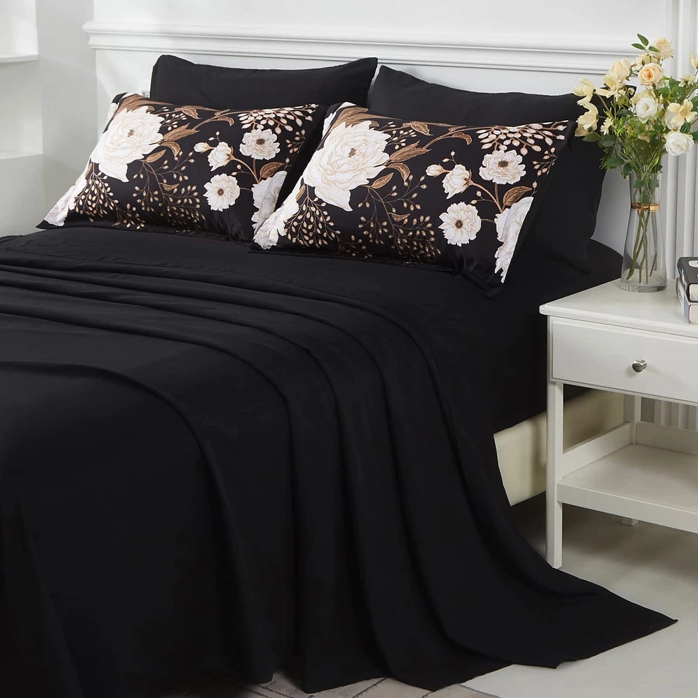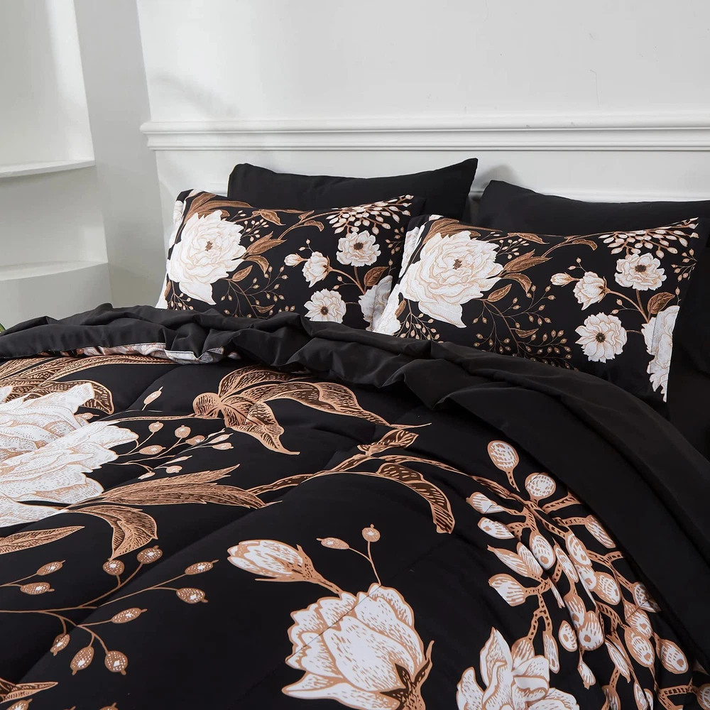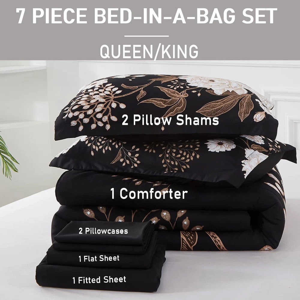 Premium Quality Fabric:100% Soft Cozy Microfiber,Super soft, smooth and breathable, perfect for all season. Our bedding sets are durable and easy to clean, no worry about shrink, fading & wrinkles after several washes. Simple and Stylish Design:White floral leaves printed on the Black. The unique botanical design can help you achieve the stylish and fresh style. As a perfect decoration, it is suitable for any room in your house. Good choice as a birthday gift or special holiday gift for teens, boys, girls, men or women. Everything You Need:7 Pieces Queen Size Bed in a bag includes 1 Comforter(90"x90"),1 Flat Sheet(90"x102"),1 Fitted Sheet(60"x80"+16"),2 Pillowcases(20"x30"),2 Pillow Shams(20"x26");This bed-in-a-bag set is perfect for you perfect for renewing the freshness in any room. Easy Care:Unique stitching craftsmanship keeps the comforter's filling in place and distributed evenly, and prevent the filling from moving around or clumping together.Machine wash cold the soft comforter on gentle cycle, tumble dry on low heat, do not bleach to keep the color vibrant, Spot Clean Pillow CUSTOMER SERVICE: really appreciate your love, any question about our product is welcome, all your message can be replied in 24 hours on AMAZON.