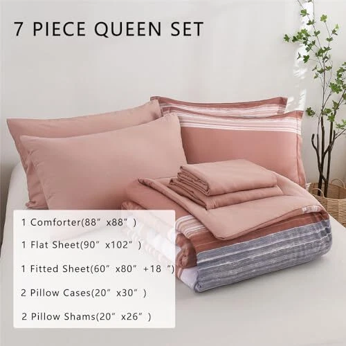 Return Policy Fast Delivery Trusted seller 7 Piece Bed in a Bag Stripe Comforter Set Queen Size, White Grey Blush Pink Patchwork Striped Comforter and Sheet Set, All Season Soft Microfiber Complete Bedding Sets(Pink,Queen) Product Description Polyester [Simple Striped Design]: Comforter set with simple stylish white grey pink gradient striped design, reviving your bedroom into an elegant and modern facade. The perfect blend of bold and vibrant color, lighting up your home with lovely and lively look. Suitable for girls teen women. [Queen Comforter Set]: You can get 7 piece bed in a bag queen with 1 comforter(88”x88”),1 flat sheet(90”x102”),1 fitted sheet(60”x80”+18”),2 pillow cases(20”x30”),2 pillow shams(20”x26”). The striped comforter may come wrinkled because of the vacuum sealed bag. Put it in the sun and tap gently for fluffy. [Premium Microfiber]: Premium microfiber fabric with polyester filling, soft,fluffy, comfortable and lightweight. Creating a cozy and comfy sleeping environment and providing cloud like feelings for you. Cover with the blush striped comforter to enjoy a deep sound sleep all night. [Great Craftsmanship]: The white and pink striped bedding sets adopt tight stitching process. Preventing the filler from shifting or clumping. Durable for long time use, suitable for all season. Keep warm and cozy all year round. Allows for a comfortable night’s sleep. [Easy Care and Service]: The 7 piece stripe complete bed set can be machine washed in cold water with gentle cycle, sun-dry or tumble dry on low heat if needed. The color will remain bright and vibrant after repeated washing. We believe in our product quality,please buy with confidence. Shipping Returns Payment Shipping Shipping is FREE to all addresses other than APO/PO boxes in the lower 48 states. All our stock ships from US-based warehouses. Shipped via USPS or UPS (depending on location and package weight) Unless stated otherwise, all orders will ship within 24-72 hours of your payment being processed. Check our feedback to see the great reviews of FAST shipping we offer. Returns Seller does not accept returns Payment We currently accept payment via eBay managed payments only. Once payment is cleared, we will dispatch your shipment within 1-3 business days. Please refer to the "Shipping" tab for more information regarding shipping speed to your destination.