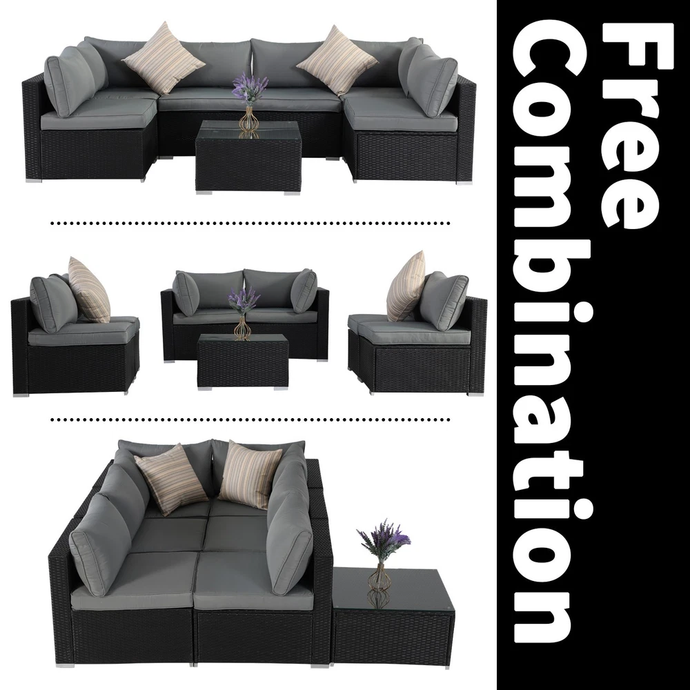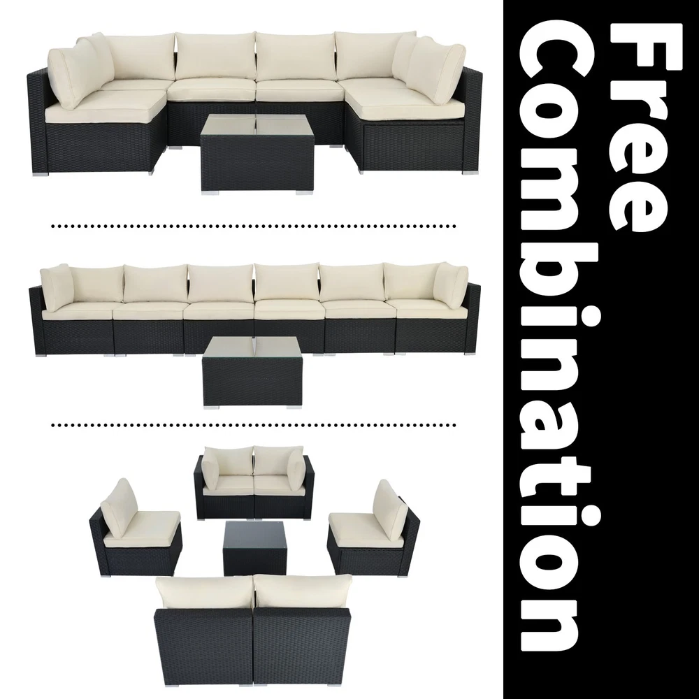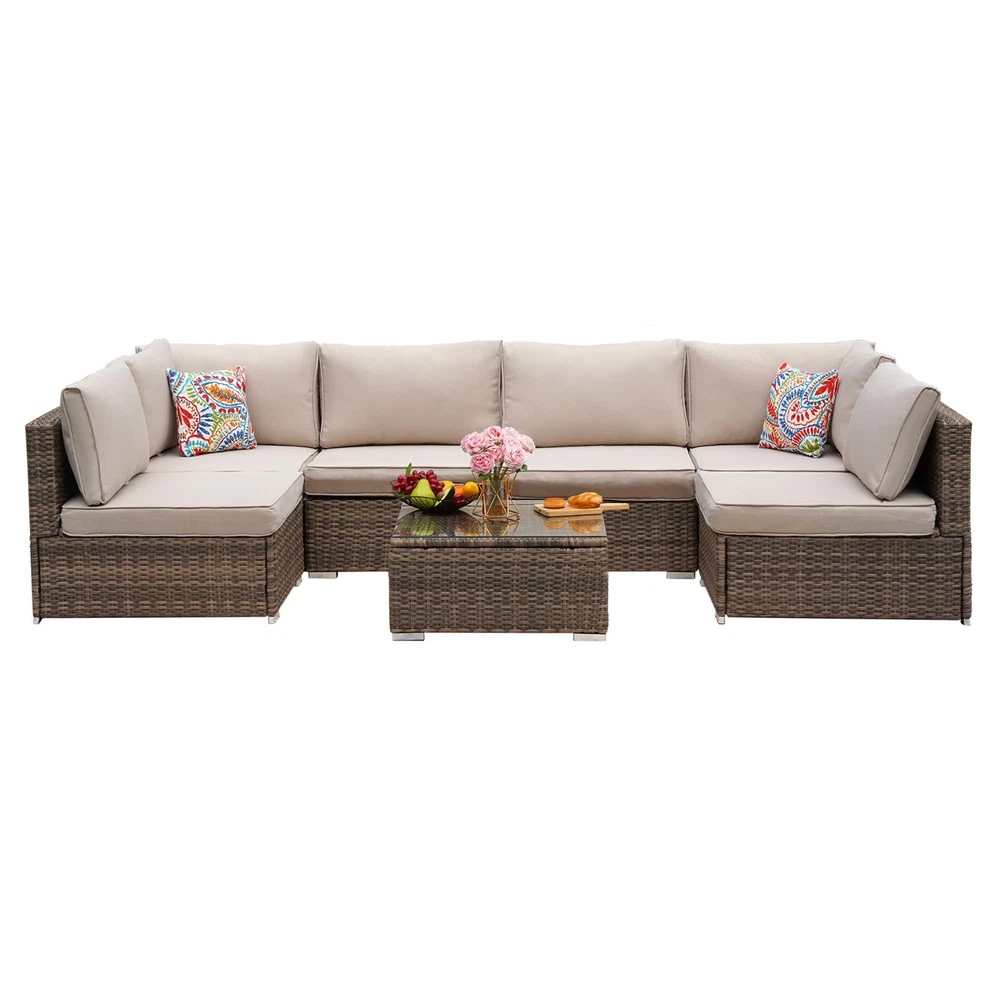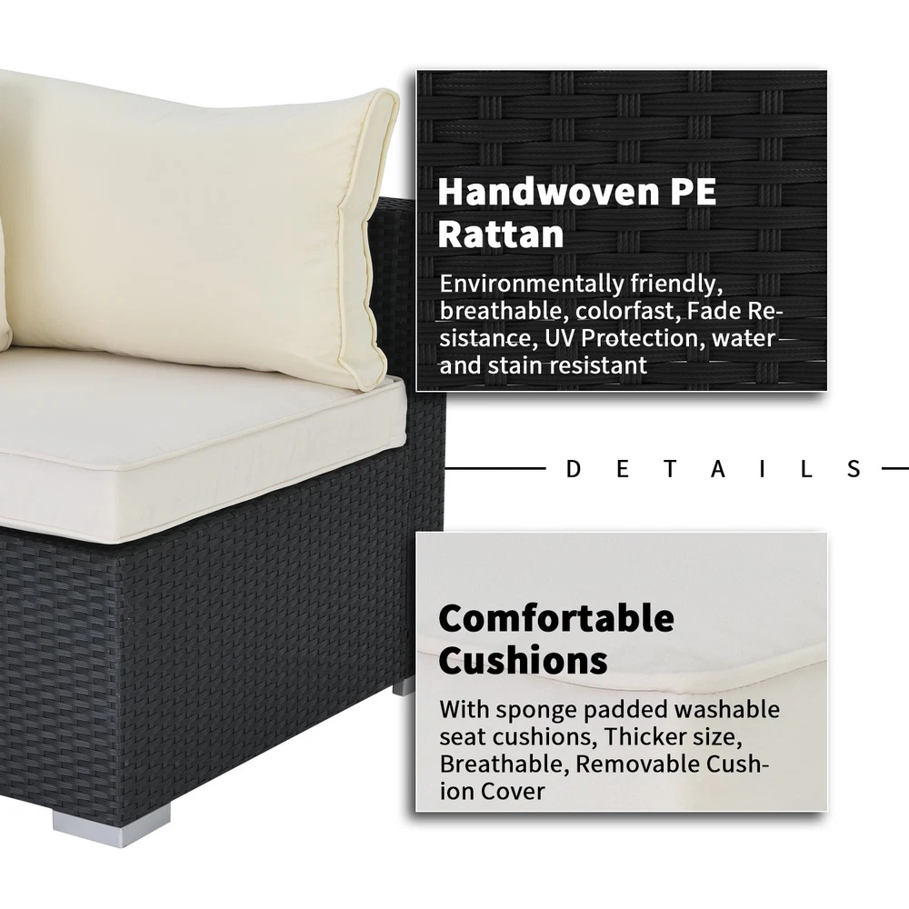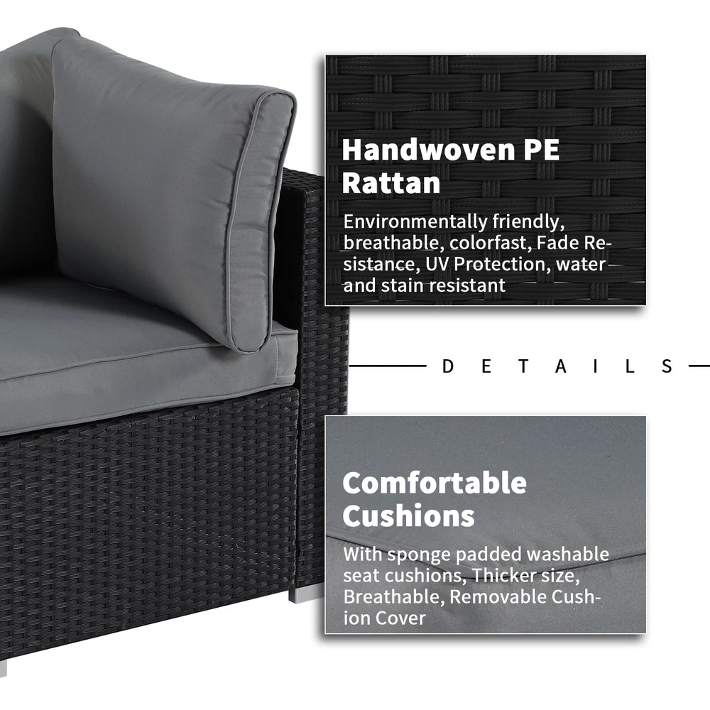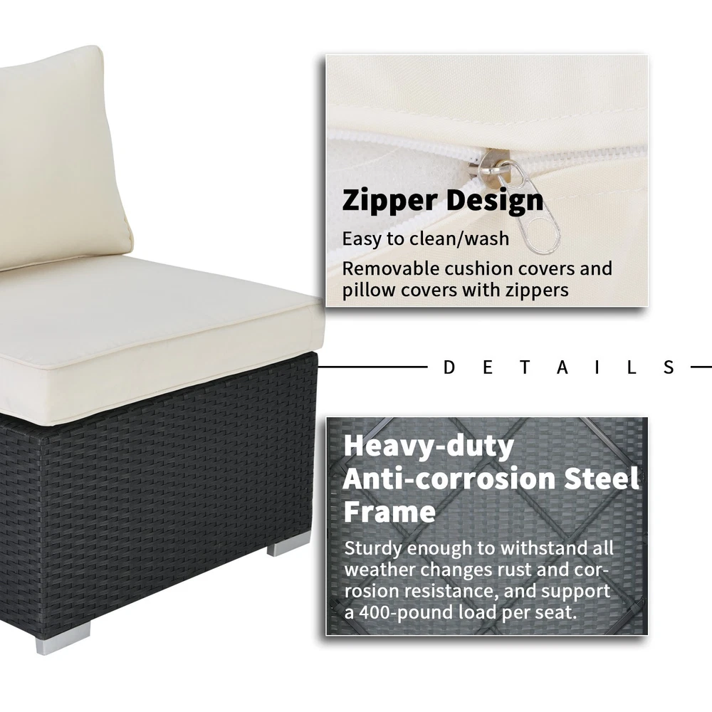 Durable All-Weather Patio Sectional Fureniture Set: This outdoor patio sectional combines hand-woven rattan outdoor furniture with a rust-resistant steel frame for a wicker patio furniture set built to last. Perfect for year-round use, this outdoor sectional furniture withstands sun, rain, and wind without fading, cracking, or sagging Thick Cushions & 2 Extra Pillows for Comfort: Our outdoor sectional includes plush 4" water-resistant cushions plus 2 extra pillows for added back support and style. The removable, washable covers make it easy to maintain your patio sofa, while the fade- and stain-resistant fabric ensures this wicker outdoor furniture always looks fresh Modular Layout for Any Outdoor Space: This outdoor sectional couch can be arranged into a U-shape, L-shape, or linear design to fit patios, decks, balconies, or poolside areas. Connector clips keep each piece of the patio sectional furniture set in place, giving your patio conversation set a clean, polished look Easy Assembly & Versatile Use: Your patio couch set arrive with all hardware, tools, and clear instructions for quick assembly. Whether you need backyard furniture, deck furniture, or a patio couch set, this outdoor sectional sofa adapts to any outdoor living area Stylish Coffee Table for Outdoor Entertaining: The matching wicker coffee table with a tempered glass top completes your patio furniture sectional. It’s perfect for drinks, snacks, or décor, making this outdoor patio set ideal for gatherings, relaxing, and enjoying your back yard furniture set in style