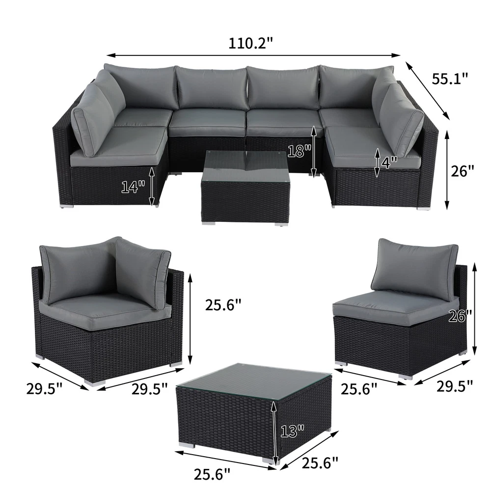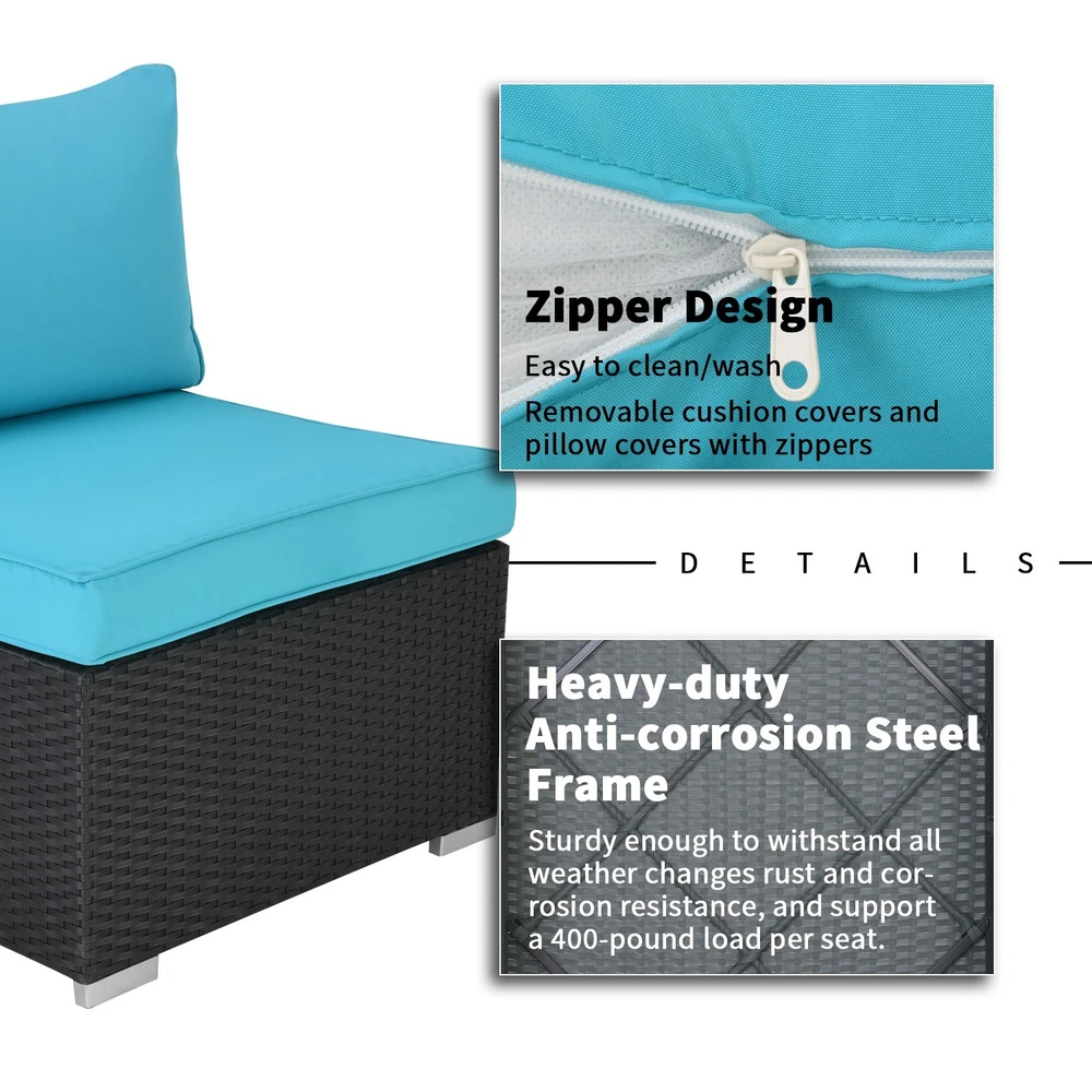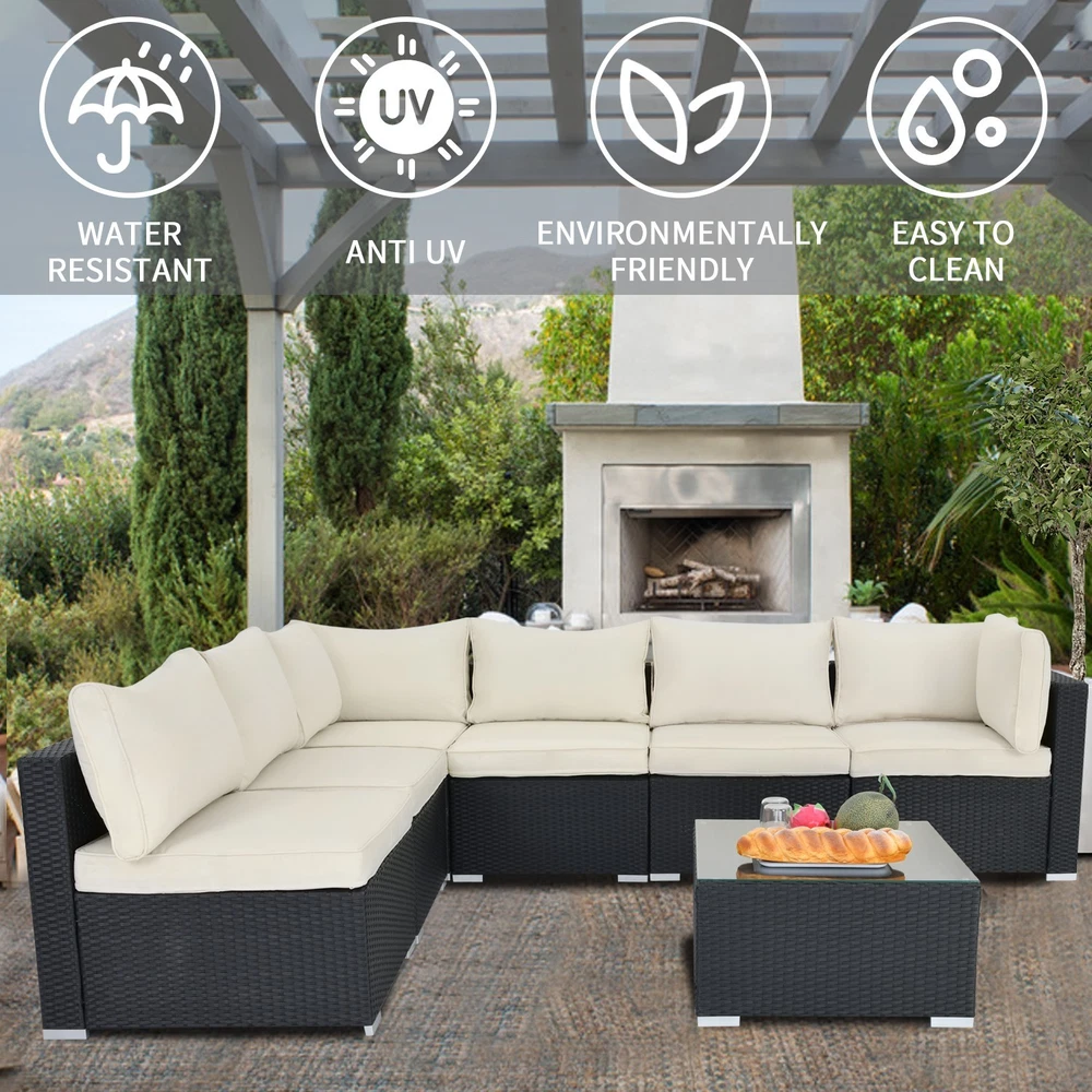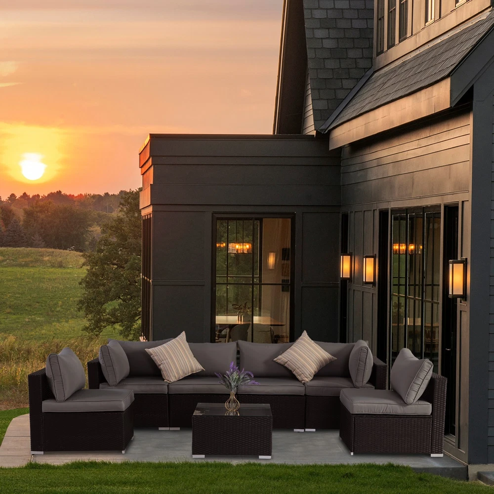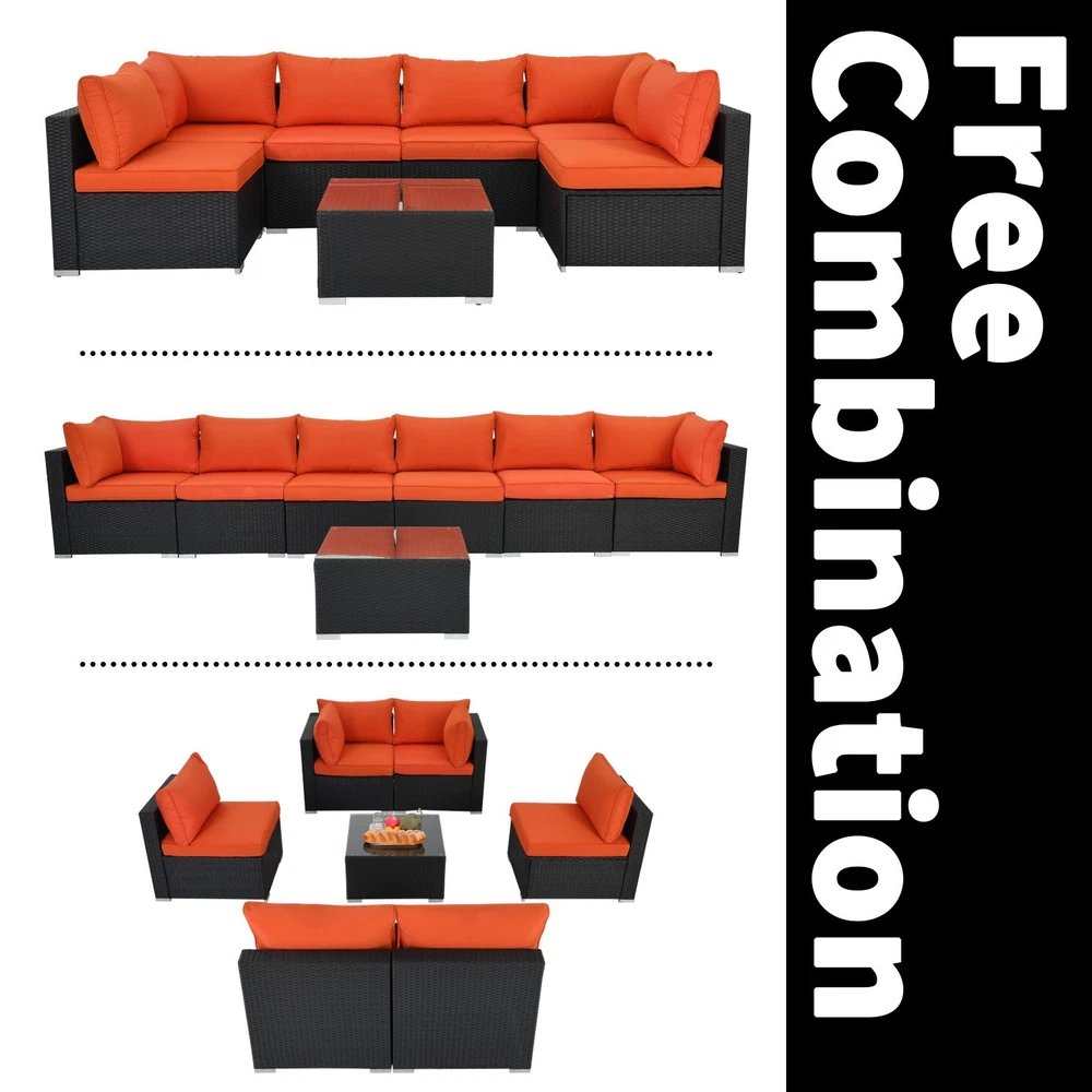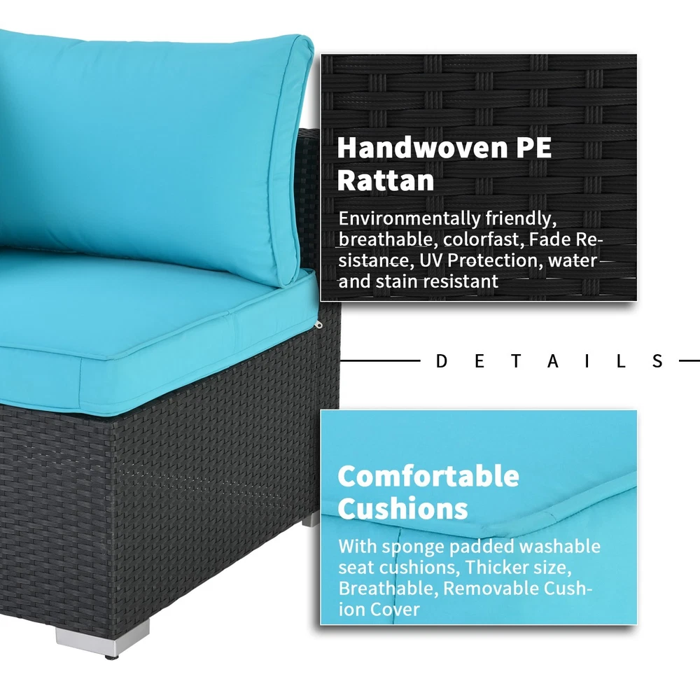 Durable All-Weather Patio Sectional Fureniture Set: This outdoor patio sectional combines hand-woven rattan outdoor furniture with a rust-resistant steel frame for a wicker patio furniture set built to last. Perfect for year-round use, this outdoor sectional furniture withstands sun, rain, and wind without fading, cracking, or sagging Thick Cushions & 2 Extra Pillows for Comfort: Our outdoor sectional includes plush 4" water-resistant cushions plus 2 extra pillows for added back support and style. The removable, washable covers make it easy to maintain your patio sofa, while the fade- and stain-resistant fabric ensures this wicker outdoor furniture always looks fresh Modular Layout for Any Outdoor Space: This outdoor sectional couch can be arranged into a U-shape, L-shape, or linear design to fit patios, decks, balconies, or poolside areas. Connector clips keep each piece of the patio sectional furniture set in place, giving your patio conversation set a clean, polished look Easy Assembly & Versatile Use: Your patio couch set arrive with all hardware, tools, and clear instructions for quick assembly. Whether you need backyard furniture, deck furniture, or a patio couch set, this outdoor sectional sofa adapts to any outdoor living area Stylish Coffee Table for Outdoor Entertaining: The matching wicker coffee table with a tempered glass top completes your patio furniture sectional. It’s perfect for drinks, snacks, or décor, making this outdoor patio set ideal for gatherings, relaxing, and enjoying your back yard furniture set in style