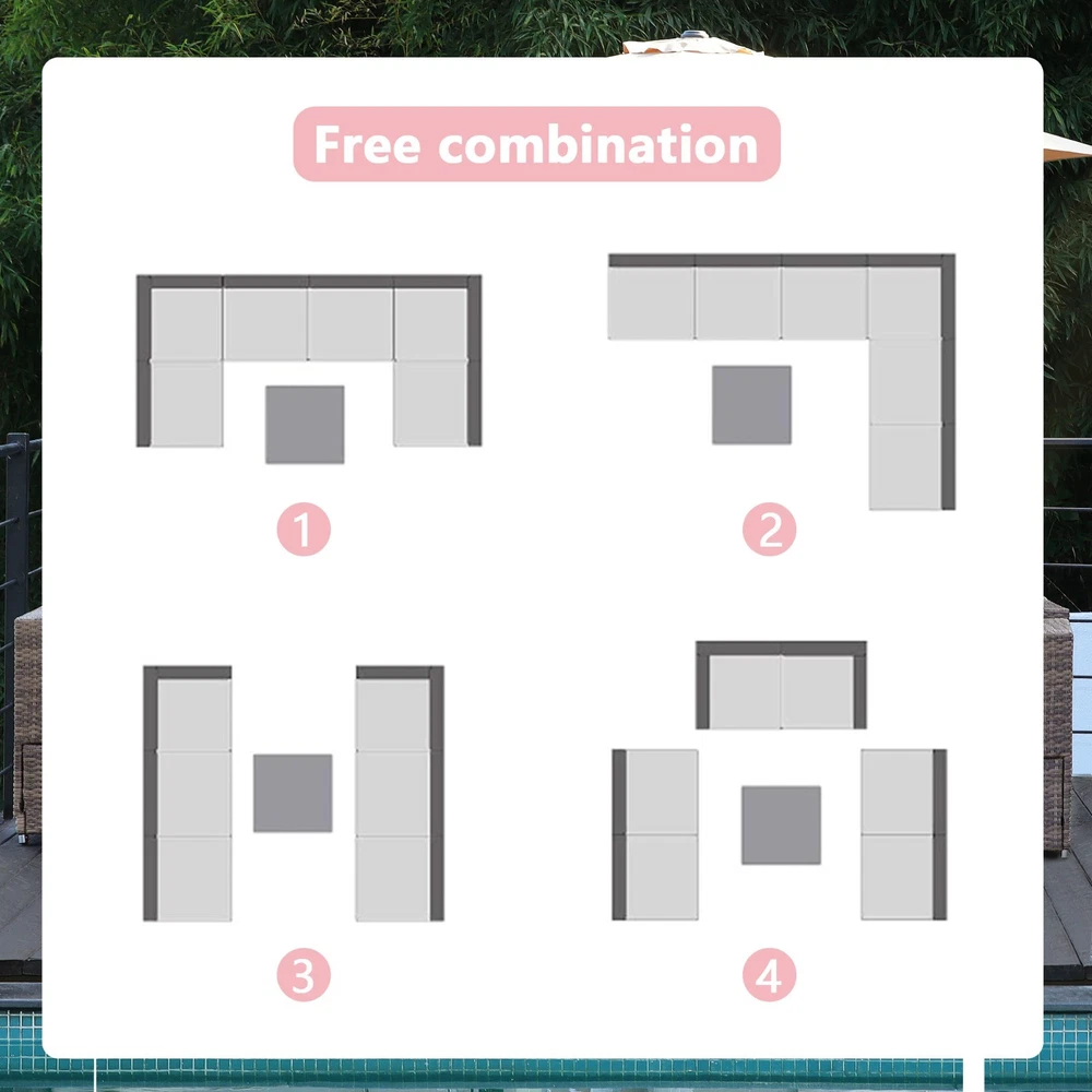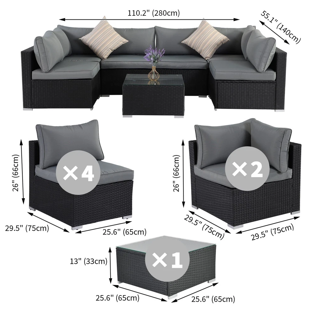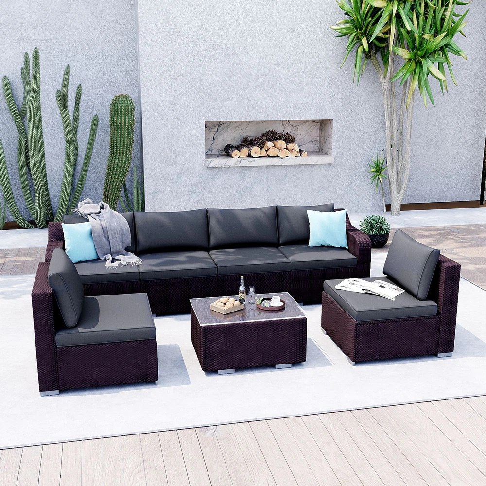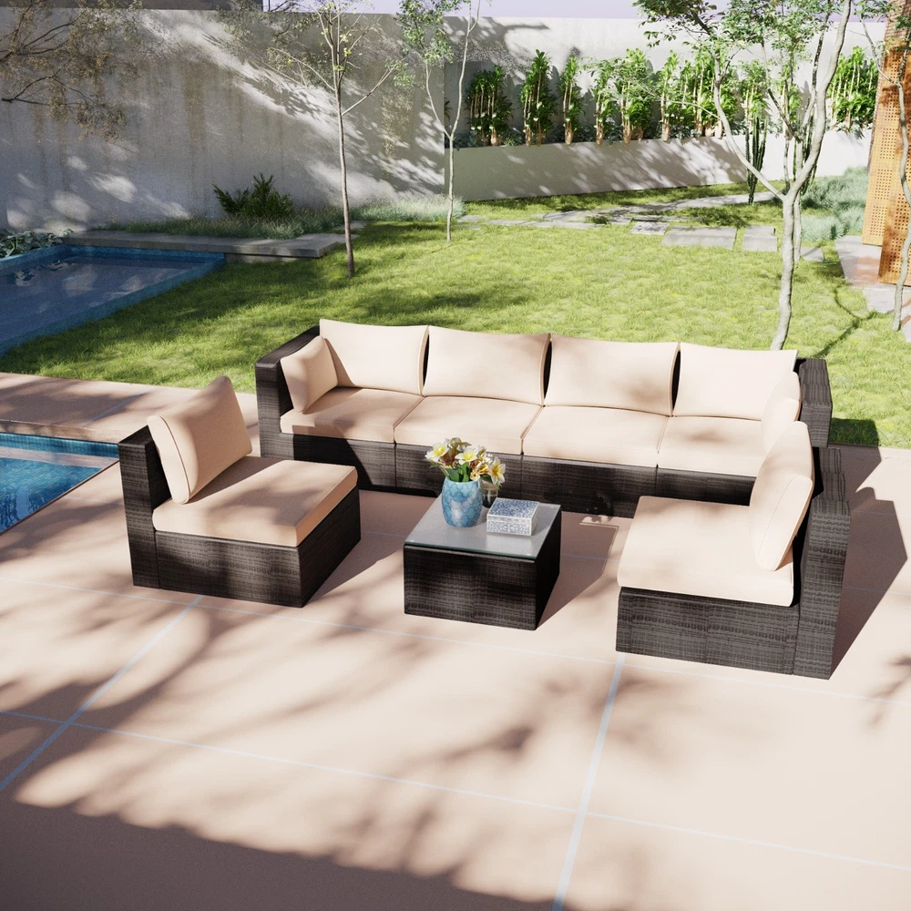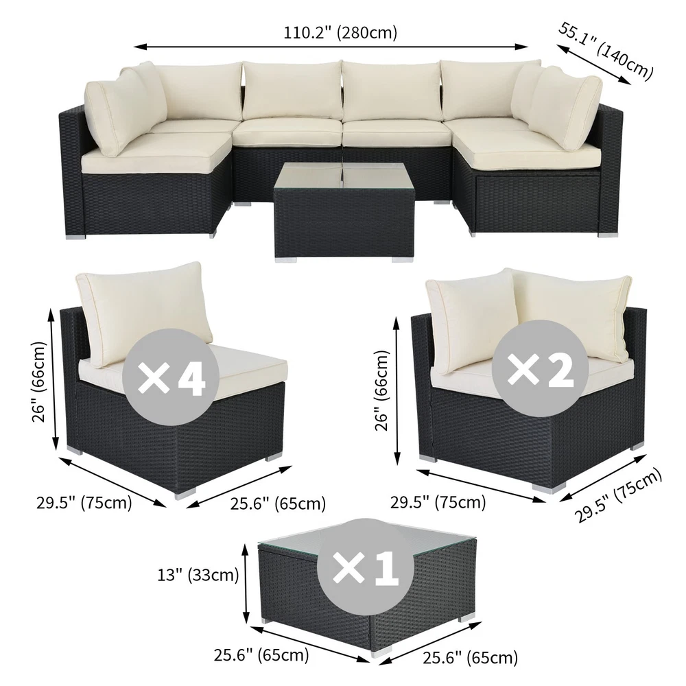 Durable All-Weather Patio Sectional Fureniture Set: This outdoor patio sectional combines hand-woven rattan outdoor furniture with a rust-resistant steel frame for a wicker patio furniture set built to last. Perfect for year-round use, this outdoor sectional furniture withstands sun, rain, and wind without fading, cracking, or sagging Thick Cushions & 2 Extra Pillows for Comfort: Our outdoor sectional includes plush 4" water-resistant cushions plus 2 extra pillows for added back support and style. The removable, washable covers make it easy to maintain your patio sofa, while the fade- and stain-resistant fabric ensures this wicker outdoor furniture always looks fresh Modular Layout for Any Outdoor Space: This outdoor sectional couch can be arranged into a U-shape, L-shape, or linear design to fit patios, decks, balconies, or poolside areas. Connector clips keep each piece of the patio sectional furniture set in place, giving your patio conversation set a clean, polished look Easy Assembly & Versatile Use: Your patio couch set arrive with all hardware, tools, and clear instructions for quick assembly. Whether you need backyard furniture, deck furniture, or a patio couch set, this outdoor sectional sofa adapts to any outdoor living area Stylish Coffee Table for Outdoor Entertaining: The matching wicker coffee table with a tempered glass top completes your patio furniture sectional. It’s perfect for drinks, snacks, or décor, making this outdoor patio set ideal for gatherings, relaxing, and enjoying your back yard furniture set in style