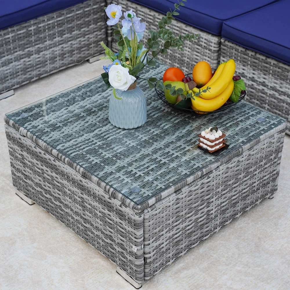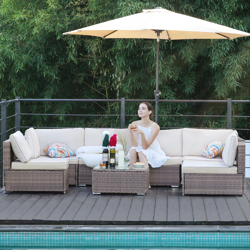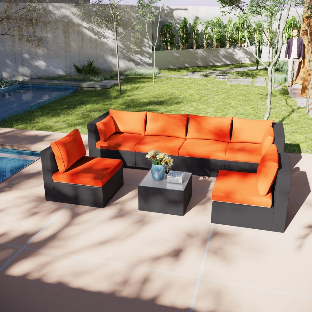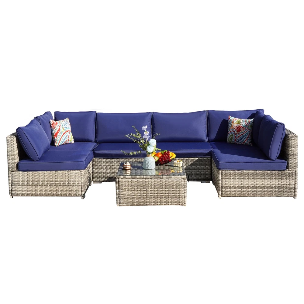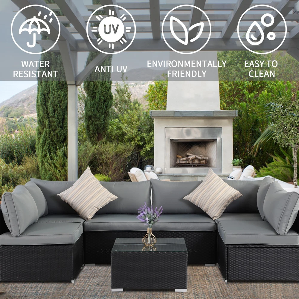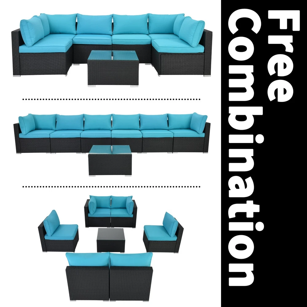 Durable All-Weather Patio Sectional Fureniture Set: This outdoor patio sectional combines hand-woven rattan outdoor furniture with a rust-resistant steel frame for a wicker patio furniture set built to last. Perfect for year-round use, this outdoor sectional furniture withstands sun, rain, and wind without fading, cracking, or sagging Thick Cushions & 2 Extra Pillows for Comfort: Our outdoor sectional includes plush 4" water-resistant cushions plus 2 extra pillows for added back support and style. The removable, washable covers make it easy to maintain your patio sofa, while the fade- and stain-resistant fabric ensures this wicker outdoor furniture always looks fresh Modular Layout for Any Outdoor Space: This outdoor sectional couch can be arranged into a U-shape, L-shape, or linear design to fit patios, decks, balconies, or poolside areas. Connector clips keep each piece of the patio sectional furniture set in place, giving your patio conversation set a clean, polished look Easy Assembly & Versatile Use: Your patio couch set arrive with all hardware, tools, and clear instructions for quick assembly. Whether you need backyard furniture, deck furniture, or a patio couch set, this outdoor sectional sofa adapts to any outdoor living area Stylish Coffee Table for Outdoor Entertaining: The matching wicker coffee table with a tempered glass top completes your patio furniture sectional. It’s perfect for drinks, snacks, or décor, making this outdoor patio set ideal for gatherings, relaxing, and enjoying your back yard furniture set in style