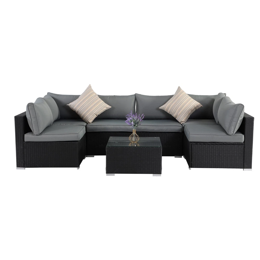 Type: Sofa Set Brand: Naga Bahna Set Includes: Back Cushion, Chairs, Seat Cushion/Pad, Table, Cushions Department: Adults Number of Items in Set: Seven-Piece Cushions Included: Yes Table Shape: Rectangle Style: Modern Material: Rattan, Steel, Wicker, Metal Assembly Required: Yes