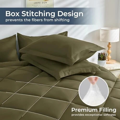 Color: Olive Green Item Weight: 8.68 pounds UPC: Does Not Apply Material: Microfiber Size: Queen Product Care Instructions: Machine Wash Theme: Classic Pattern: Solid Country of Origin: China Seasons: All, Winter, Fall, Spring Brand: Does Not Apply Included Components: 1 Comforter (88" x 88"), 1 Fitted Sheet (60" x 80" + 14" deep), 1 Style: Modern Date First Available: November 8, 2023 Package Dimensions: 15.75 x 11.5 x 5 inches Manufacturer: Does Not Apply Type: Does Not Apply EAN: Does Not Apply Fabric Type: 100% Polyester MPN: Does Not Apply Item model number: Box stitch comforter set 07 Item Height: 5 Number of Pieces: 7 gtin13: Does Not Apply Item Width: 11.5 Item Length: 15.75