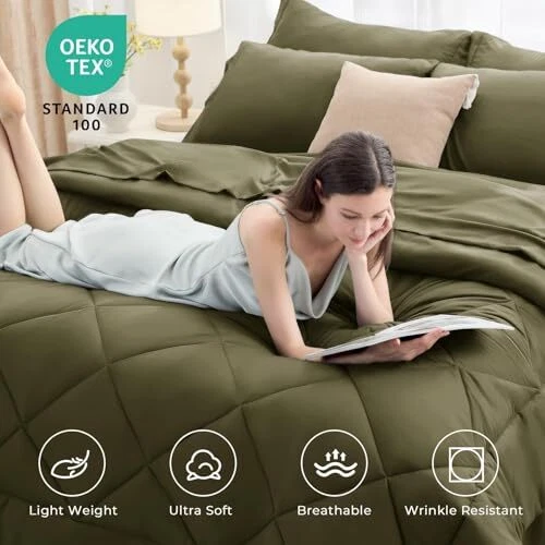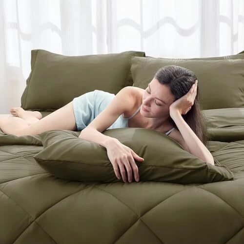 7 Pieces Comforter Set, All Season Reversible Bed in a Bag Queen Olive Green