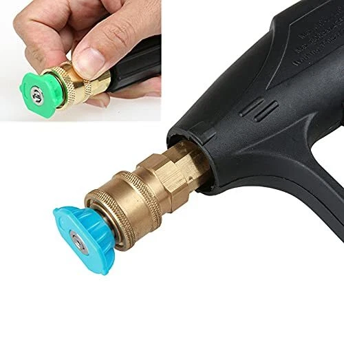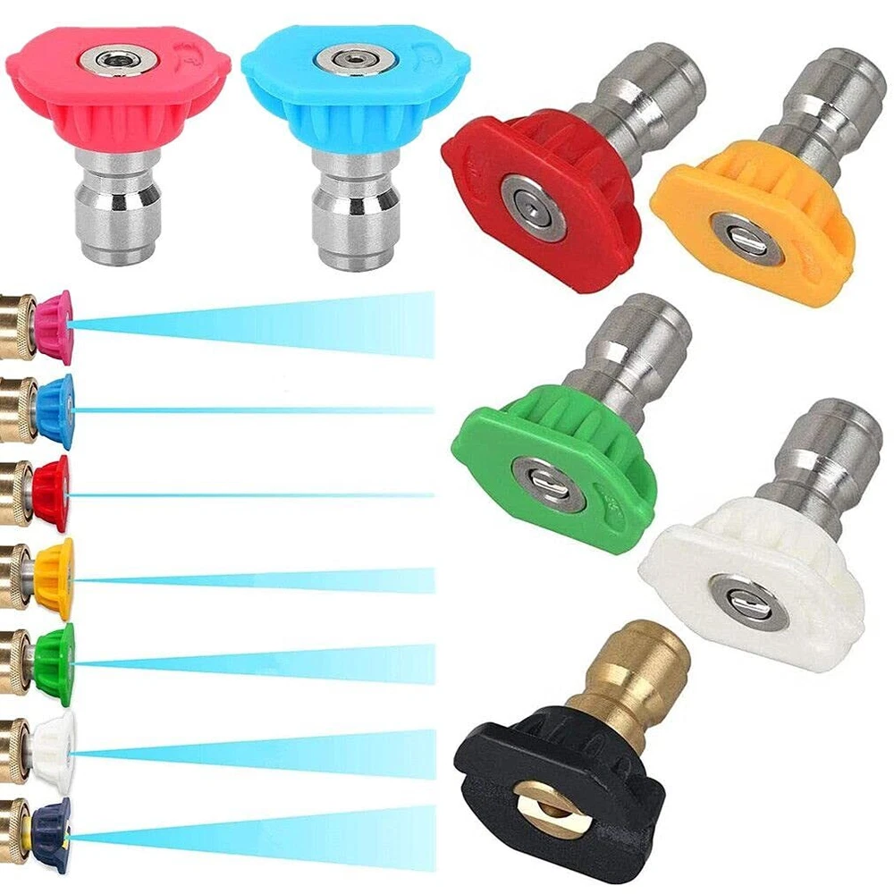 Pressure washer tips set is easy to set up. had all the different pressure washer nozzles, easy to remove And replace from washer nozzles. 7 Pieces Set - 7 Different Spray Angle Modes, includes 4pcs high pressure stainless steel quick connect spray nozzles, Red nozzle tip 0°, Yellow nozzle tip 15°, Green nozzle tip 25°, White nozzle tip 40°, and 1pcs Black Brass nozzle tip 65°, and 2pcs jet stream tips (Blue tip for rinse mode, Pink tip for soap mode) 7 Different Nozzles angle tip Choose different angles spray nozzle according to the actual need, such as watering flowers and plants, washing car, washing fence and cleaning sidewalk, and can be attached to a quick-connect wand for swifter application and more Universal pressure washer accessories fit for most leading brands such as Sun Joe, AR Blue, Simpson, Greenworks and more. Each easy fitting nozzle tip is designed for usage on a different outdoor surface Pressure washer tips set is easy to set up. had all the different pressure washer nozzles, easy to remove And replace from washer nozzles Attached to a 1/4 inch Quick-Connect Wand Perfect for almost all brand of pressure washers up to 4000psi Make sure working pressure of your pressure washer is higher than 1720 psi while using two jet stream tips(blue and pink tips). The higher pressure you have, the further water will reach to clean.