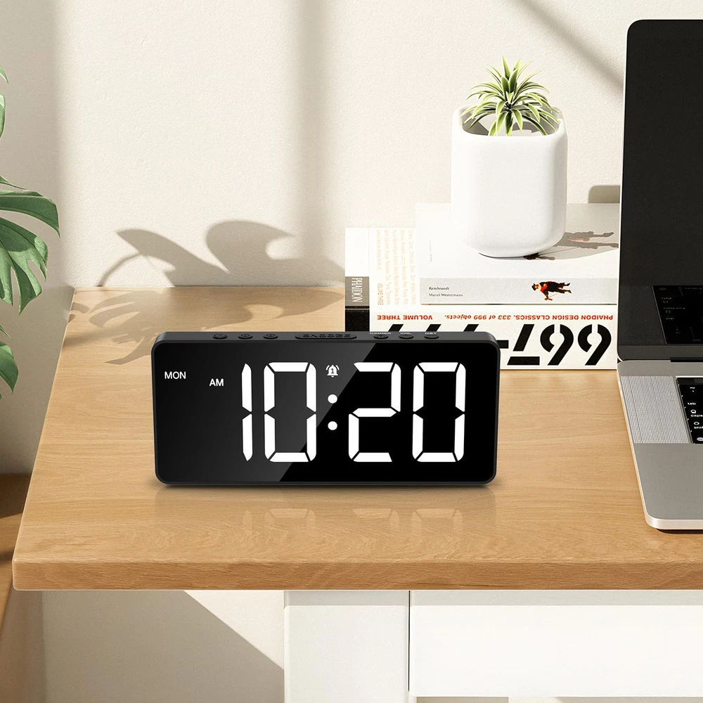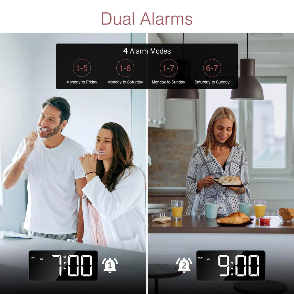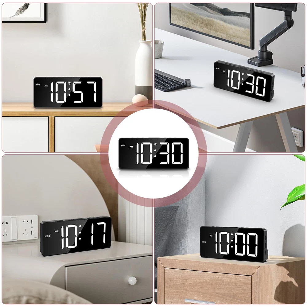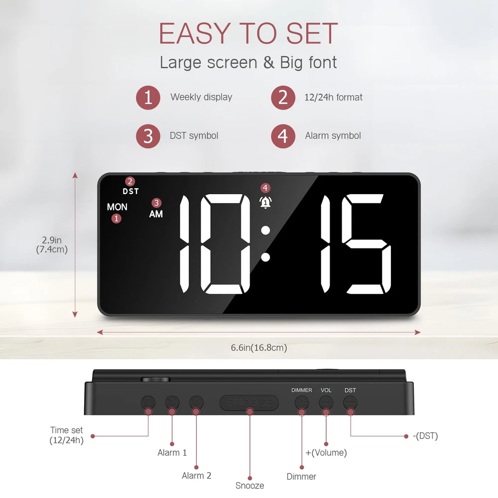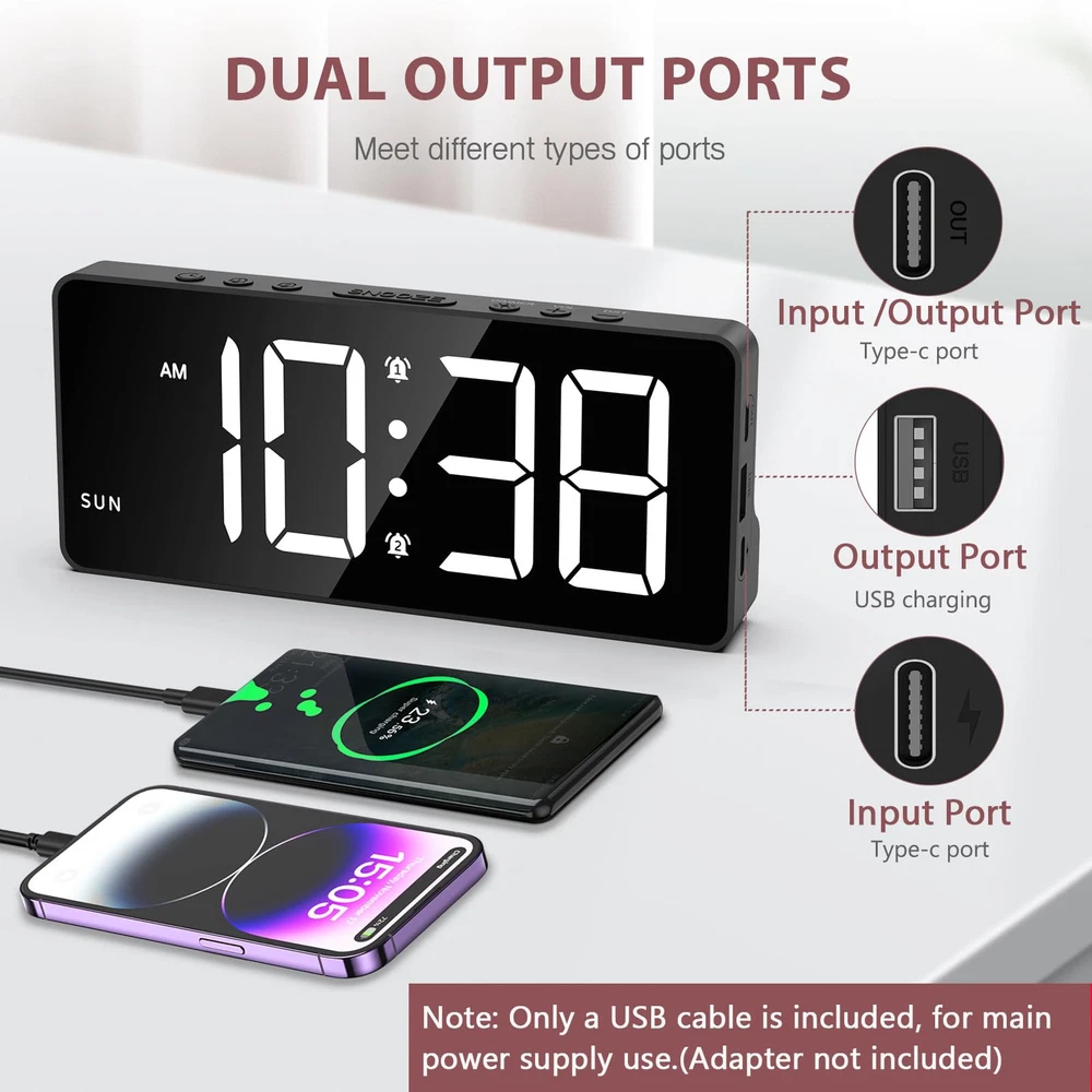 【Large LED Screen & Multifunctional Display】This digital alarm clock uses a 7-inch LED display and supports displaying time and day of the week on the same screen. You can also set the date, 12/24H format and DST. 【Dual Alarms & Adjustable Volume】It has 2 sets of independent alarms, 4 alarm modes: MON-FRI/MON-SAT/MON-SUN/SAT-SUN. The default snooze time is 9 minutes, and the alarm has 3 levels of volume that can be adjusted. This large display alarm clock is great for seniors and deep sleepers. 【Adjustable Brightness & Power Saving Mode】5 levels of brightness adjustable: 100%-60%-30%-3%-0%. In power saving mode (only when powered by batteries), the colon between the clock minutes will not flash, and the screen will turn off after 10 seconds of no operation. 【2 Power Supply Methods & Dual Port】Comes with Type-C charging cable(Adapter is not included) for long-term use(main power supply). In normal use process of the product, USB port allows you to charge (slow charging) or power external devices such as phones. It can also be powered by 3*AAA battery. BUT PLS NOTE: The screen only stays on by plugged in, If you use the batteries the light won't stay on all the time. 【Night Mode】The LED alarm clock also allows you to set night mode if needed. Hold and press the DIMMER button for 3 seconds, the moon symbol will appear on the screen, the night mode is activated. The backlight brightness would be dimmed automatically during PM7:00 to AM7:00.
