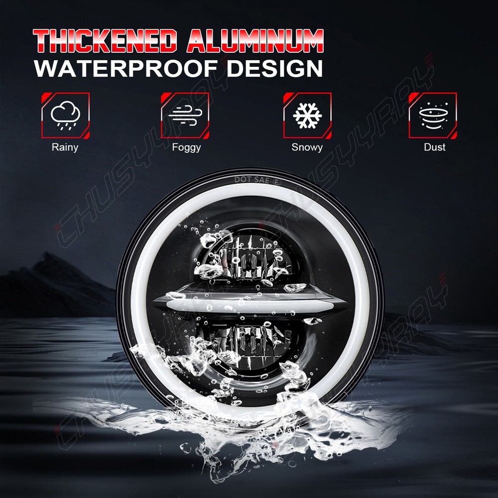 Note: 1. Please check the size of your bulbs on your vehicle before purchasing. 2. Please make sure the headlight housing has enough space for installation before purchasing. 3. Professional installation is highly recommended. If you have any questions, please feel free to contact us. Features - Provides a brighter, crisper and whiter light output, closer to the color temperature of daylight, dramatically improving light projection distance and overall visibility - Metalized reflector optics provide a lighting experience that smooth and clean across the driving surface,polycarbonate lens offer optimum protection against damage from impact, roadside debris and other hazards - 5 year warranty,100% High-Performance LED lamps,Black durable aluminum housing,shock-proof waterproof(IP67),More than 80,000 hour lifespan. - Plug & Play & H4/H13 Adapter, built-in LED Canbus. Requiring no modifications. Installation takes only few minutes. - Waterproof,shake-proof, rust-proof, and anti-explosion. Package Contents: 2x 7-inch round LED headlight (with 2*adapter cable) Product Description This is the newest upgrade to the 2025 model 7 inch LED headlamp! Has four light modes: - The halo can be white or amber. Amber for turn signals; white for DRLs. - High beam and low beam are white. Faster on/off response times and visible warnings for increased safety. Weatherproof, low power consumption and long life. Our LED light polycarbonate lenses provide optimal protection from impact and roadside debris. The 100% high performance LED lights are housed in a durable black aluminium casing that is not only shockproof and waterproof, but also energy efficient and environmentally friendly. EASY INSTALLATION - Plug and play design allows you to easily upgrade your lights without complicated steps. Whether you're driving in the city or on an off-road adventure, this LED light will help keep you safe on the road. Note: 1. Please confirm whether it is suitable for your vehicle before purchasing. 2. Please allow for slight differences in manual measurements. 3. Due to different display methods and different lighting, the picture may be slightly different from the real thing. 4. Product details may vary slightly due to different production batches. If you mind the price difference, buy with caution. Thank you for your understanding. 5. If you have any questions about the product, please contact us.
