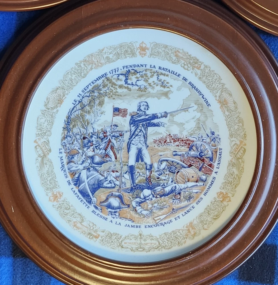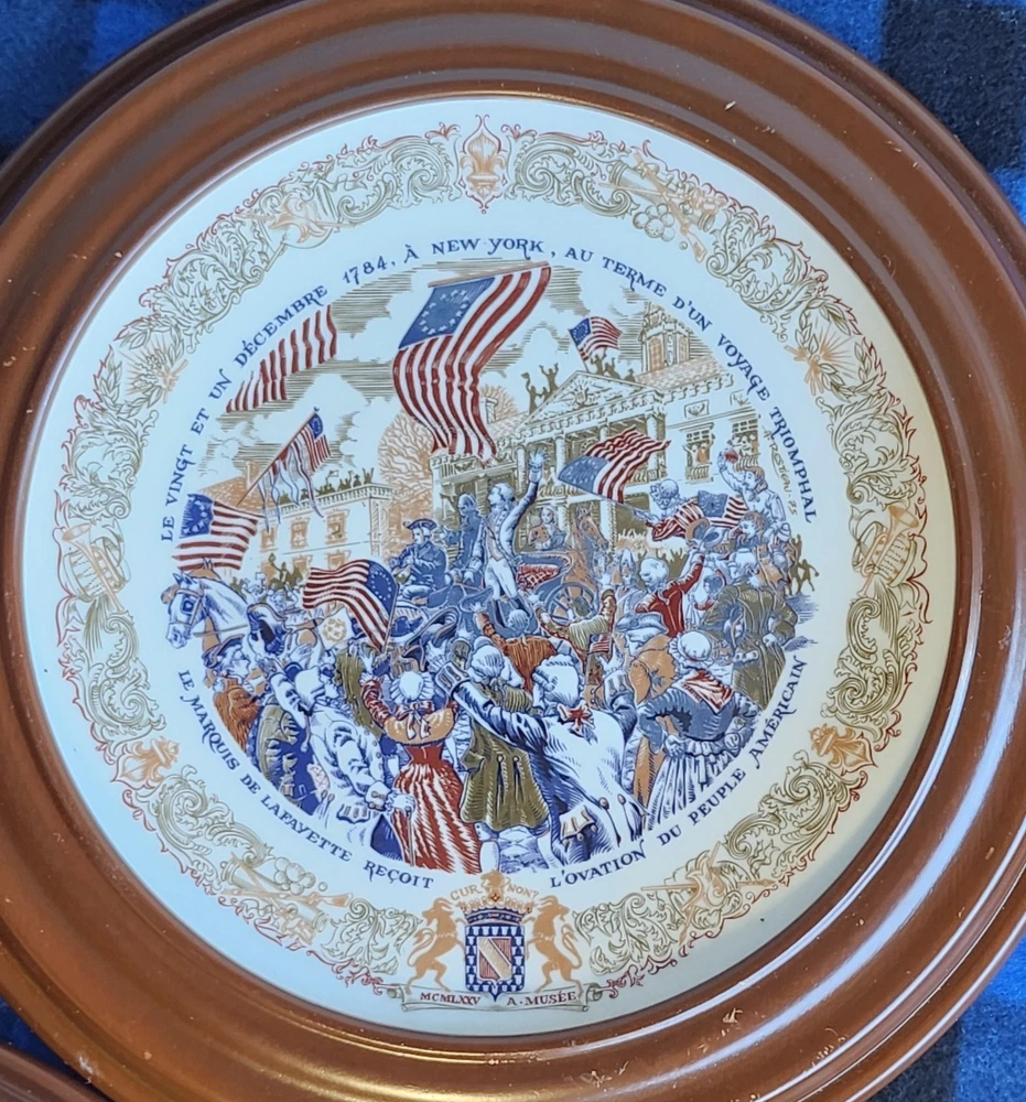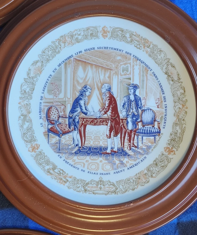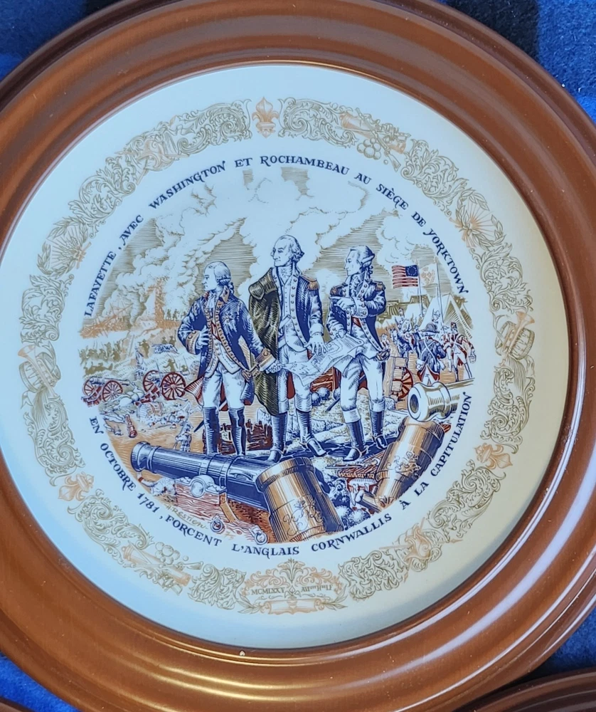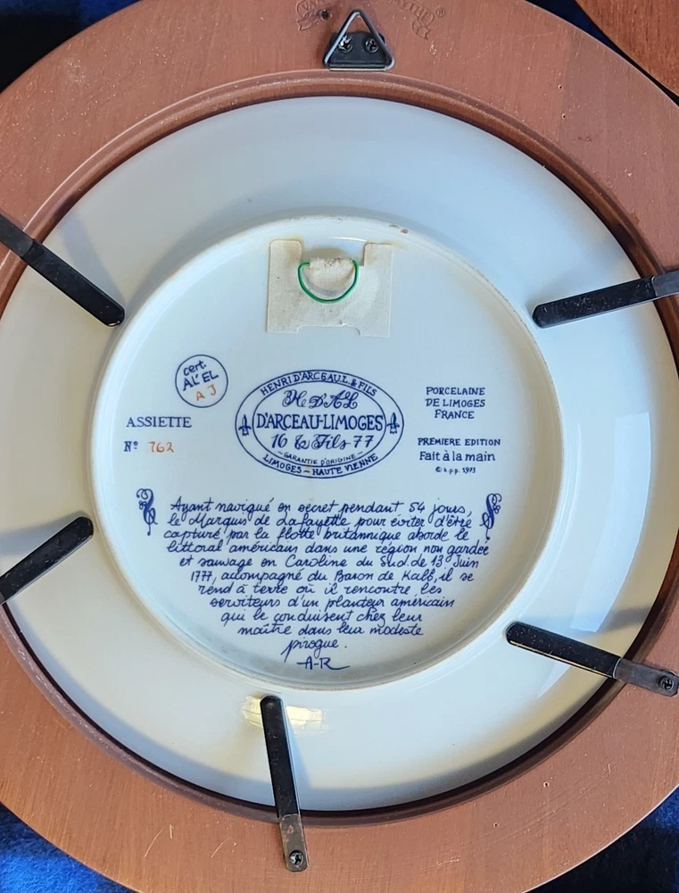 This is a set of 7 D'Arceau-Limoges porcelain plates commemorating the American Revolution. The plates are part of a series created by the Lafayette Museum in 1977. All are certified Premiere Editio, made in France. Each plates come with wall mounts.