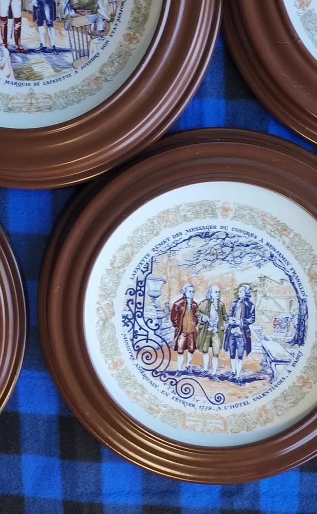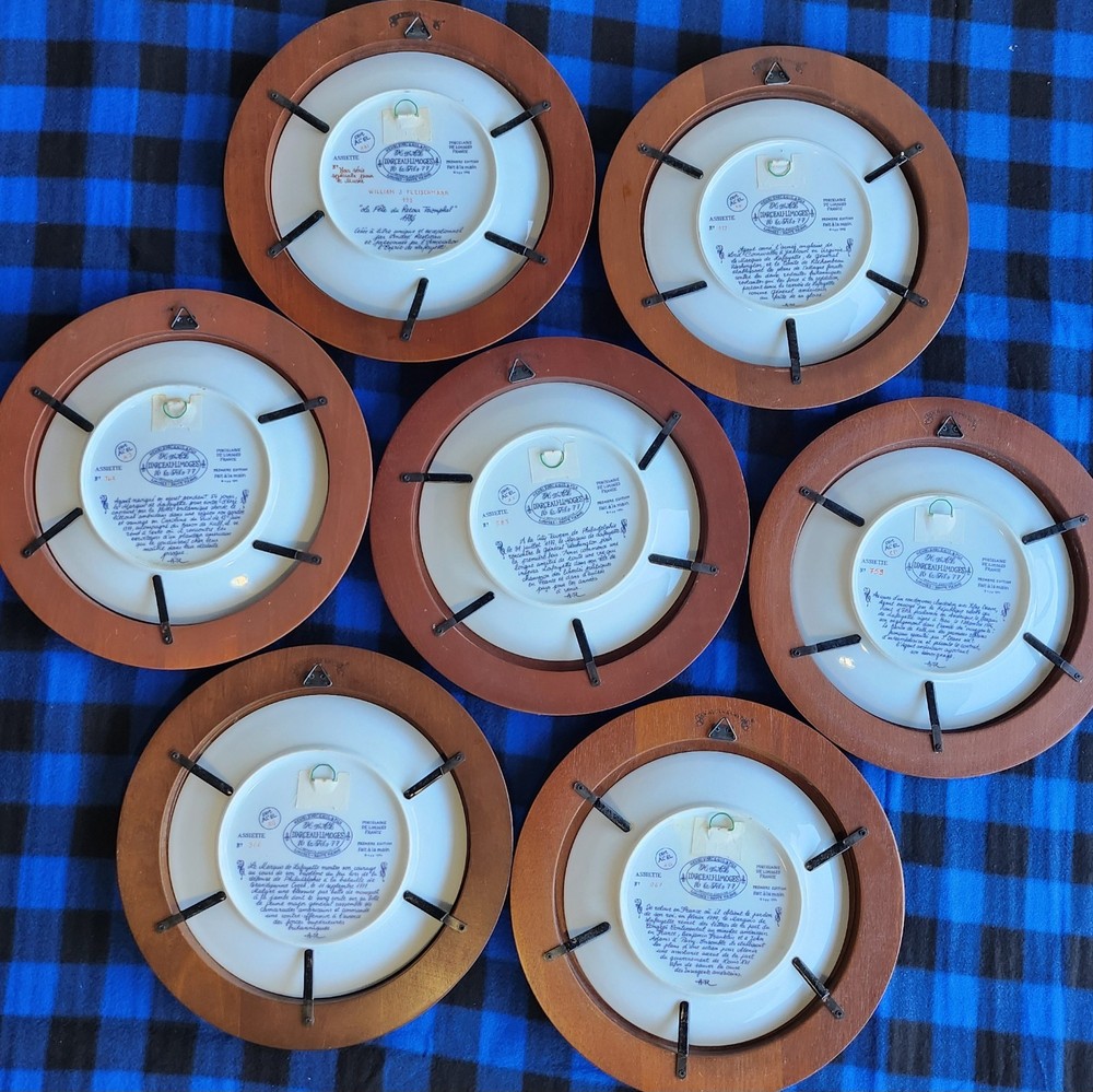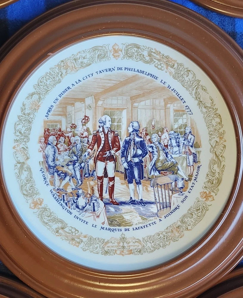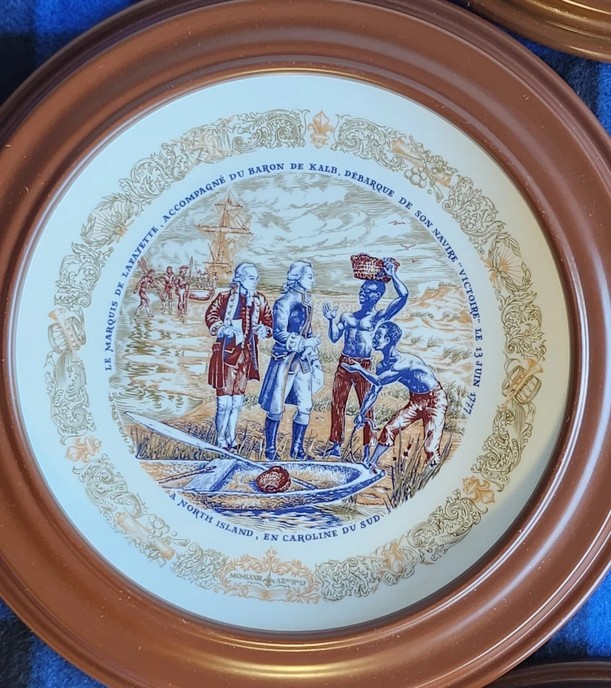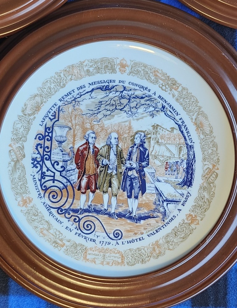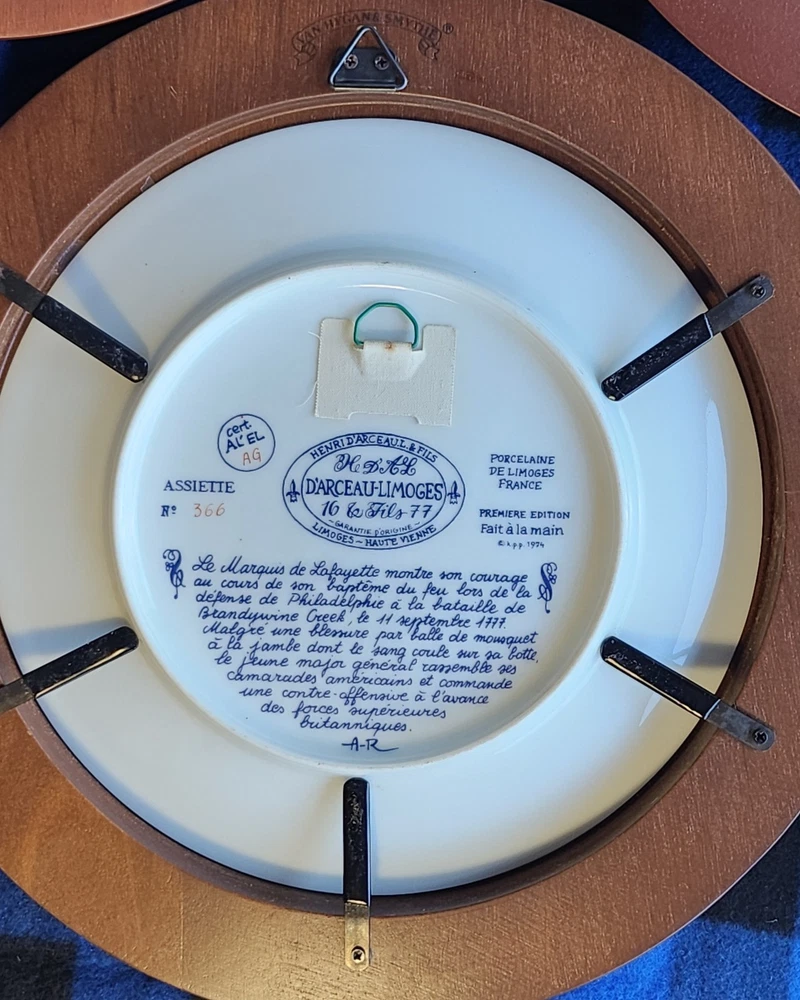This is a set of 7 D'Arceau-Limoges porcelain plates commemorating the American Revolution. The plates are part of a series created by the Lafayette Museum in 1977. All are certified Premiere Editio, made in France. Each plates come with wall mounts.