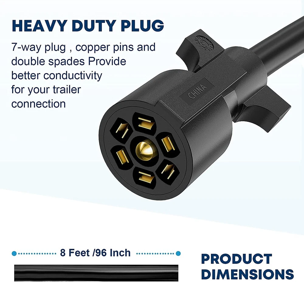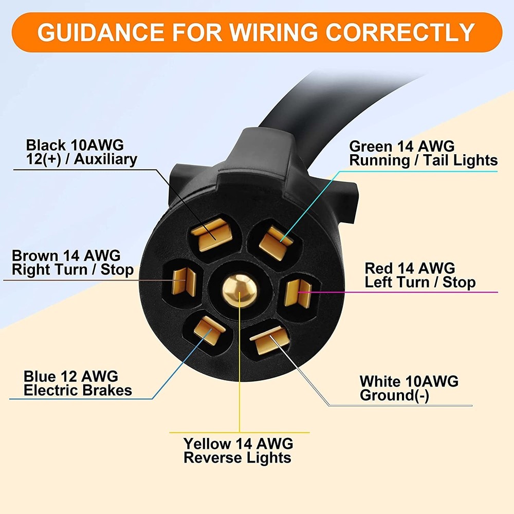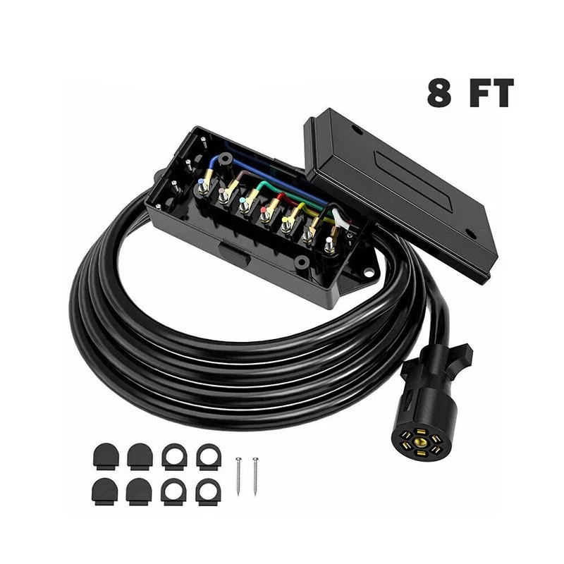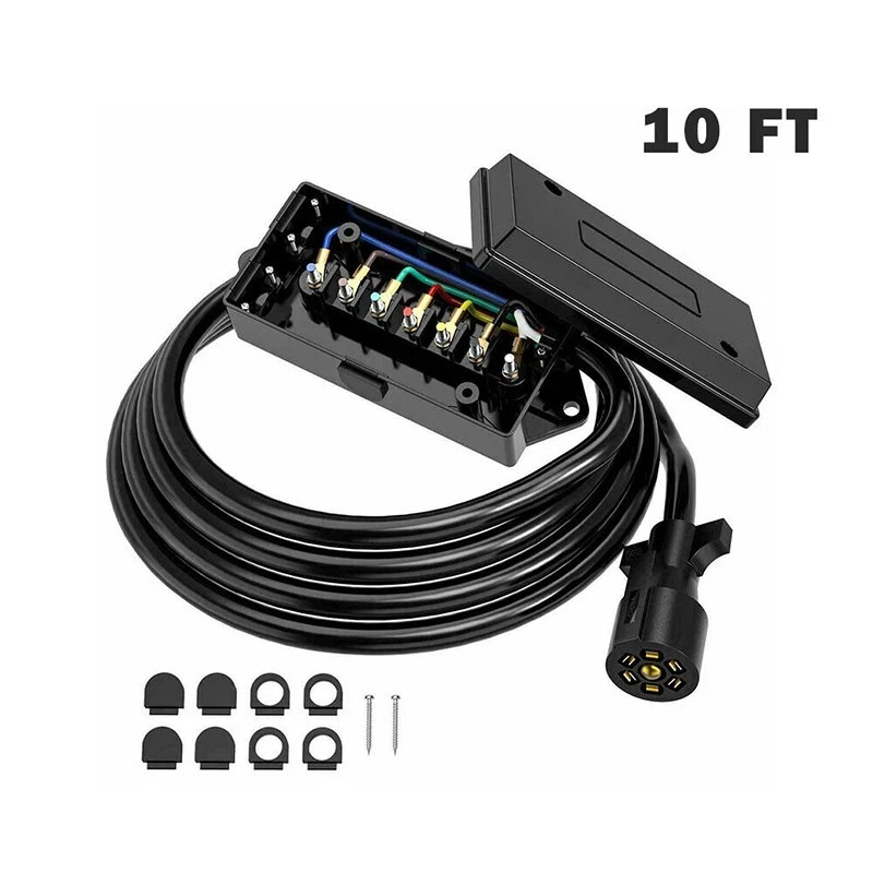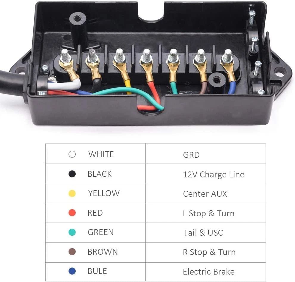 Features: PRACTICAL TRAILER CORD SET: This set includes a 7-way trailer cord with junction box- for your trailer wiring, for safer towing by connecting your vehicle to your trailer's breakaway battery and trailer brakes, and a plastic trailer plug holder that keeps the plug from dragging on the ground. CONVENIENT TRAILER WIRING: 7-way molded plug and pre-wired junction box makes it much easier for wire connections as well as keeping all your wires organized and protected, eliminates troublesome splicing, and simplify installation. DURABLE CONSTRUCTION: 100% copper wire ensures great conductivity, soft and rugged PVC material jacket providing flexibility in use. Weatherproof, moisture, abrasion, and corrosion-resistant. GOOD SEALING PERFORMANCE: ABS housing junction box coupled with rubber grommets providing superb protection against rough weather condition. WIRING INSTRUCTIONS: The color of the wiring may not match the color of your trailer, please compare the wiring diagram in the picture or manual. 7 Pole junction Box: wired with color marked 7-poles that can be easily identified. BROWN: 14AWG Right Turn& Brake, BLACK: 10AWG 12V Battery Power, GREEN: 14AWG Tail & Running Lights, RED: 14AWG Left Turn & Brake, WHITE: 10AWG Ground, BLUE: 12AWG Brake Controller Output, YELLOW: 14AWG Reverse Lights Weatherproof, heavy-duty plastic junction box protects wires and terminals from the elements. Notice: In case the item is defective, please inform us within 15 days of receipt, we will arrange reship or refund. Buyers have to pay for the return cost and we will pay the cost for resend. If you are unsatisfied with our item or service, please contact us before leaving any feedback. We are committed to resolve all issues in a friendly and satisfactory manner. We always reply to messages within 2 business days (off-duty at weekend).If you do not get a response from us, then please check your junk or spam mailbox.