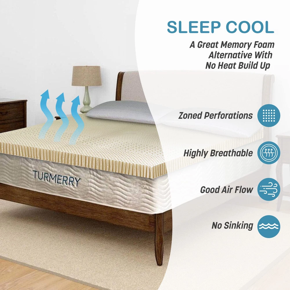 Sleep happy and in bliss and with full of dreams on this award winning deluxe mattress topper. 2 inch mattress topper and 3in foam mattress topper options available. The popular options in our natural latex mattress topper are twin mattress topper, foam toppers full, queen mattress topper, and latex mattress topper king. Make mattress firmer by adding 2 inch firm mattress topper or 3 inch firm latex mattress topper. Soften your mattress by adding a soft latex mattress topper. Our organic latex mattress topper thin and thick versions work well for all kind of sleepers including side, back and stomach sleepers. No sagging, sink or dip in the middle. The latex foam is not Talalay latex mattress topper but Dunlop which is a huge plus for many who suffer from achy bones. Great for active adults. Toppers adapt to your body contour. Can be used in campers for camping. Check our other listings for egg crate toppers. You can also cut it with a serrated knife for custom sized beds and for bunk beds, couch and futon and for floor. Twin XL works great for college dorms. Plush yet supportive for your entire body, these toppers decompress your spine. made from organically grown rubber trees, this clean latexpad core relieves pressure points and maintain perfect temp. Great mattress replacement or alternative. Check out our hybrid mattress and other orthopedic latex mattress, fitted sheets and pillows listings. Multiple toppers can be bought and are stackable. Zip cotton cover is available in our other listings. Due to the high density, these toppers don't move while you sleep. Latex cushion foams are also available. Turmerry Latex Mattress Toppers are manufactured using the Dunlop process, which is the most energy-efficient method of creating natural latex foam. 7 Zone Design engineered for each part of your body Best Options List in the Market for Customized Support and Comfort No cover included - Optional Organic Cover Available and if purchased comes installed Sleep Cool - Perforated and Breathable Latex Topper