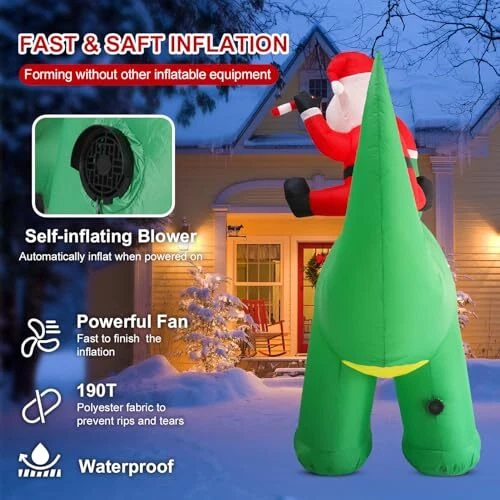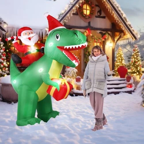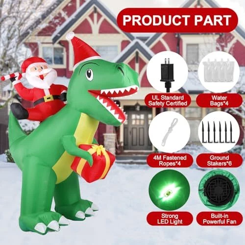30 Days Return Policy Fast Delivery Trusted seller 7 ft Christmas Inflatables Outdoor Decorations, Blow Up Dinosaur Christmas Santa Claus Inflatable with Built-in LEDs for Christmas Indoor Outdoor Yard Lawn Garden Decorations Product Description 【7 FT CHRISTMAS BLOW UP】 - Inflatable Outdoor Christmas Decoration with the bright built-in LEDs is the most ideal christmas blow up decoration for indoors and outdoors, creating a warm and happy atmosp for your yard and room. 【WATERPROOF & DURABLE】- This blow-up Christmas dinosaur outdoor decoration is made from high-quality polyester, ensuring durability and colorfastness. Crafted with tighter stitching, t’s no need to worry about it being torn by the wind or damaged by rain. Our holiday dinosaur inflatable is waterproof and can be displayed in wind, snow, and rain without concern. Its vibrant colors and sturdy material ensure it looks great year after year. 【FAST INFLATION】 - Our inflatable Christmas dinosaur ornament features a powerful built-in fan that allows it to fully inflate within 2-3 minutes once plugged in. With its lightweight materials and self-inflating design, anyone in the family can effortlessly set it up and take it down. Before inflating, ensure the zipper is fully closed to ensure proper sealing and optimal inflation. 【Eye Eye-Catching LED Light】- The built-in bright LED lights are perfect for a Christmas night party. It is certainly eye-catching around your neighbors and guests. The Christmas Decoration has eye-catching brightened LED lights that make it look perfect every Holiday night. The LED lights in the body give it a great night effect. 【SUPER STABLE SUPPORT】- Dinosaur blow-up Christmas decorations outdoor come with 6 ground stakes, 4 fastened ropes, 4 plastic bags, and a UL-approved plug to ensure safe use. "4 plastic bags" can be filled with water or sand and placed on inflatable bottom to add weight and make it more secure and stable in windy weather. No need to worry about our Christmas yard inflatables flying away by wind Shipping Returns Payment Shipping Shipping is FREE to all addresses other than APO/PO boxes in the lower 48 states. All our stock ships from US-based warehouses. Shipped via USPS or UPS (depending on location and package weight) Unless stated otherwise, all orders will ship within 24-72 hours of your payment being processed. Check our feedback to see the great reviews of FAST shipping we offer. Returns As our valued customer, we will do our best to make sure the product you receive arrives to you on time and as expected. If you are not satisfied with your purchase, please contact us within 30 days of receiving your order to process a return. Payment We currently accept payment via eBay managed payments only. Once payment is cleared, we will dispatch your shipment within 1-3 business days. Please refer to the "Shipping" tab for more information regarding shipping speed to your destination.