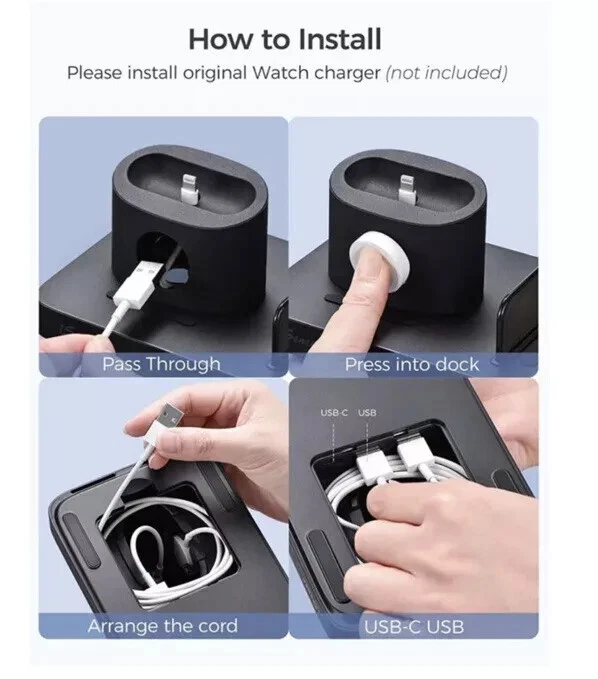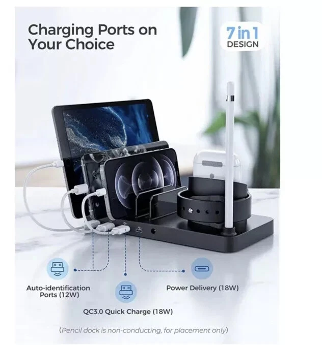 Charging Station, iSeneo Charging Station for Multiple Devices, 7-in-1 USB A and USB C Ports with 40.5W Adapter and AirPods Cable, Charge for iPhone iPad iWatch AirPods Tablets,Black ( NO Devices Cable) ** Specification: 1. A charging cable for AirPods is included in the package, which is already preinstalled. 2. Multifunctional combined charging stand, which provides fast charging for your multiple devices. 3. Package contains a 40.5W high-power adapter, no additional purchase is required, which is more convenient to use. 4. The output of USB-C PD port & QC3.0 USB ports reach 18 Watts, which support fast charging for your devices. ** Package Contents: • iSeneo multi-function charging station 140.5W integrated adapter • 1Charging cable for AirPods (preinstalled) • 1User Manual ** Note: 1. Charging cables for mobile phones, iPads, and iWatches are NOT included in the package, please apply the original device cables. 2. It is recommended to use the integrated adapter included in the package when charging. 3. The dock for Pencil is only for storage, the holder is non-conductive, does not provide charging.Outputs:USB-C PD Port: 9V/2A 12V/1.5A (18W in max)USB QC3.0 Port: 5V/3A 9V/2A 12V/1.5A (18W in max)USB AI Ports: 5V/2.4A (12W in max) ** One Station for All Devices: 7-in-1 design for placement, 6 power transmission ports recharge for AirPods, iWatches, smartphones, and iPads simultaneously. The Pencil dock is for storage only, not for charging.
