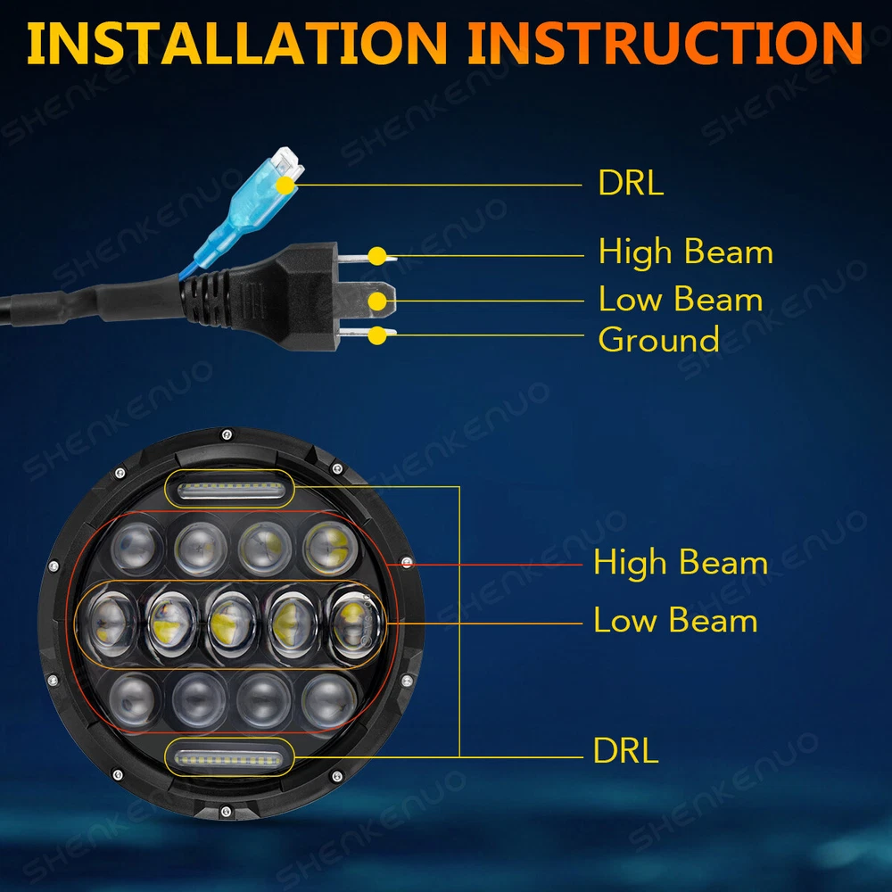 Item Description 。 Package included: 2PCS 7 inch Round LED Headlights 2PCS H4-H13 9008 Adapter Wires (Installation instruction is NOT included) Note: Without mounting bracket, some models may need mounting bracket! Specification: Power: 75W/Pcs 150W/Pair Dimension: 7" Inch Round Input: 12-24V DC Operating Voltage: 9-30V DC Material: Aluminum Lens Pattern:High & Low Beam & Day time running light Color Temperature: 6000K Cool White Housing Color: Black Waterproof:IP68 Connector: H4/H13 (Ground and High Beam) Function: High Beam,Low Beam, DRL (Day time running light) Features: 1.7 inch led headlights are made with real LED Chips, 100% brighter than other similar stock 7" headlight or halogen headlight 2. Waterproof IP67, DOT Approved, Built-in anti-flicker hardness, no need extra decoder anymore. Perfect sealed to prevent moisture and water build-up. 3. Quick and convenient installation, just plug and play. The headlight is durable, lifetime is over 50,000 hours. About the Adapter: Note:Package Do not Include the adapter. They might be slight flickering cuz the voltage instability characteristics of For JEEP WRANGLER rather than headlights themselves. You couldn't notice the original halogen headlight flickers because of luminance not strong enough. Be aware of that,Plug the headlight first, if the headlights are not flickering, just keep the adapter away. (Including but not limit the following applications) Application: For Alfa Romeo Spider (1988-1994) For AM General Hummer (1992-2001) For American Motors AMX (1968-1978) For American Motors Gremlin (1970-1978) For American Motors Hornet (1970-1977) For American Motors Javelin (1968-1974) For American Motors Matador (1974-1978) For American Motors Pacer (1975-1980) For Bertone X 1/9 (1984-1989) For Chevy Blazer (1969-1974) For Chevy C10 (1975-1980) For Chevy C10 Pickup (1969-1974) For Chevy C10 Suburban (1969-1980) For Chevy C20 (1975-1980) For Chevy C20 Pickup (1969-1974) For Chevy C20 Suburban (1969-1980) For Chevy C30 (1975-1980) For Chevy C30 Pickup (1969-1974) For Chevy Camaro (1967-1981) For Chevy Chevelle (1971-1973) For Chevy Chevette (1976-1978) For Chevy El Camino (1971-1975) For Chevy G10 G20 G30 (1975-1987) For Chevy K10 K20 K30 K5 Blazer (1969-1980) For Chevy Laguna (1973-1975) For Chevy Lux (1980-1982) For Chevy Malibu (1973-1975) For Chevy Monte Carlo (1970-1975) For Chevy Monza (1975-1980) For Chevy Nova (1963-1978) For Chevy Pickup Truck (1967-1973) For Chevy Truck (1947-1957 and 1962-1972) For Chrysler (1949-1955) For Datsun 240Z 260Z 280Z 280ZX (1970-1978) For DeSoto (1949-1955) For Dodge (1949-1955) For Dodge B100 (1975-1978) For Dodge B100 Van (1971-1974) For Dodge B150 (1984-1987) For Dodge B200 (1975-1978) For Dodge B200 Van (1971-1974) For Dodge B250 (1984-1987) For Dodge B300 (1975-1978) For Dodge B300 Van (1971-1974) For Dodge B350 (1984-1987) For Ford Bronco (1966-1977) For Ford Custom 500 (1971/1976) For Ford E-100 Econoline (1969-1978) For Ford E-100 Econoline Club Wagon (1975-1978) For Ford E-150 Econoline (1969-1978) For Ford E-150 Econoline Club Wagon (1975-1978) For Ford F-100 (1975-1979) For Ford F-100 Pikcup (1969-1974) For Ford F-150 (1975-1979) For Ford F-250 (1975-1979) For Ford F-250 Pickup (1969-1974) For Ford F-350 (1975-1979) For Ford F-350 Pickup (1969-1974) For Ford Falcon Sedan Delivery (1961-1965) For Ford Mustang (1965-1973) For Freightliner Century Class (1996-2011) For Freightliner Coronado (2001-2016) For Honda Civic (1976-1981) For Hummer AM General 1992-2001 For Hummer H1 2002-2006 For Hummer H2 2003-2009 (H2 needs 9007 male to H4 female adapter, package not included) For International Harvester 4200 4300 4400 For Jeep Cj-5 1955-1983 For Jeep CJ-7 (1976-1986) For Jeep CJ-8 Scrambler (1981-1985) For Jeep Wrangler JK 2 Door (2007-2018) For Jeep Wrangler JK 4 Door Unlimited (2007-2018) For Jeep Wrangler LJ Unlimited (2004-2006) For Jeep Wrangler TJ (1997-2006) For Jeep Wrangler TJ Unlimited / LJ (2003-2006) For Kenworth T2000 (1998-2010) (Buyer Note, Our Headlight plug is H4,H4-H13) For Land Rover 90/110 1983 to 1991 (including 2.5N/A, 2.5 Turbo, V8) For Land Rover 90/110 Defender 200 Tdi For Land Rover 90/110 Defender 300 Tdi For Land Rover 90/110 Defender Td5 For Land Rover 90/110 Tdi For Land Rover Defender 90 & 110 For Land Rover Defender 90 1995 For Land Rover Defender 90 1997 For Land Rover Range Rover County Classic SportUtility 4-Door 1995 For Mack DM RM RW RS RL CF For Mazda 808 1976-1977 For Mazda Miata (1990-1997) For Mazda Miata MX5 MX-5 (1990-1997) For Mazda Mizer 1976-1977 For Mazda RX-7 1979-1985 For MG Midget (1969-1979) For Oldsmobile Omega (1974-1979) For Peterbilt 359 (1981-1987) For Peterbilt 379 (1988-2009) For Plymouth (1949-1955) For Plymouth Barracuda (1964-1974) For Plymouth Valiant (1963-1976) For Porsche 944 (1983-1991) For Toyota Corolla (1969-1980) For Toyota LandCruiser (1979-1987) For Toyota Pickup (1979-1981) Motorcycle Fitment: (Fits following motorcycle:) For Any Motorcycle models with 7 inch Round headlight,such as(Not limited): For Dyna SwitchbackFLD: 2014, 2016 For Softail Convertible CVO FLSTSE : 2010-2012 For Softail Cros Bones FLSTSB: 2008-2011 For Softail Deluxe CVO FLSTNSE: 2014-2015 For Softail Deluxe EFI FLSTNI FLSTN: 2005-2017 For Softail FatBoy : 2001-2017 For Softail Heritage Classic Springer Classic EFI FLSTI FLSTC FLSTS: 1991-2017 For Softail Nostalgia FLSTN : 1993-1996 For SoftailSlim FLS S FLSS: 2012-2017 For Touring Electra GlideClassic CVO FLHTCSE EFI FLHTCUIPolice FLHTP: 1994-2017 For Touring Road King Classic EFI FLHRCI Police CA FLHR: 1994-2017 For Touring Street Glide CVO FLHXSE EFI FLHXI FLHX: 2006-2017 For Touring Street Glide Special FLHXS: 2014-2017 For Touring Ultra Limited: 2010-2017 For Trike FreewheelerFLRT : 2015-2017 For Trike Street Glide FLHXXX: 2010-2011 For Trike TriGlide Ultra Classic FLHTCUTG : 2009-2017 For Yamaha Models For Yamaha Road Star 1600 1999-2003 For Yamaha Road Star 1600 Midnight 2000-2003 For Yamaha Road 