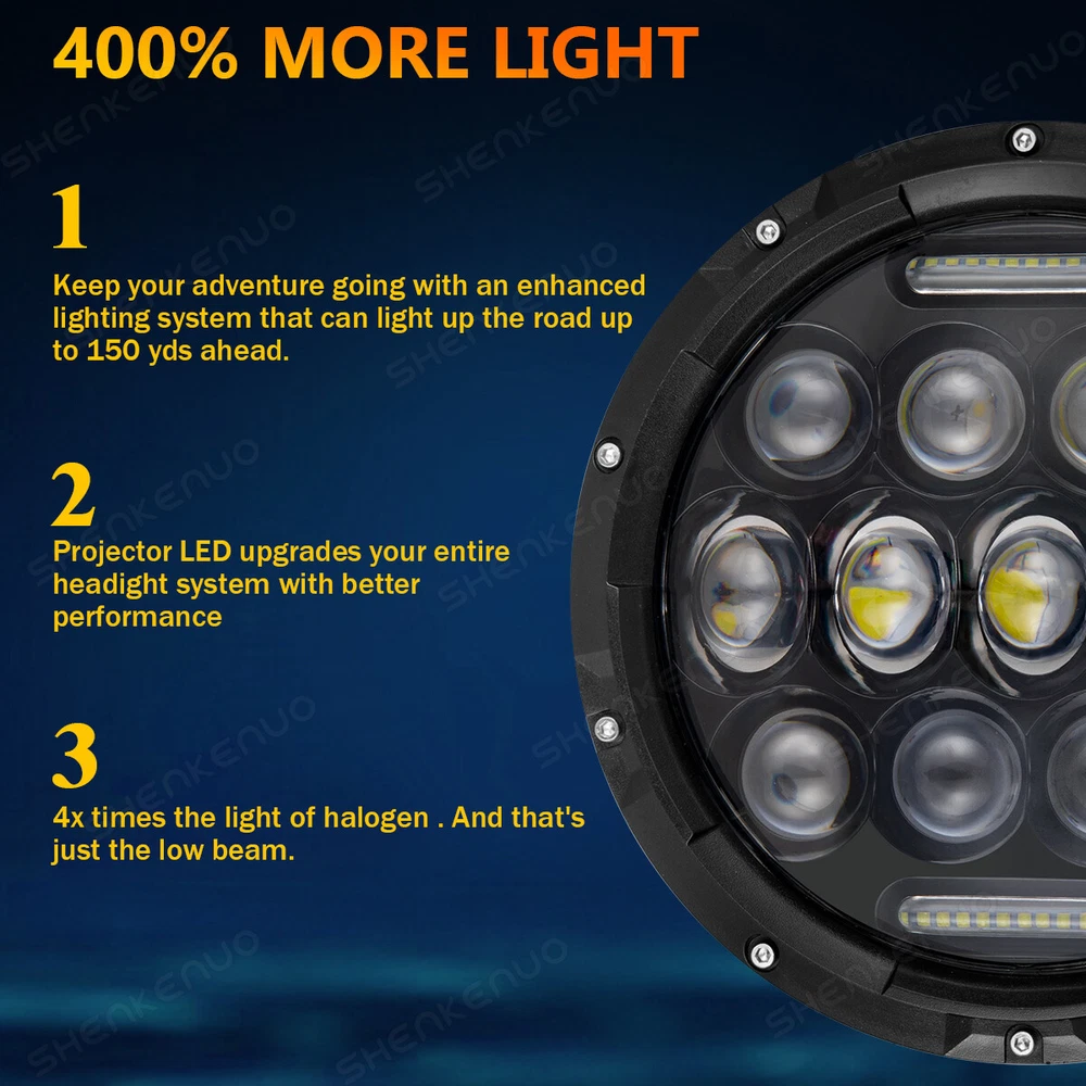 Car Light Bulb GJ Series Bulb HK Series Bulb BY Series Bulb C6 Series Bulb C9 Series Bulb S1 Series Bulb S2 Series Bulb F2 Series Bulb X7 4Side Series Bulb K9 4Side Series Bulb X15 4Side Series Bulb HID Series Bulb Other Type Bulb(Fog,DRL...etc) V5 4Side Series Bulb DF Series Bulb 6 Side Series Bulb Z4 Series Bulb LX Series Bulb DSX Series Bulb K9L 4Side Series Bulb LED Light Strip Work Light Bar Protection Sticker Car Interior/Exterior Trim Tool Promotion Other Item Description 。 Package included: 2PCS 7 inch Round LED Headlights 2PCS H4-H13 9008 Adapter Wires (Installation instruction is NOT included) Note: Without mounting bracket, some models may need mounting bracket! Specification: Power: 75W/Pcs 150W/Pair Dimension: 7" Inch Round Input: 12-24V DC Operating Voltage: 9-30V DC Material: Aluminum Lens Pattern:High & Low Beam & Day time running light Color Temperature: 6000K Cool White Housing Color: Black Waterproof:IP68 Connector: H4/H13 (Ground and High Beam) Function: High Beam,Low Beam, DRL (Day time running light) Features: 1.7 inch led headlights are made with real LED Chips, 100% brighter than other similar stock 7" headlight or halogen headlight 2. Waterproof IP67, DOT Approved, Built-in anti-flicker hardness, no need extra decoder anymore. Perfect sealed to prevent moisture and water build-up. 3. Quick and convenient installation, just plug and play. The headlight is durable, lifetime is over 50,000 hours. About the Adapter: Note:Package Do not Include the adapter. They might be slight flickering cuz the voltage instability characteristics of For JEEP WRANGLER rather than headlights themselves. You couldn't notice the original halogen headlight flickers because of luminance not strong enough. Be aware of that,Plug the headlight first, if the headlights are not flickering, just keep the adapter away. (Including but not limit the following applications) Application: For Alfa Romeo Spider (1988-1994) For AM General Hummer (1992-2001) For American Motors AMX (1968-1978) For American Motors Gremlin (1970-1978) For American Motors Hornet (1970-1977) For American Motors Javelin (1968-1974) For American Motors Matador (1974-1978) For American Motors Pacer (1975-1980) For Bertone X 1/9 (1984-1989) For Chevy Blazer (1969-1974) For Chevy C10 (1975-1980) For Chevy C10 Pickup (1969-1974) For Chevy C10 Suburban (1969-1980) For Chevy C20 (1975-1980) For Chevy C20 Pickup (1969-1974) For Chevy C20 Suburban (1969-1980) For Chevy C30 (1975-1980) For Chevy C30 Pickup (1969-1974) For Chevy Camaro (1967-1981) For Chevy Chevelle (1971-1973) For Chevy Chevette (1976-1978) For Chevy El Camino (1971-1975) For Chevy G10 G20 G30 (1975-1987) For Chevy K10 K20 K30 K5 Blazer (1969-1980) For Chevy Laguna (1973-1975) For Chevy Lux (1980-1982) For Chevy Malibu (1973-1975) For Chevy Monte Carlo (1970-1975) For Chevy Monza (1975-1980) For Chevy Nova (1963-1978) For Chevy Pickup Truck (1967-1973) For Chevy Truck (1947-1957 and 1962-1972) For Chrysler (1949-1955) For Datsun 240Z 260Z 280Z 280ZX (1970-1978) For DeSoto (1949-1955) For Dodge (1949-1955) For Dodge B100 (1975-1978) For Dodge B100 Van (1971-1974) For Dodge B150 (1984-1987) For Dodge B200 (1975-1978) For Dodge B200 Van (1971-1974) For Dodge B250 (1984-1987) For Dodge B300 (1975-1978) For Dodge B300 Van (1971-1974) For Dodge B350 (1984-1987) For Ford Bronco (1966-1977) For Ford Custom 500 (1971/1976) For Ford E-100 Econoline (1969-1978) For Ford E-100 Econoline Club Wagon (1975-1978) For Ford E-150 Econoline (1969-1978) For Ford E-150 Econoline Club Wagon (1975-1978) For Ford F-100 (1975-1979) For Ford F-100 Pikcup (1969-1974) For Ford F-150 (1975-1979) For Ford F-250 (1975-1979) For Ford F-250 Pickup (1969-1974) For Ford F-350 (1975-1979) For Ford F-350 Pickup (1969-1974) For Ford Falcon Sedan Delivery (1961-1965) For Ford Mustang (1965-1973) For Freightliner Century Class (1996-2011) For Freightliner Coronado (2001-2016) For Honda Civic (1976-1981) For Hummer AM General 1992-2001 For Hummer H1 2002-2006 For Hummer H2 2003-2009 (H2 needs 9007 male to H4 female adapter, package not included) For International Harvester 4200 4300 4400 For Jeep Cj-5 1955-1983 For Jeep CJ-7 (1976-1986) For Jeep CJ-8 Scrambler (1981-1985) For Jeep Wrangler JK 2 Door (2007-2018) For Jeep Wrangler JK 4 Door Unlimited (2007-2018) For Jeep Wrangler LJ Unlimited (2004-2006) For Jeep Wrangler TJ (1997-2006) For Jeep Wrangler TJ Unlimited / LJ (2003-2006) For Kenworth T2000 (1998-2010) (Buyer Note, Our Headlight plug is H4,H4-H13) For Land Rover 90/110 1983 to 1991 (including 2.5N/A, 2.5 Turbo, V8) For Land Rover 90/110 Defender 200 Tdi For Land Rover 90/110 Defender 300 Tdi For Land Rover 90/110 Defender Td5 For Land Rover 90/110 Tdi For Land Rover Defender 90 & 110 For Land Rover Defender 90 1995 For Land Rover Defender 90 1997 For Land Rover Range Rover County Classic SportUtility 4-Door 1995 For Mack DM RM RW RS RL CF For Mazda 808 1976-1977 For Mazda Miata (1990-1997) For Mazda Miata MX5 MX-5 (1990-1997) For Mazda Mizer 1976-1977 For Mazda RX-7 1979-1985 For MG Midget (1969-1979) For Oldsmobile Omega (1974-1979) For Peterbilt 359 (1981-1987) For Peterbilt 379 (1988-2009) For Plymouth (1949-1955) For Plymouth Barracuda (1964-1974) For Plymouth Valiant (1963-1976) For Porsche 944 (1983-1991) For Toyota Corolla (1969-1980) For Toyota LandCruiser (1979-1987) For Toyota Pickup (1979-1981) Motorcycle Fitment: (Fits following motorcycle:) For Any Motorcycle models with 7 inch Round headlight,such as(Not limited): For Dyna SwitchbackFLD: 2014, 2016 For Softail Convertible CVO FLSTSE : 2010-2012 For Softail Cros Bones FLSTSB: 2008-2011 For Softail Deluxe CVO FLSTNSE: 2014-2015 For Softail Deluxe EFI FLSTNI FLSTN: 2005-2017 For Softail FatBoy : 2001-2017 For Softail Heritage Classic Springer Classic EFI FLSTI FLSTC FLSTS: 1991-2017 For Softail Nostalgia FLSTN : 1993-1996 For SoftailSlim FLS S FLSS: 2012-2017 For Touring Electra GlideClassic CVO FLHTCSE EFI FLHTCUIPolice FLHTP: 1994-20