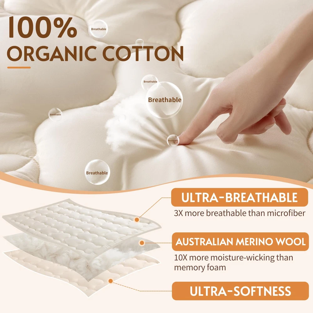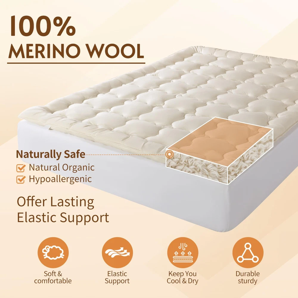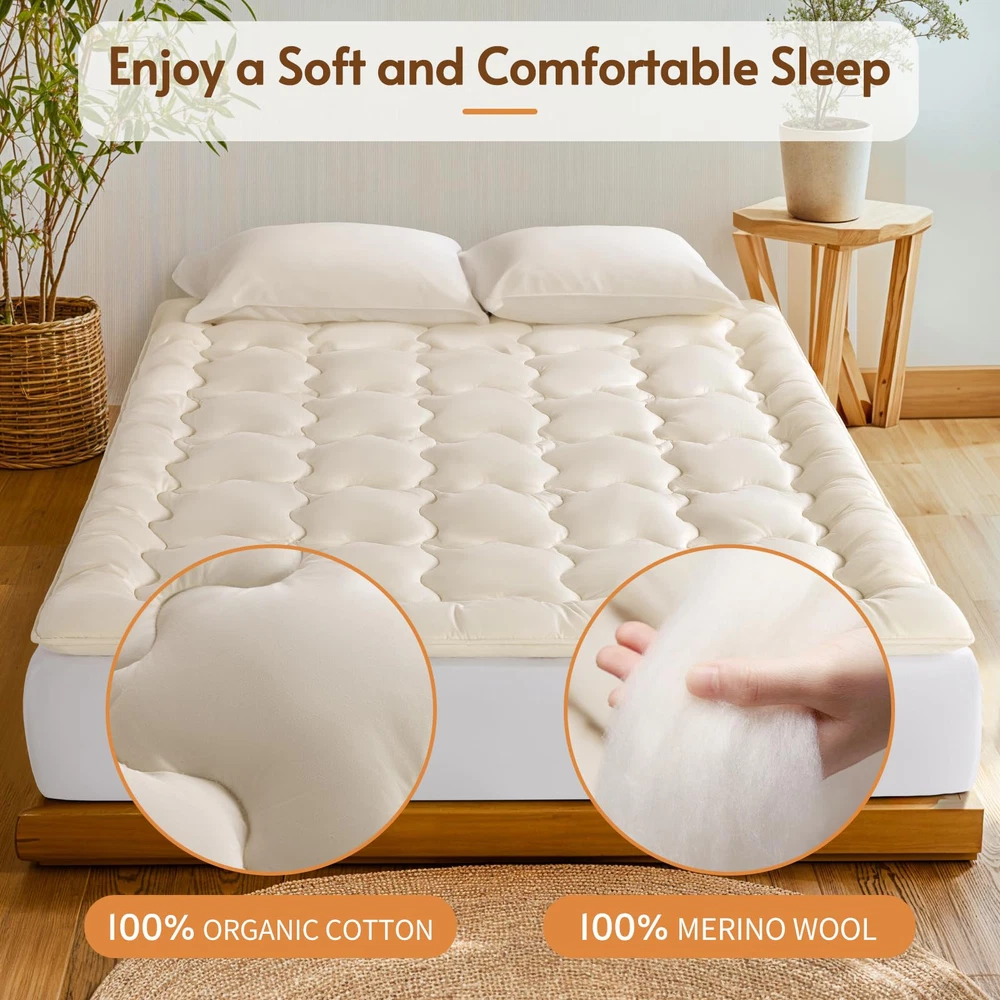 PREMIUM AUSTRALIAN MERINO WOOL FILLING: Experience unparalleled comfort with our wool mattress topper, filled with Australian Merino wool. Known for its exceptional softness, this wool also excels in regulating temperature and wicking moisture. With a generous 32 oz/sq yd(approximately 1100 GSM) and a total weight of 120 ounces, our Queen mattress topper ensures you enjoy a soft, supportive sleep that enhances your nightly rest. PURE & SUSTAINABLE: The wool in our mattress toppers is ethically sourced, with ranchers shearing the sheep annually. These sheep continue to graze freely on green pastures. The wool is fresh, clean, and certified as pure new wool by The Woolmark Company, a global leader in wool quality. Additionally, it meets OEKO-TEX standards 100 for safety. This organic mattress topper is luxuriously soft and skin-friendly, providing you with a comfortable, worry-free sleep experience. SOFT SUPPORT TO RELIEVES BACK PAIN: Our wool mattress topper offers gentle, soft support. Unlike synthetic fiber toppers that can cause itching and irritation, or traditional memory foam mattresses that may sag and create discomfort, our wool topper contours naturally to your body’s shape. The plush wool cushions your body, relieving pressure on painful areas, and providing a soothing, pain-free sleep experience. Wake up refreshed and free from the discomfort of restless nights. NATURAL TEMPERATURE CONTROL: Breathable 100% organic cotton wraps the wool. Fine Merino wool fibers absorb and release moisture quickly, while the organic cotton cover enhances airflow. Together, they create a dry, comfortable sleep environment that adapts to your body, keeping you cozy in any season. Experience deeper, more restful sleep with our organic cotton mattress pad. LONG-LASTING QUALITY YOU CAN TRUST: Crafted with premium Australian Merino wool, our wool mattress topper is built to last. The high-quality wool fibers resist clumping, ensuring the topper remains soft and supportive without sagging over time. The expertly woven organic cotton cover is pill-resistant and shrink-proof, giving you consistent support for years to come.