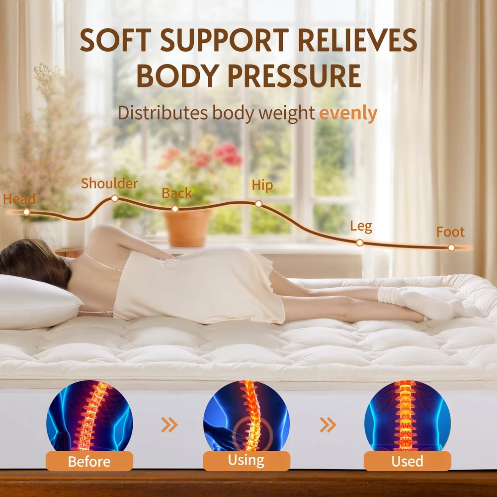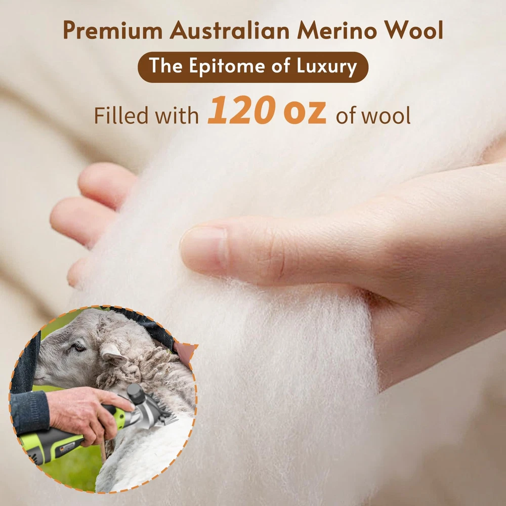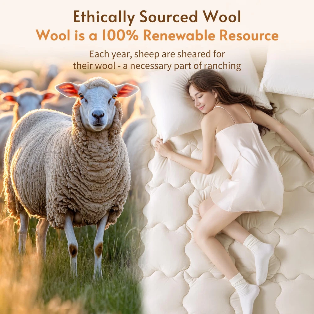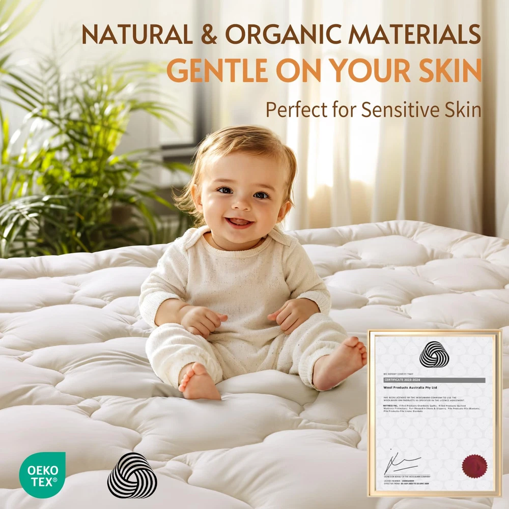 PREMIUM AUSTRALIAN MERINO WOOL FILLING: Experience unparalleled comfort with our wool mattress topper, filled with Australian Merino wool. Known for its exceptional softness, this wool also excels in regulating temperature and wicking moisture. With a generous 32 oz/sq yd(approximately 1100 GSM) and a total weight of 120 ounces, our Queen mattress topper ensures you enjoy a soft, supportive sleep that enhances your nightly rest. PURE & SUSTAINABLE: The wool in our mattress toppers is ethically sourced, with ranchers shearing the sheep annually. These sheep continue to graze freely on green pastures. The wool is fresh, clean, and certified as pure new wool by The Woolmark Company, a global leader in wool quality. Additionally, it meets OEKO-TEX standards 100 for safety. This organic mattress topper is luxuriously soft and skin-friendly, providing you with a comfortable, worry-free sleep experience. SOFT SUPPORT TO RELIEVES BACK PAIN: Our wool mattress topper offers gentle, soft support. Unlike synthetic fiber toppers that can cause itching and irritation, or traditional memory foam mattresses that may sag and create discomfort, our wool topper contours naturally to your body’s shape. The plush wool cushions your body, relieving pressure on painful areas, and providing a soothing, pain-free sleep experience. Wake up refreshed and free from the discomfort of restless nights. NATURAL TEMPERATURE CONTROL: Breathable 100% organic cotton wraps the wool. Fine Merino wool fibers absorb and release moisture quickly, while the organic cotton cover enhances airflow. Together, they create a dry, comfortable sleep environment that adapts to your body, keeping you cozy in any season. Experience deeper, more restful sleep with our organic cotton mattress pad. LONG-LASTING QUALITY YOU CAN TRUST: Crafted with premium Australian Merino wool, our wool mattress topper is built to last. The high-quality wool fibers resist clumping, ensuring the topper remains soft and supportive without sagging over time. The expertly woven organic cotton cover is pill-resistant and shrink-proof, giving you consistent support for years to come.