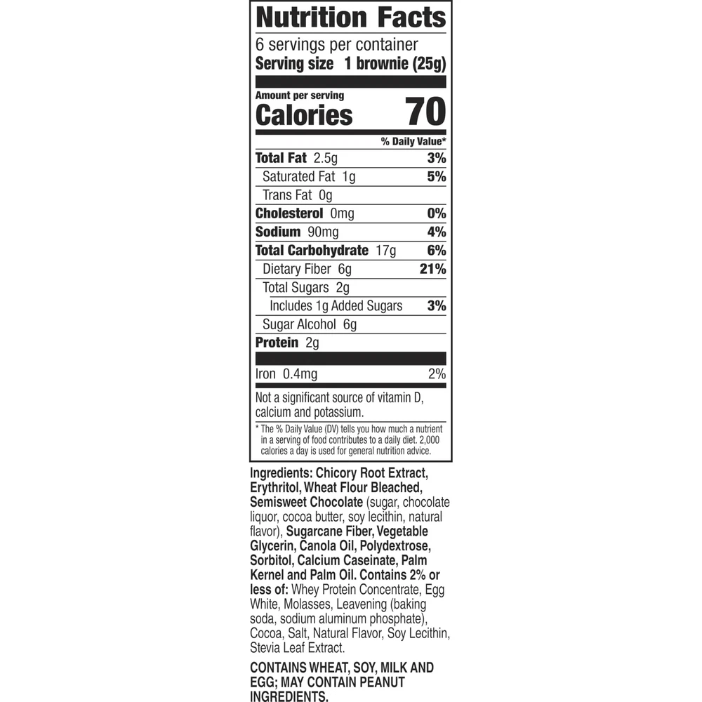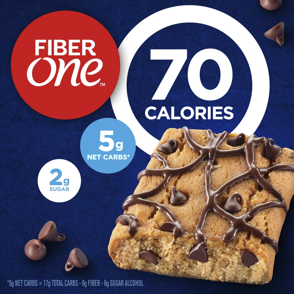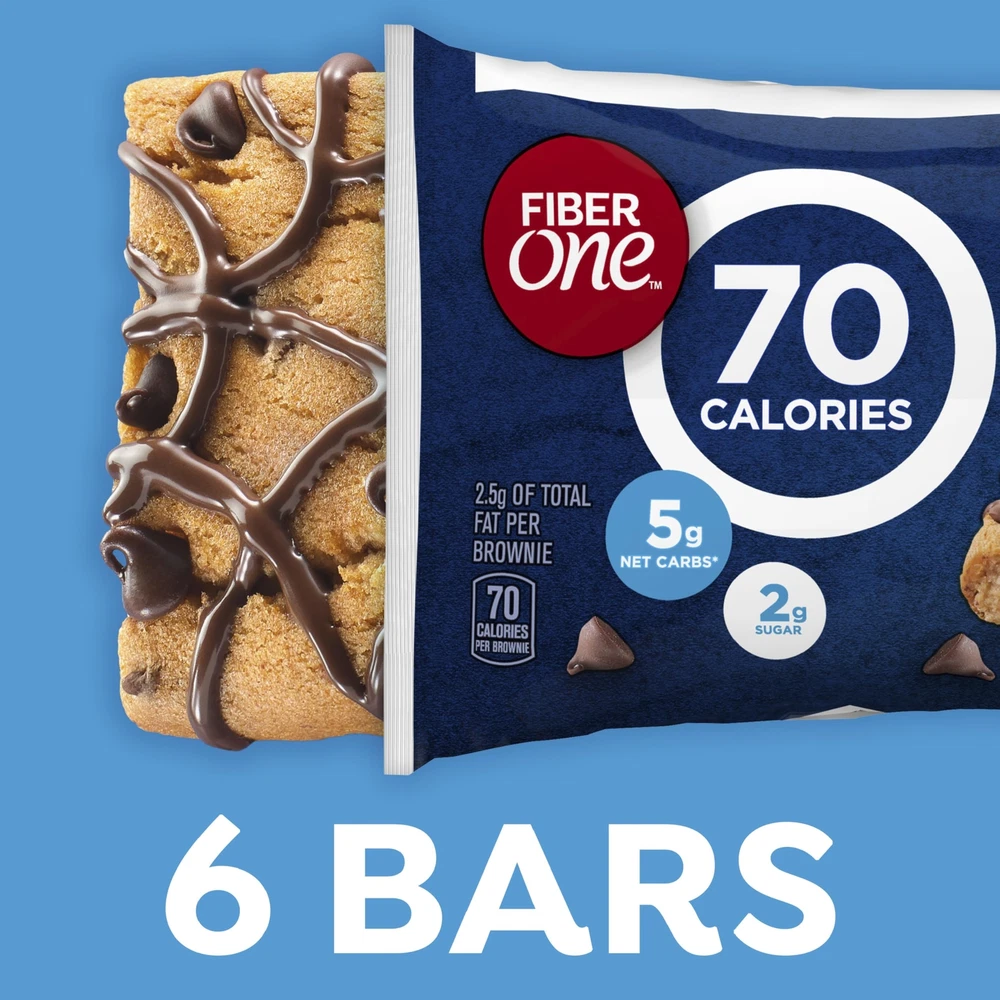 Enjoy an indulgent moment without the guilt with 70 Calorie Chocolate Chip Cookie Flavored Bars. Every bar with chocolatey chips and decadent drizzle is inspired by chocolate chip cookies, with 70 calories, 2g of sugar, and 5g of net carbs. Each delicious fiber bar makes a quick and convenient snack that contains 21% daily value of fiber.* Diets high in fiber can help keep your digestive system on track. Choose as a snack for after breakfast, at the office, or for the lunch box. bars come in great-tasting flavor options including Chocolate Fudge, Cinnamon Coffee Cake, and Chocolate Chip Cookie. Contains 6 bars. 5g net carbs = 17g total carbs - 6g fiber - 6g sugar alcohol. *2.5g total fat per brownie. BROWNIE BAR: 70 Calorie Chocolate Chip Cookie Flavored Brownies; Delicious treats with chocolatey chips and drizzle that you can enjoy as part of a balanced diet FIBER SNACKS: Provides 21% daily value of fiber per bar so you'll feel like one smart cookie when you say 'yes' to your sweet tooth; 2.5g total fat per brownie CHOCOLATE CHIP COOKIE FLAVOR: Don't compromise on deliciousness when you can enjoy the irresistible taste of chocolate chip cookies in these 70 Calorie Brownie Bars PANTRY FAVORITE: Choose as a snack for after breakfast, at the office, or for the lunch box CONTAINS: Eight 5.34 oz boxes of 70 Calorie Chocolate Chip Cookie Flavored Brownies; 6 bars per box