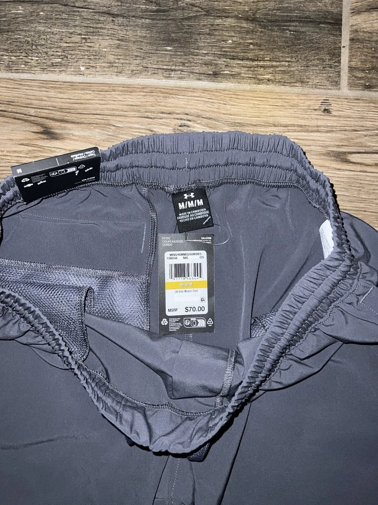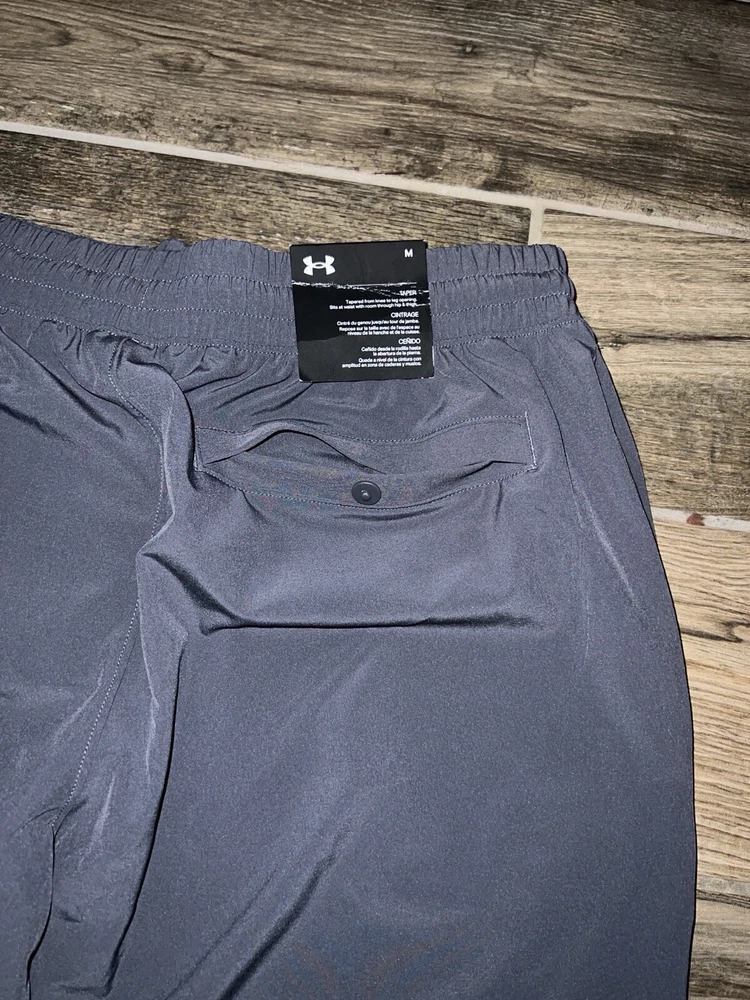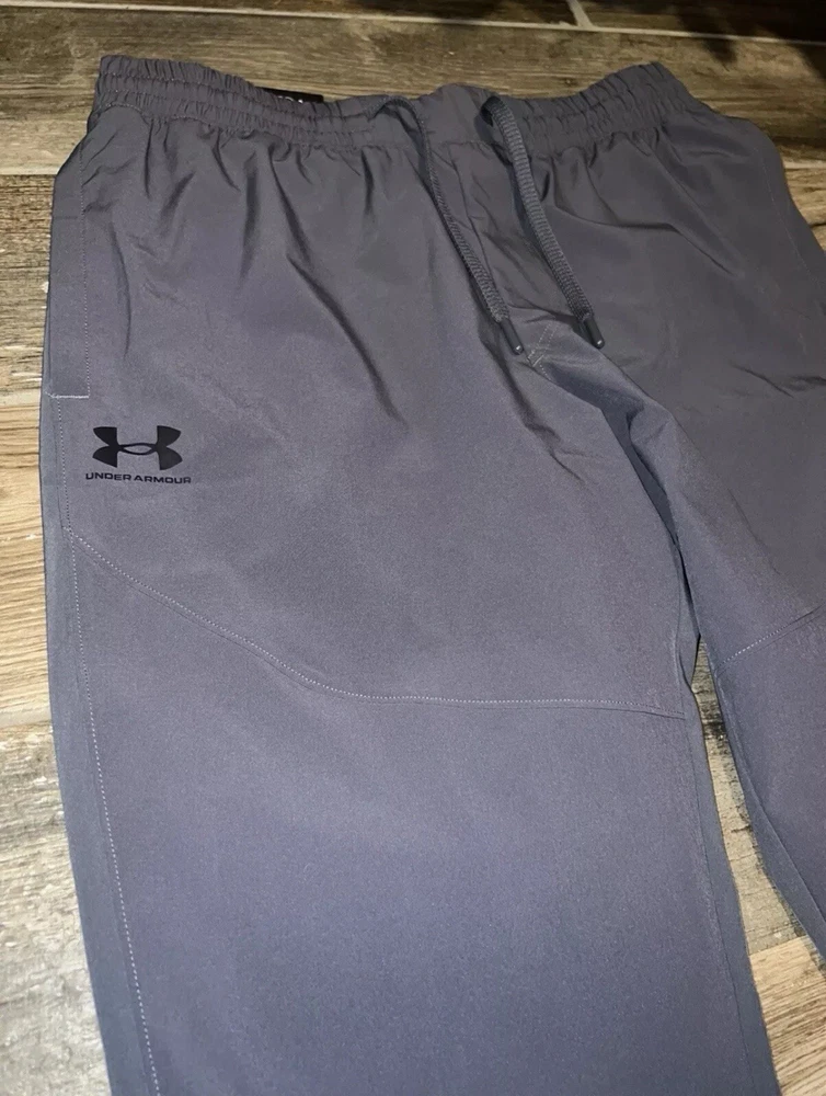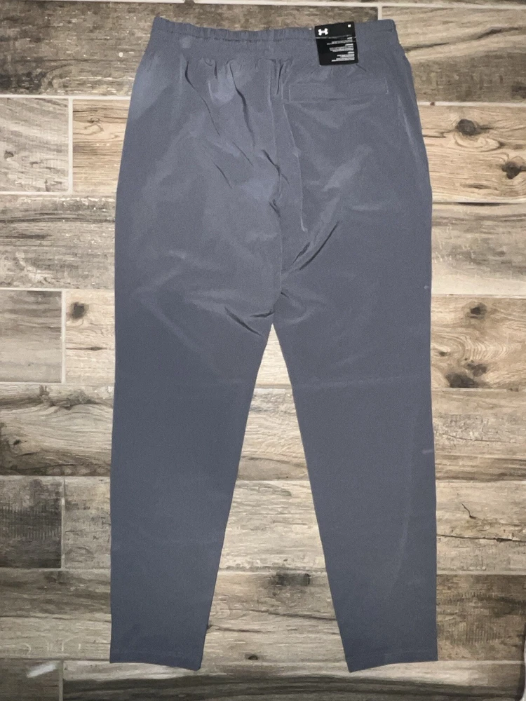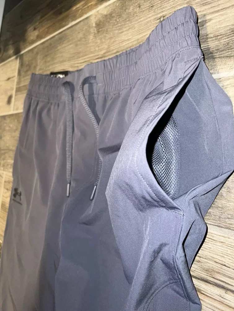 Embrace the fusion of performance and style with the Under Armour UA Men’s Vibe Woven Joggers in a versatile grey color. Tailored for those who appreciate activewear that doesn't compromise on aesthetics, these joggers are ideal for a range of activities including cross training, running, jogging, and even casual walks. The lightweight and breathable fabric ensures comfort during intense workouts, while the elastic waist with drawstring offers a secure and adjustable fit. Crafted for the active man, these medium-sized pants feature a woven design that allows for maximum movement, thanks to the spandex and polyester materials. The tapered leg style and 30-inch inseam are engineered to fit athletic builds, providing a sleek look without sacrificing function. With features like a solid pattern and a 'Storm' character, these joggers are a staple for any season—fall, spring, or winter.