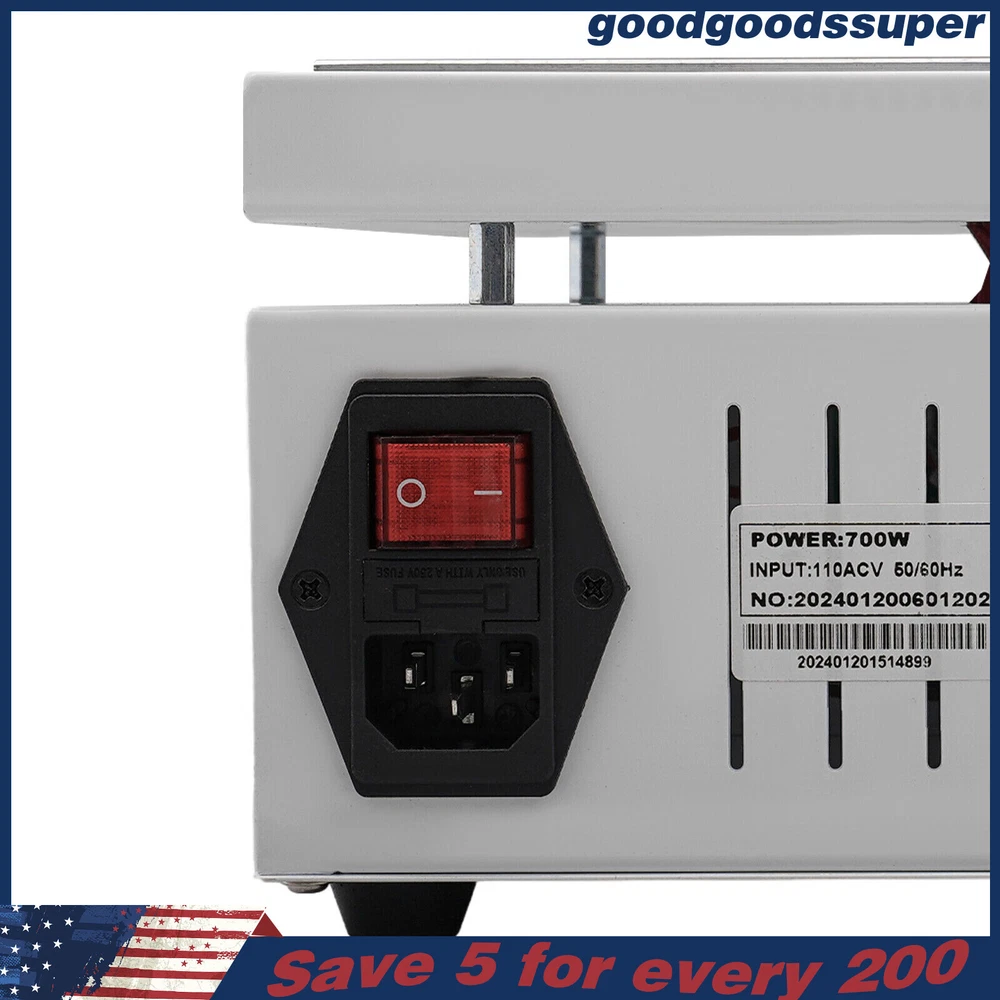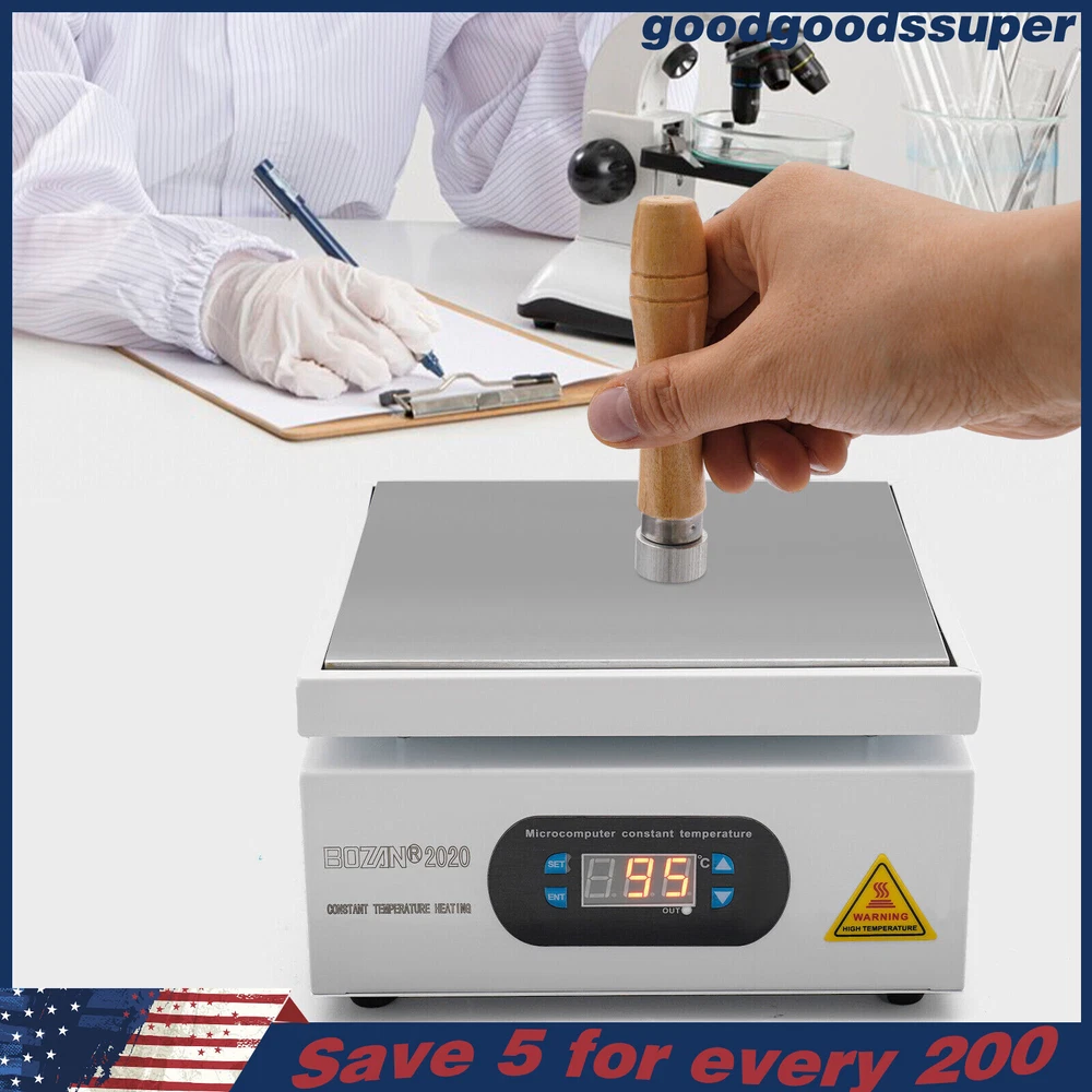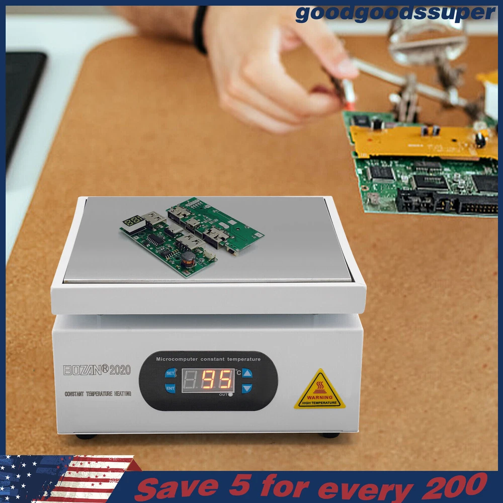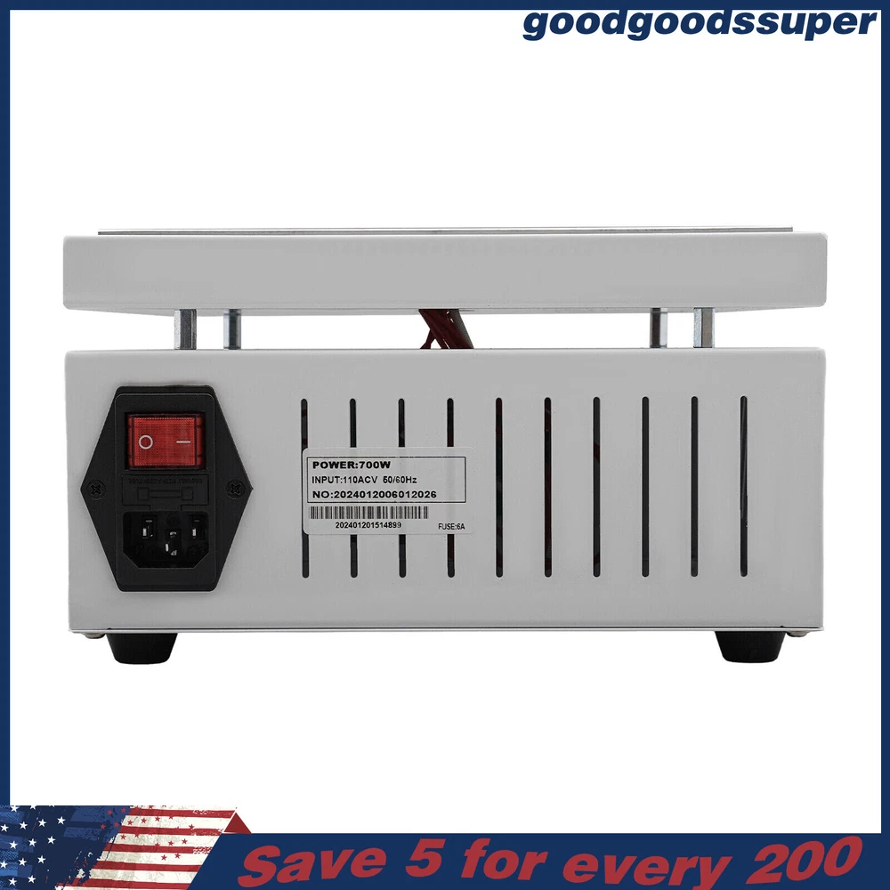 welcome to goodgoodssuper Description This microcomputer electric hot plate allows for fast, even, and stable heating, making your work more efficient. The product is made of aluminum alloy and metal plate, which is sturdy and durable while ensuring good heat conductivity. It is easy to operate and has a wide range of temperature adjustments and a 7.87*7.87-inch heat plate, making it widely available in different industries. Key Features Sturdy and Durable: The product is mainly made of aluminum alloy and metal plate and adopted wire drawing and spray paint processes, making it not easy to corrode and deform so that it can bear high-tension use and has a long service life. High Heating Efficiency: The 700W high power and aluminum alloy heating plate with high thermal conductivity can ensure that the heating plate and the workpiece are heated evenly and quickly to improve your working efficiency. Multi-functions: The product comes with multiple functions to make your work easier, which include the menu-locking function, temperature correction, and the auto-tuning function. Constant Temperature: The product adopts a microcomputer chip with low energy consumption, which can control the temperature intelligently and accurately for even, stable, and quick heating. Simple Operation: It comes with a digital display that can show you the temperature so that you can easily and precisely control the temperature from 32-932℉ through the operation panel. In addition, the product also has a memory function. After saving the temperature, the next time the product starts it will automatically heat up to the last set temperature. Safety Guarantee: The product is equipped with a three-prong power cord socket made of insulating material to avoid leakage of electricity. The fuse tube next to the socket helps avoid fire while protecting the circuit heater core and allowing for easy replacement. Wide Compatibility: The 7.87*7.87-inch heating plate and 32-932℉ adjustable temperature make our products suitable for heat shrink film packaging, PCB removal, chemistry experiments, and other fields. Protective Packaging: The pearl cotton can better protect your product during transportation so that it can be delivered to you completely to the greatest extent. Customer Service: We aim to provide quality products and services. If you have any problems, please feel free to contact us. We will reply and solve the problem for you as soon as possible. Details Non-slip Feet: They provide stable support to prevent the product from sliding during operation, and protect the countertop from scratches. Heat Emission Holes: The heat-sink holes on the left and right sides allow air convection to promote heat dissipation and increase the service life of the heater. Surrounding Edge Wrapping: The heating platform is designed with edges around it to prevent accidental contact and scalding during operation. This design also avoids slips or scratches. Tools for Shrinking Packaging: These tools can be used to press and secure film packages for heat-shrink packaging. Application The products can be used for splitting, repairing cell phone screens, LED displays, component work, PCB dismantling, soldering work, component heating work, SMD rebuilding work, packaging box plastic sealing hot film work, etc. Temperature Range (For Reference Only) 300-400°C/572-752℉: Pre-heating of mold cores and various metal materials 200-300°C/392-572℉: BGA ball welding 200-250°C/392-482℉: LED bead soldering, maintenance 150-200°C/302-392℉: Preheating and repair for electronic circuit board 80-120°C/176-248℉: Remove cell phone screen 30-100°C/86-212℉: Heating laboratory reagents 30°C/86℉: Heating Medical Experiment, Cell Culture, and Liquid Specifications Color: White+Silver Material: Metal Plate, Aluminum Alloy Process: Wire Drawing, Spray Paint Plug Type: US Standard Power: 700W Voltage: 110V Power Cord Length: About 1.5m/4.92ft Power Cord Diameter: About 6.7mm/0.26in Heating Area: 20*20cm/7.87*7.87in Adjustable Temperature Range: 0-500℃/32-932℉ Packaging Size: 26.5*26.5*18.5cm/10.43*10.43*7.28in Gross Weight: 3.1kg/6.8lbs Package Included 1* Microcomputer Electric Hot Plate 1*Power Cord 1*English Manual Other Needed Accessories Notes Please check the size carefully before ordering. Please read the operating manual completely before use. And pay particular attention to the safety instructions included. Please make sure the machine is well grounded before use. Please do not let the airflow blow directly onto the circuit board, otherwise, it will affect the heating of the heater. Before use, please make sure that the ventilation window on the chassis of the thermostatic platform is not blocked by foreign objects, so as not to affect its heat dissipation effect. Please do not place the product in damp and corrosive places for use or storage. Please make sure that the tabletop with the thermostatic platform is flat and not inclined to keep the aluminum heating platform level. Please also make sure that the desktop material must be heat-resistant . The surface of the workpiece and the surrounding area are very hot during product operation, so please do not use the hot plate near flammable materials, and please take care not to allow yourself to be scalded or burned. If you need to move or touch the machine, please turn off the power and wait for the heating plate to cool down completely to room temperature. To prolong the service life of the heating element and the machine, please do not use the machine for a long time under high temperatures (higher than 300℃/572℉). Under normal circumstances, the machine should not work continuously for more than 8 hours. This machine is a high-temperature electrically heated product. Please disconnect the power supply if the machine is not in use to avoid danger and accidents. Please allow the slight color difference caused by the shooting light and 1-3cm error due to manual measurement, an