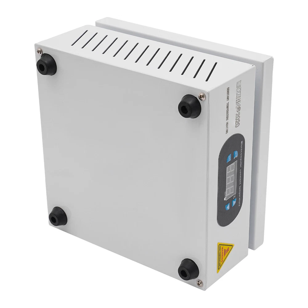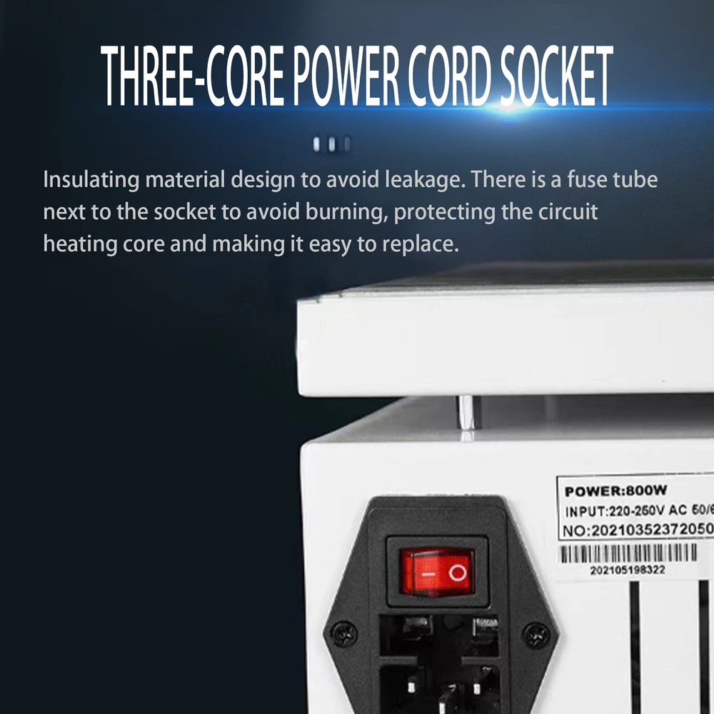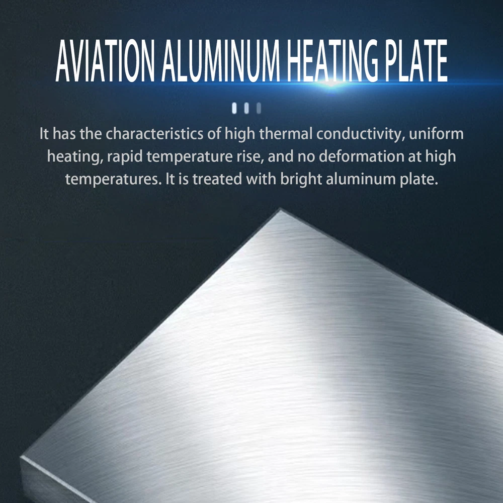 700W 110V Electric Soldering Hot Plate Microcomputer Preheating Welder Hot Plate Description This microcomputer electric hot plate allows for fast, even, and stable heating, making your work more efficient. The product is made of aluminum alloy and metal plate, which is sturdy and durable while ensuring good heat conductivity. It is easy to operate and has a wide range of temperature adjustments and a 7.87*7.87-inch heat plate, making it widely available in different industries. Key Features Sturdy and Durable: The product is mainly made of aluminum alloy and metal plate and adopted wire drawing and spray paint processes, making it not easy to corrode and deform so that it can bear high-tension use and has a long service life. High Heating Efficiency: The 700W high power and aluminum alloy heating plate with high thermal conductivity can ensure that the heating plate and the workpiece are heated evenly and quickly to improve your working efficiency. Multi-functions: The product comes with multiple functions to make your work easier, which include the menu-locking function, temperature correction, and the auto-tuning function. Constant Temperature: The product adopts a microcomputer chip with low energy consumption, which can control the temperature intelligently and accurately for even, stable, and quick heating. Simple Operation: It comes with a digital display that can show you the temperature so that you can easily and precisely control the temperature from 32-932℉ through the operation panel. In addition, the product also has a memory function. After saving the temperature, the next time the product starts it will automatically heat up to the last set temperature. Safety Guarantee: The product is equipped with a three-prong power cord socket made of insulating material to avoid leakage of electricity. The fuse tube next to the socket helps avoid fire while protecting the circuit heater core and allowing for easy replacement. Wide Compatibility: The 7.87*7.87-inch heating plate and 32-932℉ adjustable temperature make our products suitable for heat shrink film packaging, PCB removal, chemistry experiments, and other fields. Protective Packaging: The pearl cotton can better protect your product during transportation so that it can be delivered to you completely to the greatest extent. Customer Service: We aim to provide quality products and services. If you have any problems, please feel free to contact us. We will reply and solve the problem for you as soon as possible. Details Non-slip Feet: They provide stable support to prevent the product from sliding during operation, and protect the countertop from scratches. Heat Emission Holes: The heat-sink holes on the left and right sides allow air convection to promote heat dissipation and increase the service life of the heater. Surrounding Edge Wrapping: The heating platform is designed with edges around it to prevent accidental contact and scalding during operation. This design also avoids slips or scratches. Tools for Shrinking Packaging: These tools can be used to press and secure film packages for heat-shrink packaging. Application The products can be used for splitting, repairing cell phone screens, LED displays, component work, PCB dismantling, soldering work, component heating work, SMD rebuilding work, packaging box plastic sealing hot film work, etc. Temperature Range (For Reference Only) 300-400°C/572-752℉: Pre-heating of mold cores and various metal materials 200-300°C/392-572℉: BGA ball welding 200-250°C/392-482℉: LED bead soldering, maintenance 150-200°C/302-392℉: Preheating and repair for electronic circuit board 80-120°C/176-248℉: Remove cell phone screen 30-100°C/86-212℉: Heating laboratory reagents 30°C/86℉: Heating Medical Experiment, Cell Culture, and Liquid Specifications Color: White+Silver Material: Metal Plate, Aluminum Alloy Process: Wire Drawing, Spray Paint Plug Type: US Standard Power: 700W Voltage: 110V Power Cord Length: About 1.5m/4.92ft Power Cord Diameter: About 6.7mm/0.26in Heating Area: 20*20cm/7.87*7.87in Adjustable Temperature Range: 0-500℃/32-932℉ Packaging Size: 26.5*26.5*18.5cm/10.43*10.43*7.28in Gross Weight: 3.1kg/6.8lbs Package Included 1* Microcomputer Electric Hot Plate 1*Power Cord 1*English Manual Other Needed Accessories Notes Please check the size carefully before ordering. Please read the operating manual completely before use. And pay particular attention to the safety instructions included. Please make sure the machine is well grounded before use. Please do not let the airflow blow directly onto the circuit board, otherwise, it will affect the heating of the heater. Before use, please make sure that the ventilation window on the chassis of the thermostatic platform is not blocked by foreign objects, so as not to affect its heat dissipation effect. Please do not place the product in damp and corrosive places for use or storage. Please make sure that the tabletop with the thermostatic platform is flat and not inclined to keep the aluminum heating platform level. Please also make sure that the desktop material must be heat-resistant . The surface of the workpiece and the surrounding area are very hot during product operation, so please do not use the hot plate near flammable materials, and please take care not to allow yourself to be scalded or burned. If you need to move or touch the machine, please turn off the power and wait for the heating plate to cool down completely to room temperature. To prolong the service life of the heating element and the machine, please do not use the machine for a long time under high temperatures (higher than 300℃/572℉). Under normal circumstances, the machine should not work continuously for more than 8 hours. This machine is a high-temperature electrically heated product. Please disconnect the power supply if the machine is not in use to avoid danger and accidents. Please allow the slight color difference caused by the shoot