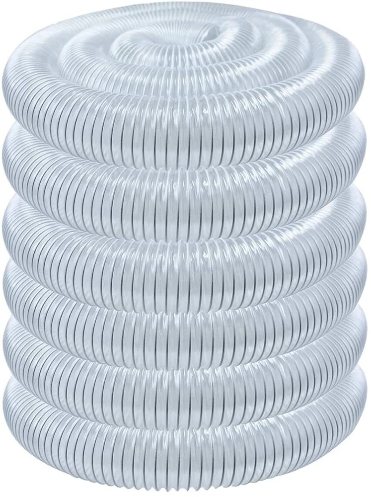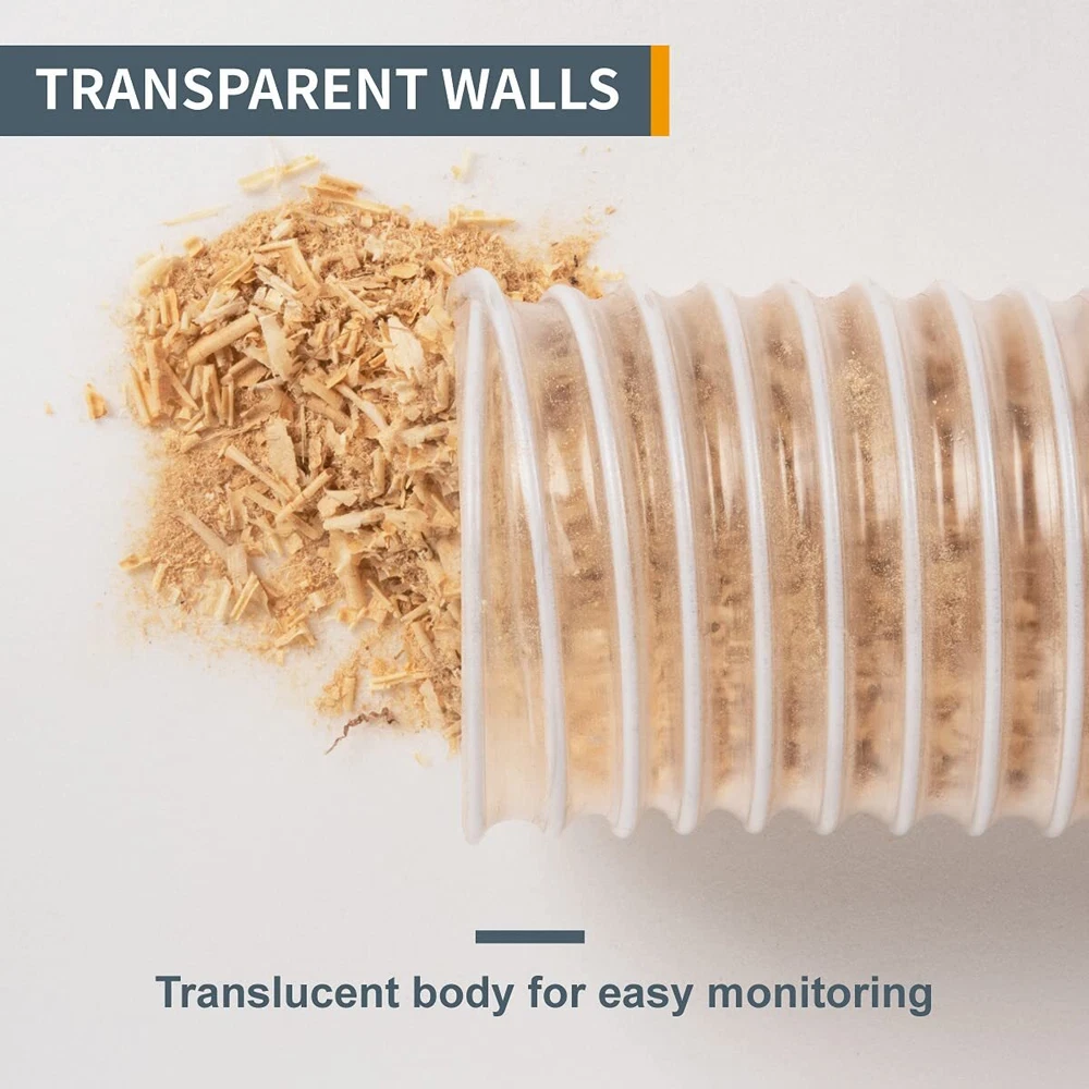 The 2-1/2-Inch x 50-foot PVC Dust Collector Hose - 70240 A practical, safe and cost effective dust collection hose designed to enhance your existing workshop dust collection and filtration systems. Flexible Versatility Whether you have an industrial vacuum cleaner or a centralized dust collection system built into your shop, you understand the importance of having a super lightweight, flexible and kink-proof dust collection hose that can withstand the rigors of everyday shop use. Heavy Duty Made from high quality PVC material, this hose will not collapse under pressure from your dust collector. PVC s durability, strength and easy installation make it ideal for workshop dust control, sawdust collection, carpentry and woodworking applications. Innovative Design Features Flaunts an impressively translucent body, reinforced by interior spiral spring steel wire allowing you to monitor your air movement performance, debris collection and fine dust separation/ filtration. Rated Safe With dust collection, one must always consider the dangers of static electricity and fire risk. This PVC hose features a flame retardant construction, is temperature resistant (up to 176° F) and is capable of electrostatic discharge (when grounded). It also offers exceptional resistance to chemicals along with acidic and alkaline materials. Product Specification Data Construction: Heavy Duty Soft PVC (Polyvinyl Chloride) Reinforced Spiral Spring Steel Wire: Spring Steel Wire Size: 2-1/2 inches diameter x 50 feet long Wall Thickness: 0. 5 mm / 1/64 Compression Ratio: 3: 1 Temperature Range: -50° F to 158° F (short term up to176° F) Includes (one) 2-1/2" diameter 50 feet long left spiral clear flexible hose Made from high quality PVC for durability, strength and easy installation Ultra flexible hose reinforced with spring steel wire delivers toughness and maneuverability Perfect for any clear view dust collection system – allowing you to monitor dust/ debris separation and vapor/ smoke filtration Ideal for an assortment of sawdust collectors, air conditioning indoor ventilation ducts and 2-1/2” PVC dust collection systems for woodworking applications