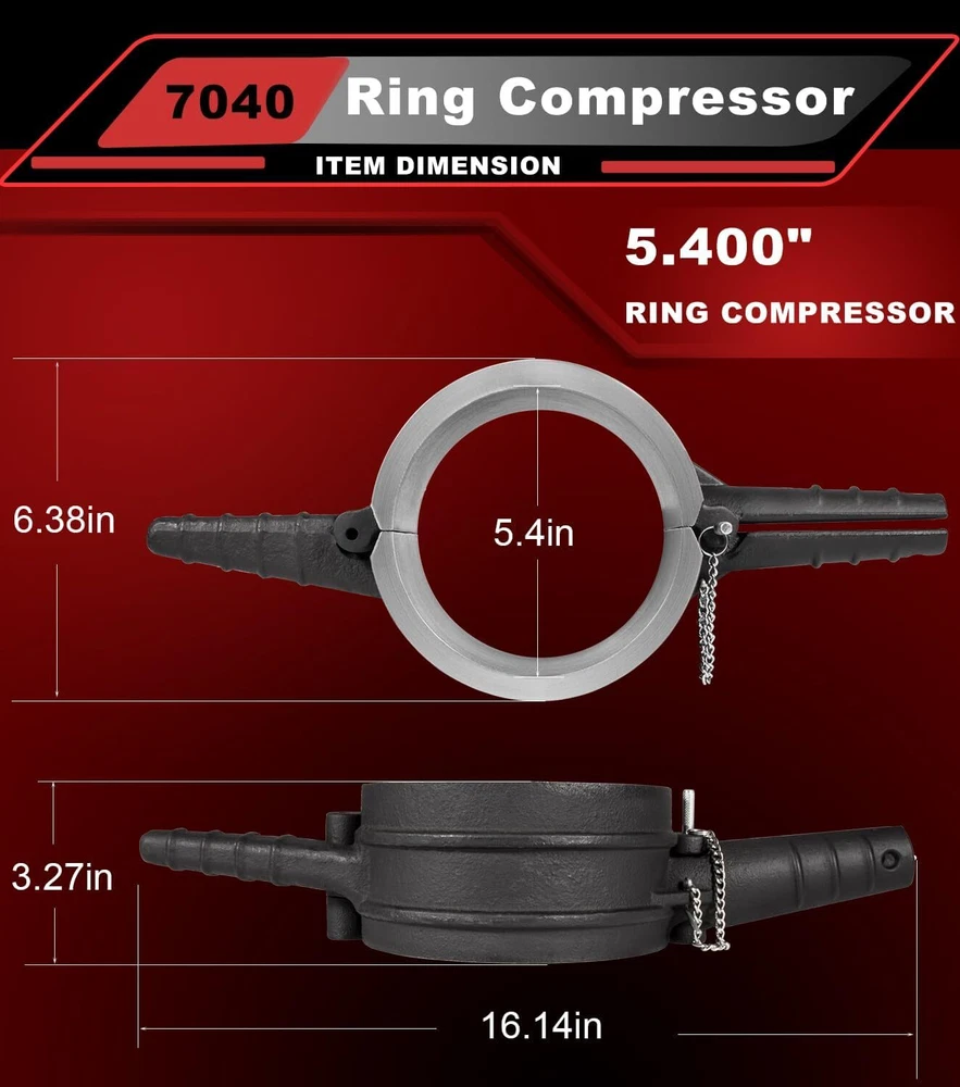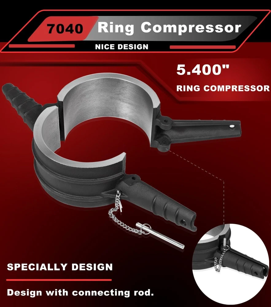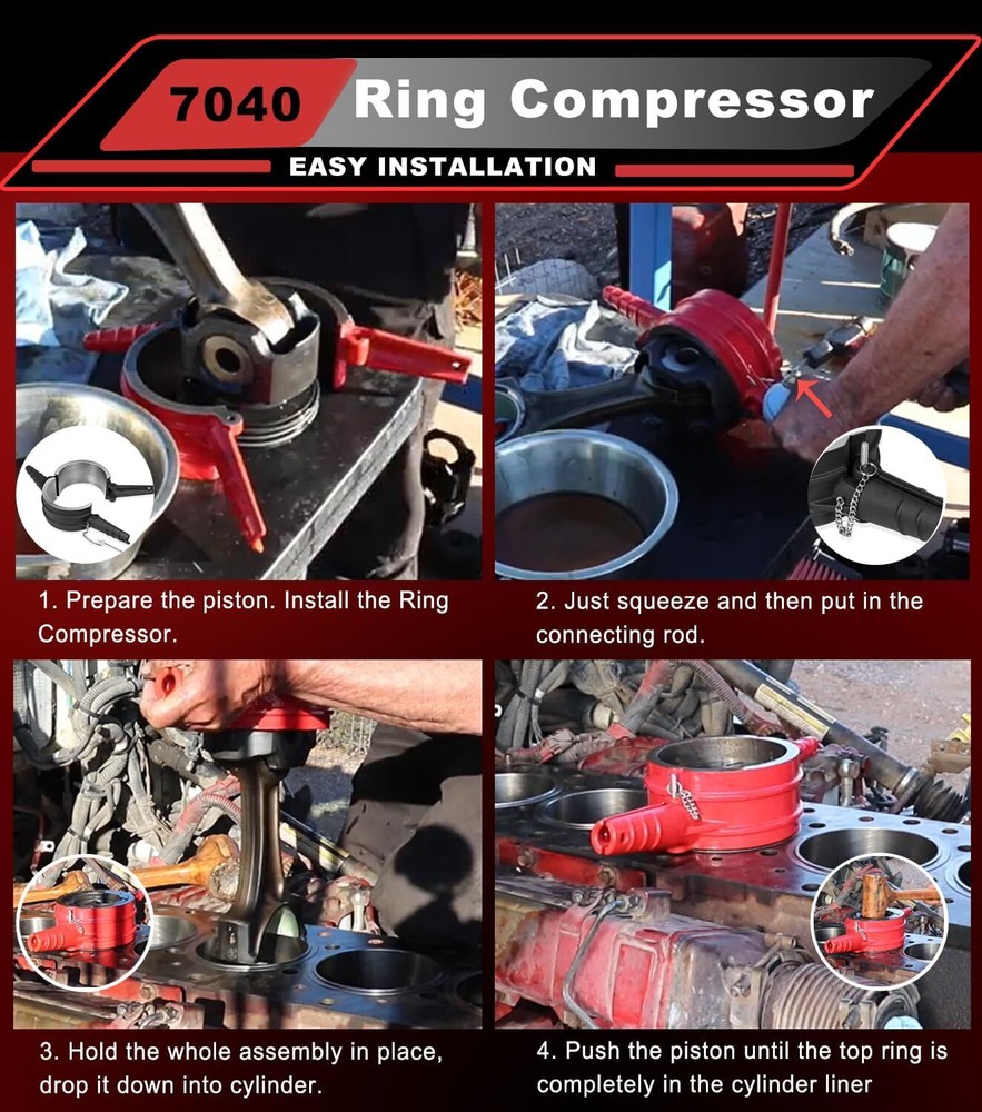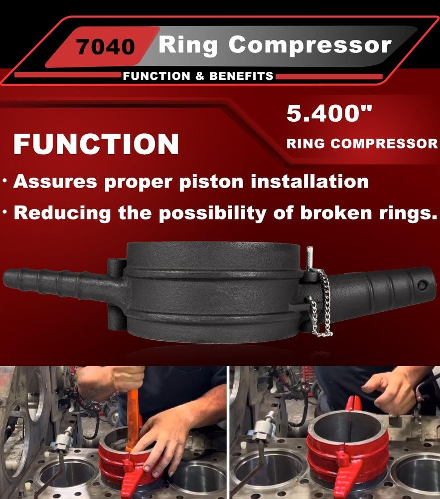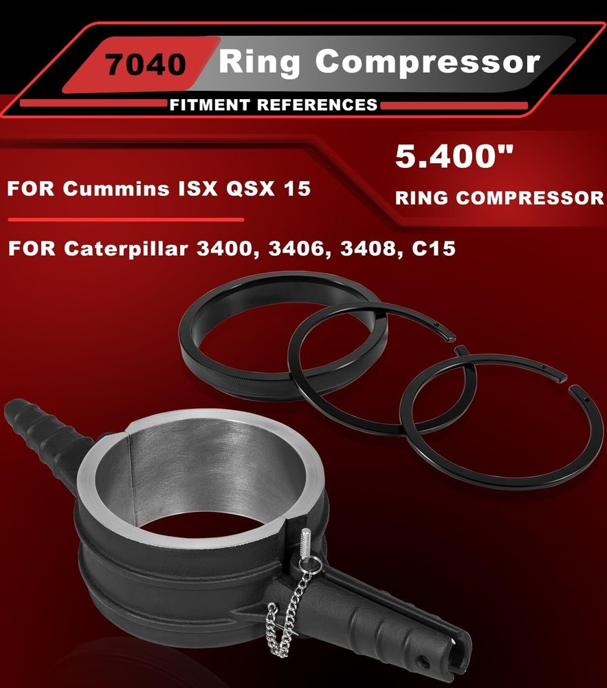 7040 For Cummins ISX QSX 15, Caterpillar 3400, 3406 Piston Ring Compressor Tool APPLICATION -- Suiltable for Cummins ISX QSX 15 & Caterpillar 3400, 3406, 3408, C15 -- 5.4" Bore. REPLACE OEM -- [Set of 4] 7040 Piston Ring Compressor Tool alternative to the PT-7040. Piston Ring Compressor Adapter Alternative to 5299339. Anti-Polishing Ring Alternative to 5299448, 5299447. FUNCTION -- Ring Compressor help for piston installation. Assures proper piston installation, reducing the possibility of broken rings. The Adapter Kit is required to install the piston, piston ring,and connecting rod assembly into an anti-polishing ring cylinder liner. Used in conjunction with 7040 piston ring compressor to install piston rings into antipolishing cylinder liners. QUALITY -- Manufactured from Strong Cast Steel. Powder-Coated to ensure Corrosion-Resistant. Using top of the line machining and measuring equipment to ensure each part is manufactured to OEM quality standards and specifications. PACKAGE INCLUDED -- [Set of 4] 7040 Piston Ring Compressor Tool For CAT 3406, 3408, C15 &CUMMINS ISX QSX 7040 Piston Ring Compressor For CATERPILLAR 3400, 3406, 3408, C15 & CUMMINS ISX QSX 15 -- 5.4" Bore Piston Ring. REPLACE OEM 7040 5.4" Bore Design with connecting rod. Assures proper piston installation, reducing the possibility of broken rings. For CAT 3406, 3408, C15 &CUMMINS ISX QSX Piston Ring Compressor Adapter & Anti-Polishing Ring For CATERPILLAR 3400, 3406, 3408, C15 & CUMMINS ISX QSX 15 -- 5.4" Bore Piston Ring. Piston Ring Compressor Adapter Alternative to 5299339. Anti-Polishing Ring Alternative to 5299448, 5299447. Used in conjunction with an existing piston ring compressor to install piston rings into antipolishing cylinder liners. How To Install Piston For Cummins ISX ? Step 1 Prepare the piston. Flip the compressor over. Install the Ring Compressor. Step 2 Just squeeze and then put in the connecting rod to hold the whole part in place. Step 3 Install the Piston Ring Compressor Adapter. Hold the whole assembly in place, drop it down into cylinder. Step 4 Push the piston until the top ring is completely in the cylinder liner. Complete Kit (1) 7040 Piston Ring Compressor 5.4" Bore - PT-7040 (1) Piston Ring Compressor Adapter - 5299339 (1) Anti-Polishing Ring - 5299448 (1) Anti-Polishing Ring - 5299447 For Caterpillar 3400, 3406, 3408, C15 & Cummins ISX QSX -- 5.4" Bore Piston Ring Special Design Help you to easily flip the compressor over. 5.4" Bore For CATERPILLAR 3400, 3406, 3408, C15 & CUMMINS ISX QSX 15 -- 5.4" Bore Piston Ring. Connecting Rod Install the pin will help you squeeze the compressor and hold the whole part in place. Top Quality Strong Cast Steel. Ring Compressor help for piston installation. Time & Money saver! Payment Delivery details Terms of sales Contact us Payment Orders will be ship out within 1-3 business days after payment has cleared. Delivery details Orders from Saturdays, Sundays or holidays will process on next business day and will be ship within 24 hours. Some shipments could take longer subject to your local customs authorities. We only ship to confirmed ebay addresses. Your ebay address MUST MATCH your Shipping address Terms of sales We accept 60 days return guarantee for all Items If you are unsatisfied with something you bought from us, you may send it back within 60 days of receipt, and we shall be happy to exchange or refund. Contact us If you have any question, please email contact me, we can solve all the problem. Brand Carparts_89 Manufacturer Part Number 7040 Type Piston Ring Fitment Type Direct Replacement Warranty 1 Year Items Included Piston Rings OE/OEM Part Number 7040 Manufacturer Warranty 1 Year Material Steel Interchange Part Number PT-7040,, 5299448, 5299447 and 5299339, Application For Cummins ISX QSX, Caterpillar (CAT) 3400 Color Black Piston Diameter See the detail