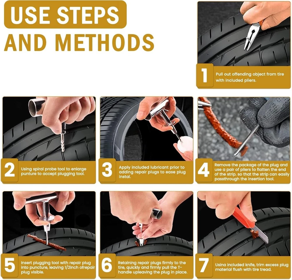 Tire Repair Kit 70 PCS Heavy Duty Flat Patch Plug Tool Set for Car Motorcycle ‹ › ‹ › ‹ › ‹ › ‹ › ‹ › ‹ › ‹ › ‹ › ‹ › ‹ › Heavy Duty Tire Repair Kit - 70 PCS Experience peace of mind on the road with our comprehensive 70-in-1 Tire Repair Kit . Ideal for cars and motorcycles alike, this kit ensures you're prepared for any tire mishap. Features: Complete Set: Includes tire repair plugs, repair strings, lubricant, insert tool replacement, handle insert tool, nose pliers, knife, and more! Sturdy & Durable: Crafted from high-quality steel and zinc alloy that is less prone to rust. Flexible Tire Strips: Made of butyl rubber and natural rubber vulcanization to stay flexible and resist aging. Easy to Use: Designed for simplicity, you can get back on the road quickly in case of a puncture. Portable Case: All tools come neatly packed in a compact suitcase for easy storage in your vehicle. Powerful Function: Works with any tubeless tire - suitable for trucks, bikes, lawn mowers, sedans, and more. 24/7 Customer Support: Trust in our dedicated customer service for any product inquiries or concerns. Why Choose Our Tire Repair Kit? Driving should be a joy, not a worry. Our Heavy Duty Tire Repair Kit provides an all-in-one solution for unexpected tire emergencies. You'll never have to scramble for tools again; everything you need is included in this carefully curated set. Built for durability and ease of use, you can tackle any tire issue confidently. Don't leave your safety to chance—invest in our Heavy Duty Tire Repair Kit today and drive with the assurance that you're prepared for anything! Shipping Free & Fast Shipping - We offer free shipping to most of the USA with a normal delivery time of 3-7 days. However, due to the current situation, additional delivery time (up to 3 weeks) may be required for some items. Alternative Carriers - We may use alternative carriers (e.g. USPS, FedEx, UPS, etc.) to ensure your package arrives safely and on time. Due to the use of multiple carriers, we are unable to provide a tracking number automatically. Handling Time - Orders are processed and shipped within 1-2 business days of receiving cleared payment. Shipping Restrictions - Shipping to Alaska, Hawaii, Puerto Rico, Guam, and other US territories may incur shipping charges or delivery restrictions. Please contact us before ordering, or your order can be refunded/cancelled. State Restrictions - There may be restrictions based on your state of purchase. For example, certain items may not be shipped to California due to state regulations. Contact for Tracking Updates - If you require tracking updates or have any concerns about the delivery of your order, please feel free to contact us, and we will be happy to assist you. Return 30-Day Hassle-Free Returns - We want you to be completely satisfied with your purchase. If you are not, you can return the item within 30 days of receiving it for a full refund or exchange. Easy Return Process - To start a return, simply contact us and we will provide you with a prepaid return shipping label and detailed instructions. Restocking Fee - There are no restocking fees for returns. However, the buyer is responsible for return shipping costs if the return is not due to a seller's error. Refund Processing Time - Refunds will be processed within 5 business days of receiving the returned item in its condition. Payment We accept all major credit cards, PayPal, and Apple Pay for your convenience. Your payment information is secure and encrypted to ensure a safe and seamless transaction. Please complete your payment within 3 days of purchase to avoid any delays in shipping. Feedback Your feedback is extremely important to us. We strive to provide the best products and customer service possible. If you are satisfied with your purchase, please take a moment to leave us a positive review. If you have any concerns or issues with your order, please contact us before leaving negative feedback. We are committed to resolving any problems and ensuring your satisfaction. Contact Us If you have any questions or concerns, please feel free to out to our customer support team. You can contact us through the eBay messaging system. We are available Monday to Friday, 9:00 am to 5:00 pm EST, and we will do our best to respond to your inquiry within 24 hours. Buy it now and enjoy a pleasant shopping experience! Placement on Vehicle: None Material: Steel,Zinc Alloy,Butyl Rubber,Natural Rubber Finish: Uncoated Type: Tire Repair Kit