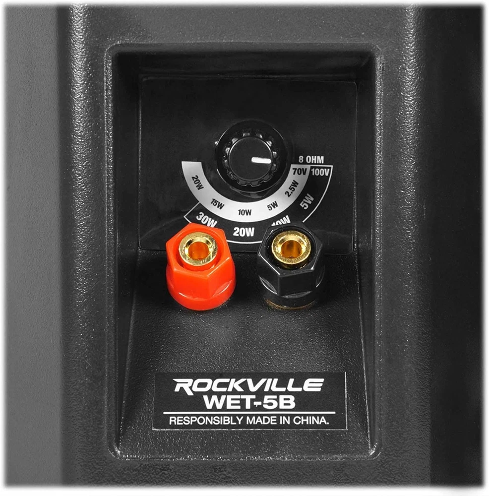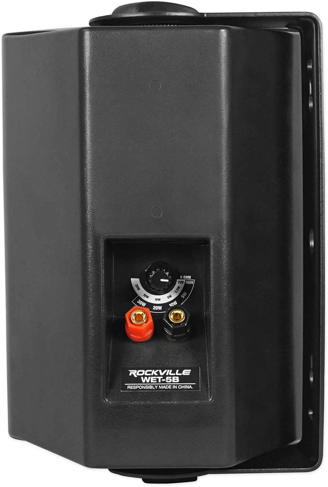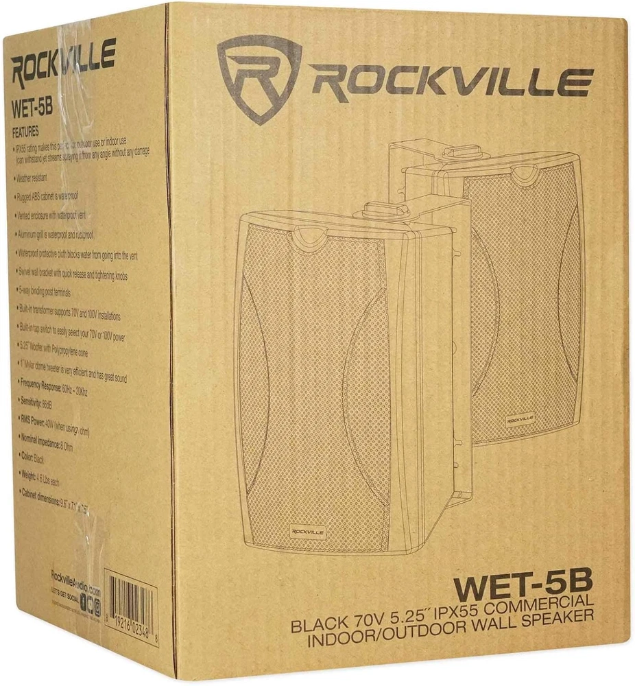 Store New Arrivals Add to Favorite View Feedback Contact 70V 5.25" IPX55 Commercial Indoor/Outdoor Wall Speaker - Black (WET-5B) Description Item model number WET-5B Style 5.25” Black (Single) Number of Items 1 Power Source Corded Electric Pattern Wall Speakers Control Method App Warranty Type Full Warranty Tweeter Diameter 1 Inches Unit Count 1.0 Count Speaker Size 5.25 Inches Material Plastic, Metal Model Name WET-5B Impedance 8 Ohm Recommended Uses For Product For Surround Sound Systems Specific Uses For Product Commercial indoor/outdoor environments, high-power installations, outdoor use, environments requiring good bass performance Included Components Speakers Subwoofer Diameter 5.25 Inches Country of Origin China Speaker Maximum Output Power 40 Watts Connectivity Protocol Wi-Fi Item Weight 4.62 pounds Connectivity Technology Wired Special Feature Hi Res Audio Mounting Type Wall Mount Color Black Compatible Devices Smartphone, Tablet, Laptop, Desktop Speaker Type Outdoor Global Trade Identification Number 00819216023488 Is Waterproof TRUE Audio Output Mode Stereo and Surround Sound Product Dimensions 22.76"D x 8.86"W x 14.2"H Rockville WET-5B 70V 5.25" IPX55 commercial indoor/outdoor wall speaker - Black Rockville WET-5B 5.25" Commercial/restaurant 70V or 8 Ohm wall mount speaker. IPX55 rating makes this perfect for outdoor use or indoor use. IPX55 means this can withstand JET streams spraying it from any angle without any damage. Rugged ABS cabinet is waterproof Vented enclosure with waterproof vent (water can't get in but sound can get out). aluminum grill is waterproof and rustproof. Waterproof protective cloth blocks water from going into the vent. Swivel wall bracket with quick release and tightening knobs. Weather resistant 5.25” woofer with polypropylene cone. 1” Mylar dome tweeter is very efficient and has great sound. Frequency response: 60Hz – 20kHz. Sensitivity: 86dB. Rms power: 40W (when using 8 Ohm). Nominal Impedance: 8 Ohm. 5-Way binding post terminals Built in transformer supports 70V and 100V installations. Built in tap switch to easily select your 70V or 100V power. Color: black. Weight: 4.6 lbs each. Cabinet dimensions: 9.6” x 7.1” x 7.5” Product Description Rockville WET-5B 70V 5.25" IPX55 Commercial Indoor/Outdoor Wall Speaker - Black Description: The Rockville WET-5B features swivel brackets that allow you to mount the speaker to your wall. Attaching the speaker to the swivel bracket is quick and easy. Simply slide the speaker on to the bracket and tighten the knobs with a quick turn.Changing the swivel position is just as easy. You simply loosen the Knobs to change the position of the speaker while it is on the bracket. IPX55 rated! These speakers are IPX55 rated. This means you can install them indoors or outdoors. They can withstand heavy rain, moisture, sun,dust, and even jet streams of water hitting the speaker from multiple angles. We went above and beyond in terms of product development to get these speakers IPX55 rated. The cabinets were upgraded to a high-end waterproof ABS material. In addition, we added a special cloth material to the speaker to block water from going entering the vent. The grill is made of aluminum and will never rust from outdoors use. We used Stainless steel brackets to ensure that the brackets wouldn’t rust either. Even the speaker wire terminals are waterproof and rustproof! Vented design has kicking bass! This is one of the only indoor/outdoor 70V speakers on the market with a vented design and an IPX55 rating. These will give you amazing bass response and great full range sound quality at low or high volume. What is 70 volt ? With 70 volt there are a lot of advantages over 8-ohm systems. One of the main advantages is the simplicity of the wiring as well as how easy it is to match up speakers with the amplifier. For example, you can buy one 70V amplifier with 350 watts and you can install speakers that total close to 300 watts. It does not matter if it is 15 speakers that are 20 watts each or 50 speakers that are tapped at 5 watts each. You always want your 70 volt amp to have at least 15 or 20% more power than the combined watts your speakers are tapped at. When we say the word tap, what we are referring to are the selectors these speakers have on them. For example, these speakers have selectable options of 2.5w, 5w, 10w, 20w. What this does is limit how many watts the built-in transformer on the speaker will allow the speaker to get from the amplifier. This gives you full customization over the sound for your space. In a restaurant for example you can tap your dining room speakers at 5 watts, the speakers by the bar area at 20 watts, and the ones in the hallway at 2.5 watts. Another great feature with 70 volt is you can mix and match any 70 volt speakers whether they are ceiling speakers, wall mounted speakers, subwoofers, etc. 70 volt systems allow you to run very long lines of speaker wire without signal loss. This is ideal when running long speaker leads. The wiring is simple. You just wire all the positive terminals of the speakers to the positive 70 volt terminals of the amplifier. The negative terminals on the speaker simply get wired to the negative terminals on the amp. You do not have to worry about impedance. The power is constant. Features: Rockville Wet-5B 5.25" Commercial/Restaurant 70V or 8 Ohm Wall Mount Speaker IPX55 rating makes this perfect for outdoor use or indoor use IPX55 means this can withstand jet streams spraying it from any angle without any damage Rugged ABS cabinet is waterproof Vented enclosure with waterproof vent (water can’t get in but sound can get out) Aluminum grill is waterproof and rustproof Waterproof protective cloth blocks water from going into the vent Swivel wall bracket with quick release and tightening knobs Weather resistant 5.25” Woofer with Polypropylene cone 1” Mylar dome tweeter is very efficient and has great sound Frequency Response: 60Hz – 20Khz Sens