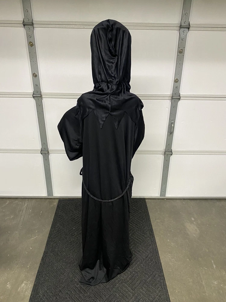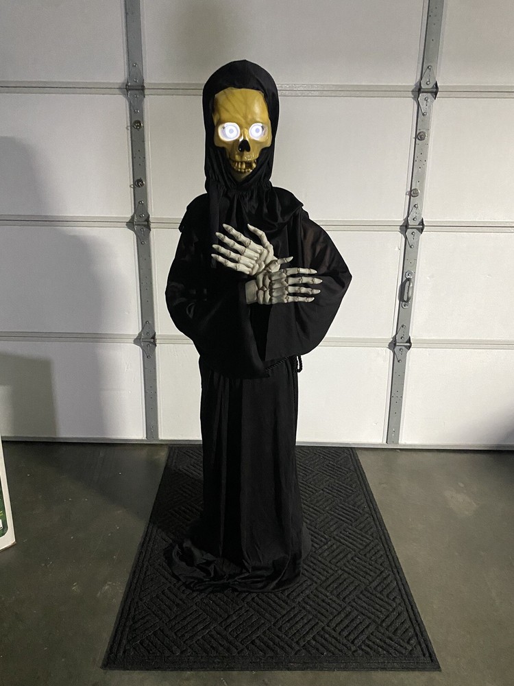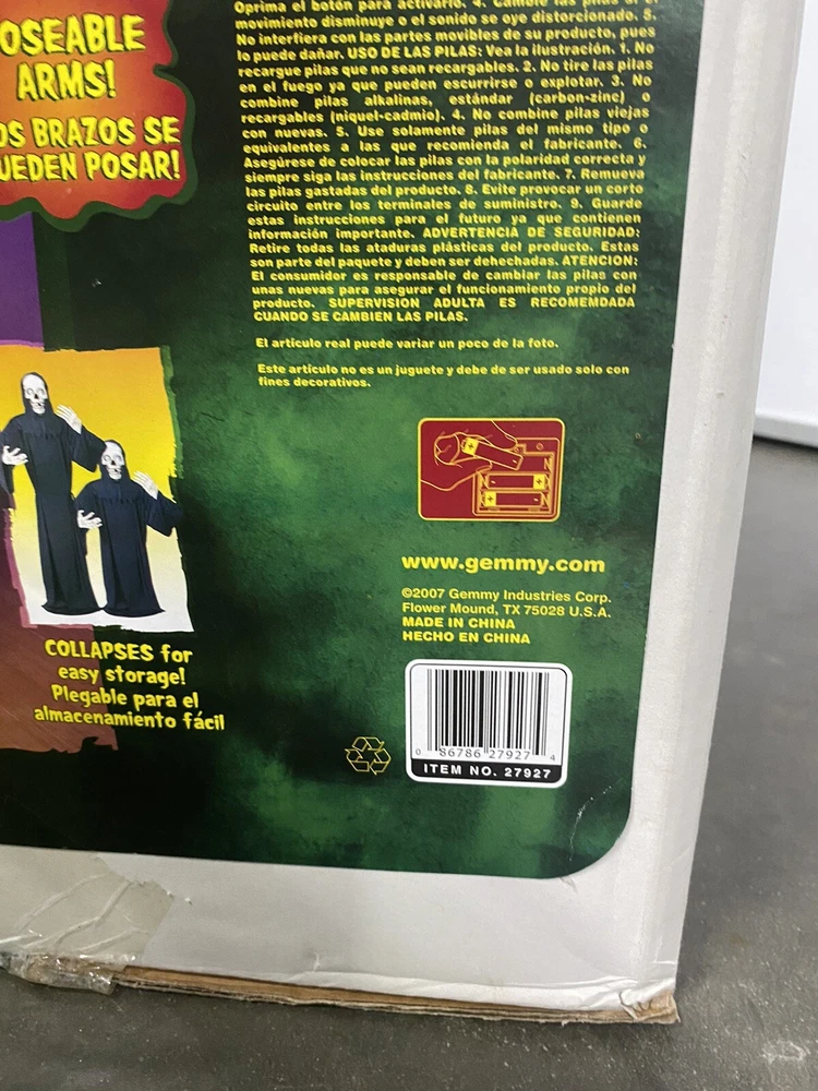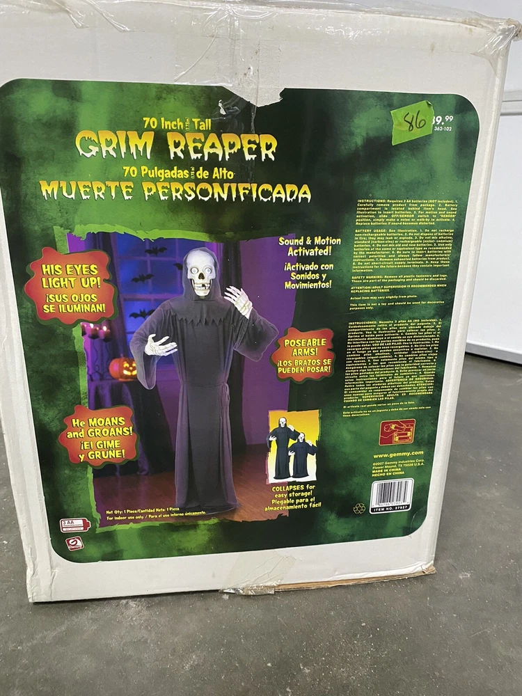 This Gemmy 70" tall grim reaper is sound and motion activated, his eyes light up and he moans and groans. He has posable arms and is collapses down for easy storage. He requires 3 AA batteries that are not included. He has a yellowed face and one side of his robe has faded all from sun exposure but he works great. You get the actual item pictured so please look at all photos and ask any questions before purchase.