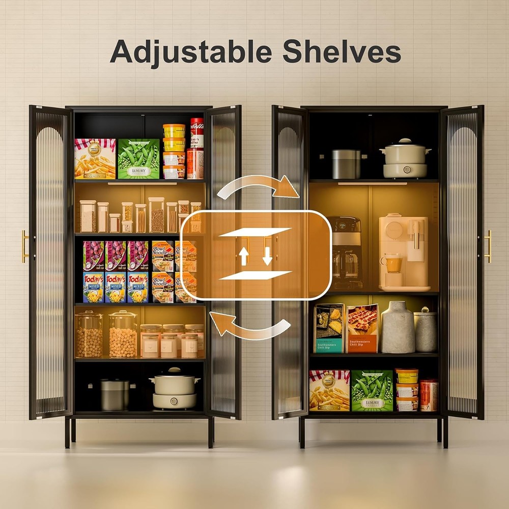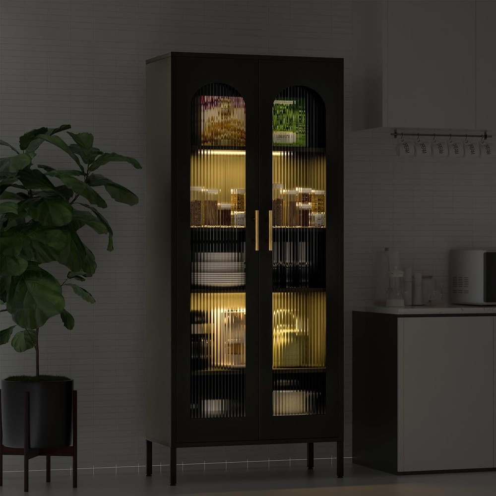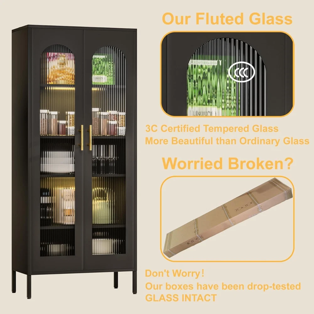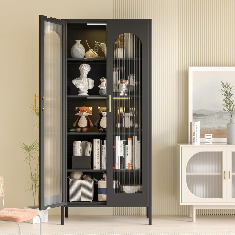 Product Description About this item • 【All-Steel Druable Material】This metal storage cabinet is manufactured with a reinforced heavy-duty steel luxury welded frame,each floor can hold up to 130 pounds.The surface is sprayed with environmentally friendly paint, which can resist scratches and corrosion for long-term no-worry use. • 【Why Choose Us】𝗢𝗡𝗘:71 inch tall display cabinet with glass doors.𝗧𝗪𝗢:Curved fluted glass,more beautiful and stronger than ordinary glass. 𝗧𝗛𝗥𝗘𝗘:Two free LED lights:The 5-tier cabinet contains two lights that can be installed at will, and the lights can be automatically sensed and lit.Make your cabinet glass more beautiful under the refraction of light. • 【Special Glass】We are different from other glass cabinets,our glass is the use of special 3C certification fluted glass.The cabinet can be used as a high strength glass decorative cabinet.Three-layer foam packaging, eliminates the worry of glass breaking during transportation. • 【Adjustable Shelves and Feet】: Black metal locker cabinets with 4 adjustable shelves, which can be removed or adjusted to suit the needs of storing large-sized items. • 【Multi-scenario Application】this steel storage cabinet can be used as a storage cabinet to organize curio, books, or art in the living room. It can also be used as glass decorative cabinets, bookshelves, media cabinets, utility cabinets, etc in offices, bathrooms, kitchens, and bedrooms for the organization of your belongings, to create a modern stylish feeling in your room. • 【Easy to Assemble】Tall glass cabinet.Size:H71*W27.6*D14.5inch.We provide complete installation instructions for this storage cabinet.The cabinet will be very easy to assemble. 【Sturdy and Durable】Metal storage cabinet with glass doors provide longer service life, with stable and sturdy feet. Special process spraying, no pollution and no paint peeling.The arched glass cabinet can be used as sideboard buffet cabinet,console cabinet,entryway cabinet,coffee bar cabinet,bookcase.Unique external door structure.Curved door frame design to prevent collision,It's safer in the family. On Aug 15, 2025 at 01:42:46 PDT, seller added the following information: