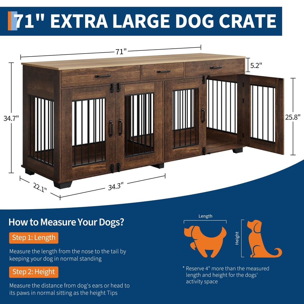 71" Dog Crate Furniture with Door, Double Kennel & TV Stand for Large Dogs, 3-Drawer Storage, Brown Key Features & Benefits Dual-Function Dog Crate & TV Stand Serves as both a secure indoor kennel for large dogs and a stylish TV stand or end table, perfectly blending pet furniture with your home decor Chew-Proof Reinforced Construction Built with sturdy MDF and 0.5-inch thick reinforced iron pipes that withstand even the most determined chewers, ensuring long-lasting durability 3-Drawer Smart Storage System Features three convenient drawers that organize pet essentials like toys, treats, and food while keeping household items neatly stored Spacious Double Kennel Design Provides ample room for large breeds to stretch and relax, with secure doors and proper ventilation for your pet's comfort and safety Elegant Furniture-Grade Finish Finished in rich brown that complements any decor style, transforming from practical pet crate to sophisticated living room centerpiece Product Specifications Dimensions: 71" L x 22.1" W x 25.8" H Material: MDF with Reinforced Iron Pipes Features: 3 Storage Drawers, Double Kennel Use: Indoor Dog Crate & TV Stand Color: Brown Suitable For: Large Breed Dogs Package List 1 x Dog Crate Furniture Main Unit 1 x Set of 3 Storage Drawers 1 x Assembly Hardware 1 x Instruction Manual