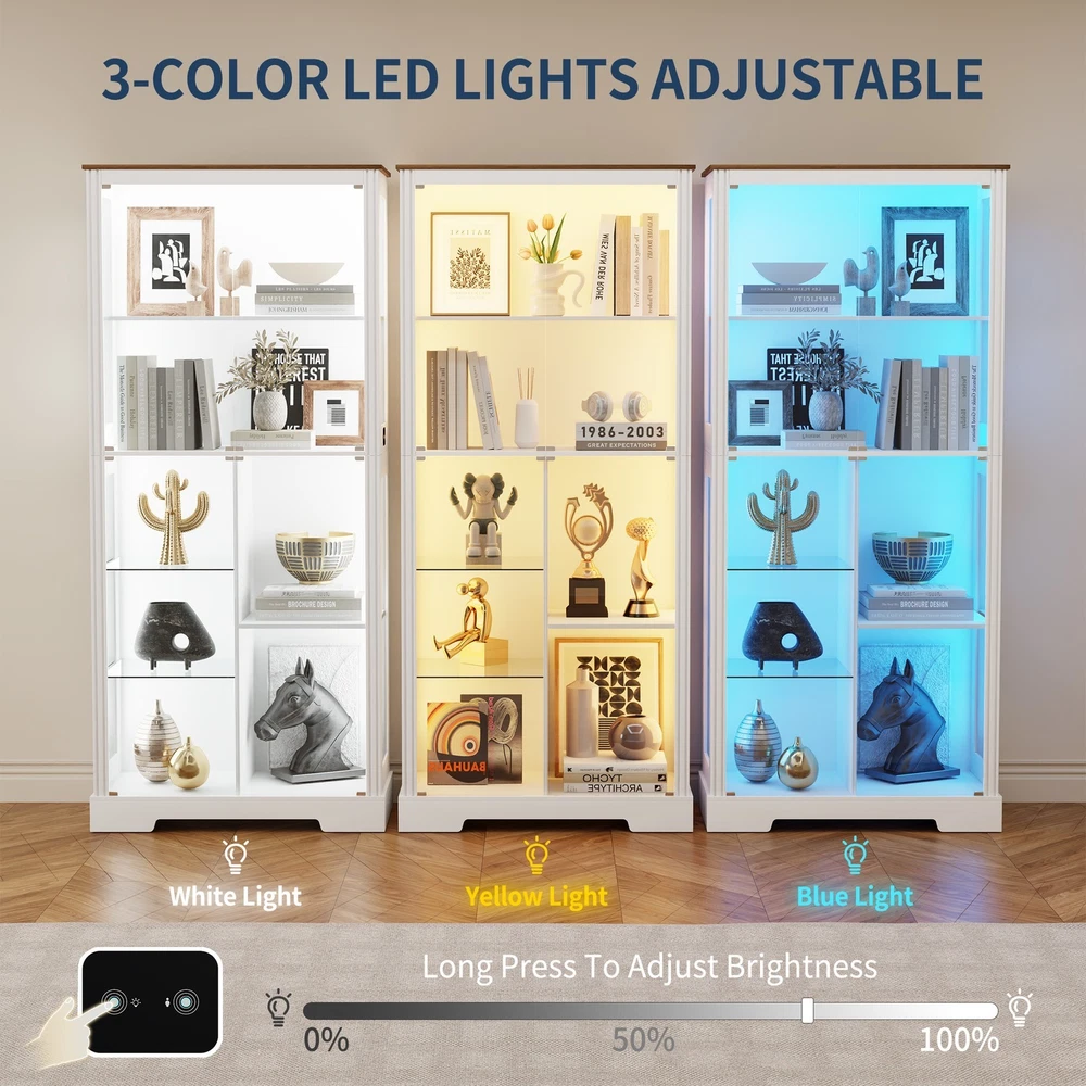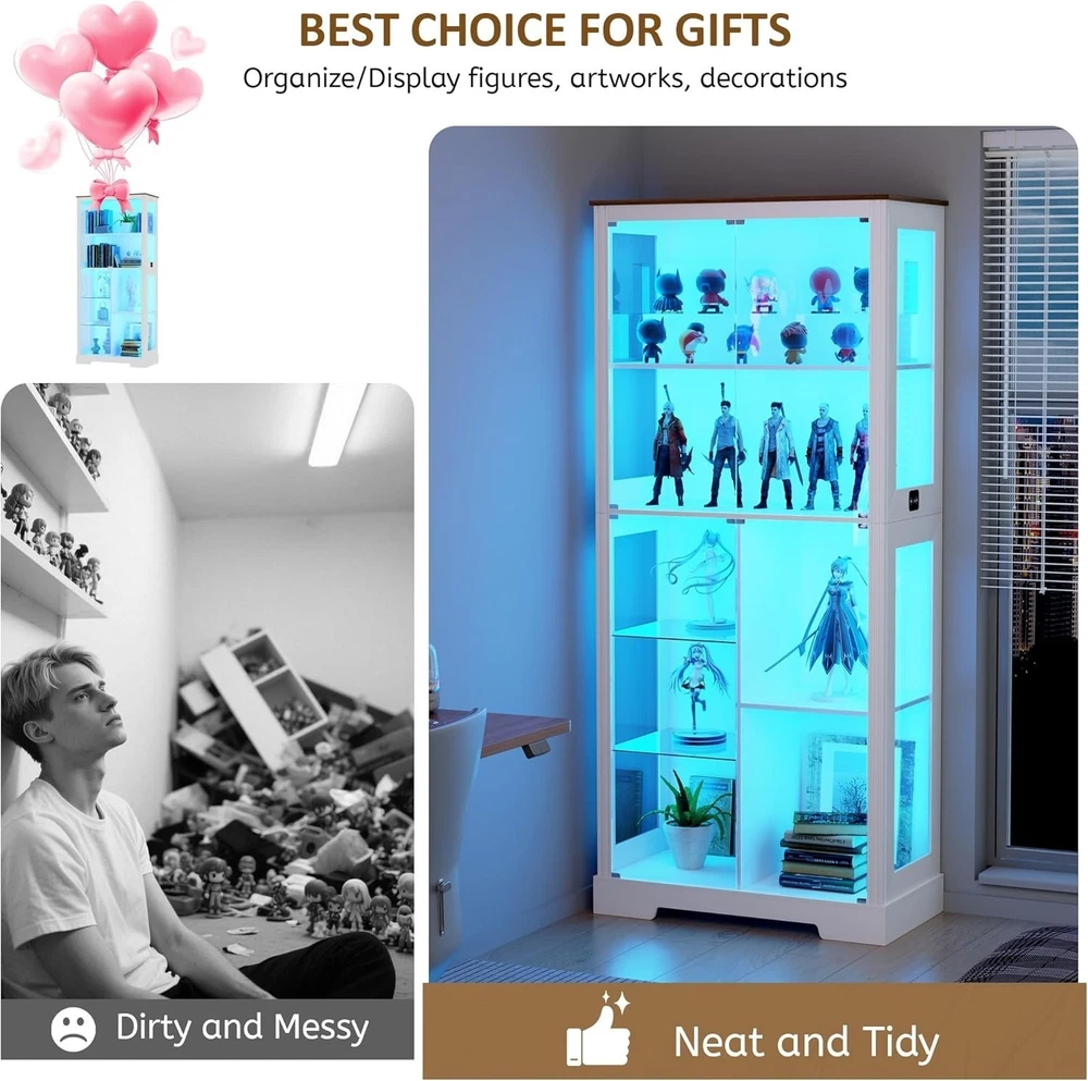 ✨【High Quality】Our display cabinets are made of high-density engineered wood and high-definition glass, which is sturdy and durable. The thickened wooden frame enhances the stability of the entire glass display cabinet and will not shake easily. It is very suitable for use as a collection cabinet for figures in the bedroom/e-sports room, an antique cabinet, a bookcase in the office/study, a wine cabinet in the restaurant, etc. ✨【Pop-up Glass Door】The pop-up glass door design of this display shelf, high-definition glass, does not deform or discolor, allowing you to enjoy the beauty of the collection at a glance, and the handleless design is more stylish and exquisite. The 2 removable glass compartments can be installed/removed at any time, so that you can adjust according to your needs. ✨【Intelligent Human Body Induction】Our storage cabinet is designed with an intelligent human body induction system. You only need to turn on the human body induction function, and the light will automatically light up when you are within 1-2 meters. After leaving for 30 seconds, the light will automatically turn off. ✨【3 Light Modes】Our curio cabinet is equipped with 3 adjustable modes (blue, yellow and white) LED light strips, which are safer than ordinary bulbs and add a modern touch to your living space. At the same time, you can touch the switch to change the color mode, or adjust the brightness by long pressing the touch. ✨【Easy Assembly】The display shelves dimensions of 31.5" W x 70.8" H x 15.7" D,The package comes with step-by-step instructions, all parts and accessories are labeled, we recommend that you follow each step in the instructions! If there are any issues with lost goods or damaged parts, just click "Contact Seller" to get a satisfactory solution. ✨【Ideal Holiday Gift】You can give this display cabinet to your husband, boyfriend, son or yourself on holidays, birthdays, anniversaries, it is an intimate and ideal gift for various occasions such as Valentine's Day, Father's Day, Christmas, birthdays or housewarming celebrations. Glass Display Curio Cabinet for Collectibles, Toys, Figures, Legos, Decorations Humanized Design - Human Body Induction Make Your Life More Intelligent Lighted Display Cabinet With Dimmable 3 Color Lights & Adjustable Brightness Extra Large Storage & Display Space 71" Tall Display Cabinet with Shelves Display Case Cabinet can hold up to 220 pounds Unbreakable & High-Definition Tempered Glass Doors Perfect for Home, Office, Playroom, Living Room, Study Room More Details about Lvifur Glass Display Cabinet Magnetic Doors Catch Ensure silent and smooth door operation Press to close and open, convenient and fast Anti-Tipping Device High security to prevent tipping Durable, safe, sturdy and stable