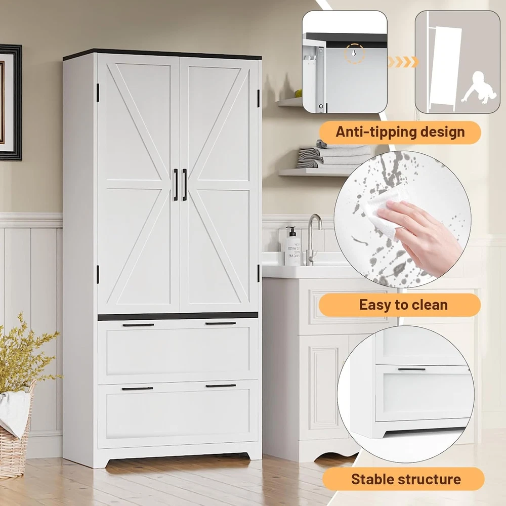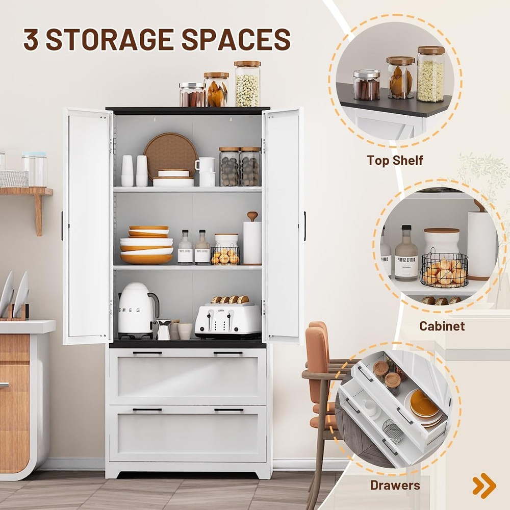 Product Description About this item • STABLE AND DURABLE: Pantry cabinet is made of cold rolled steel to create unmatched durability, and the heavy-duty steel construction has a total weight capacity of up to 780 lbs. The kitchen cabinet is powder coated for a smooth, easy-to-clean surface for daily use and maintenance. Ideal for kitchen pantry, living room. • MAXIMISE SPACE:Tall kitchen pantry cabinet offers 5 levels of storage space including 2 adjustable shelves and 2 deep drawers. The height of the adjustable shelves can be adjusted to suit your storage needs, ensuring you have enough storage space for food, essentials, small appliances etc.. The white cabinet with doors can be used as a kitchen storage cabinet for tinned food or a craft cabinet in the living room. • SAFE AND BEAUTIFUL: The white pantry storage cabinet is equipped with an anti-tipping device and levelling feet to ensure the stability of the cabinet on uneven floors, enhancing your safety during use.Featuring a barn door style design, the farmhouse storage cabinet is a sleek and simple combination of white and black, blending farmhouse charm with modern functionality. Can be used to organize food, kitchen items or crafts - turn clutter into style! • HUMANISED DESIGN: Tall pantry cabinet hinged for easy and smooth door opening. Drawer slides are smooth and fluid, easy to pull. Magnetic door design helps you open and close the door easily.Humanised detail design enhances your applicable comfort and is an excellent choice for home storage. • EASY ASSEMBLY: Tall storage cabinets with doors and shelves comes with pre-labelled parts + step-by-step video guide + detailed instructions. Ensure you complete the assembly easily and quickly. Buy this freestanding food pantry cabinet to safely store your valuables in your kitchen, living room or home office.(Not designed for clothing storage) Crafted from premium cold-rolled steel, the Eltean 71"Tall Storage Cabinet combines practicality with modern farmhouse aesthetics. Whether it's for your kitchen, living room or laundry room , its versatile design will meet your storage needs while enhancing the tone of your home. Measuring 71"H*31.5"W*15.8"D and with a weight capacity of 180 pounds per shelf, this kitchen cabinets makes it easy to store a variety of items. Assembly of this freestanding pantry cabinet is a breeze with pre-labelled parts, step-by-step video guides and assembly instructions. Kitchen storage cabinet say goodbye to clutter with 2 adjustable shelves, 2 deep drawers and top space. Use it as a food storage cabinet for tinned food, a craft cabinet for DIY materials or a laundry organiser for detergents - the possibilities are endless. Maximise your vertical storage space with the adjustable height of the pantry cabinets shelves. Whether you're storing everyday items from your kitchen pantry, bulky appliances, easily adjust the interior to accommodate tall bottles and jars, stand mixers. Farmhouse pantry cabinet is equipped with adjustable feet to keep it stable even on uneven floors; metal handles with magnetic door design ensure easy opening and closing of doors; drawer slides are smooth and easy to pull; ensuring your comfort. White storage cabinet with doors is made of cold rolled steel material and powder coating technology, scratch-resistant and easy to clean; reinforced steel frame prevents deformation and sagging, sturdy structure, and equipped with anti-tipping wall anchors to protect the safety of your family. Kitchen pantry storage cabinet: easily organise spices, small appliances and bulk foods; Living room storage: display books, decorative items or audio-visual equipment; Laundry room : detergents, ironing boards and cleaning products.