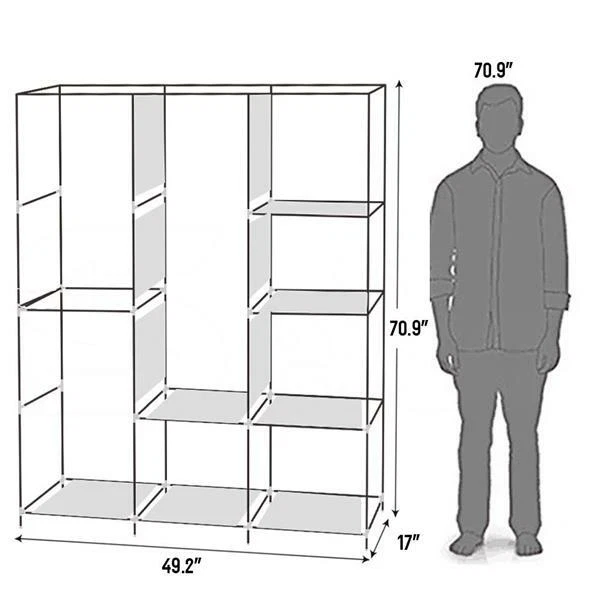 Introductions: Our 71" Portable Closet Storage Organizer Clothes Wardrobe is Made from Selected Non-Woven Fabric Cover, High Quality Steel Tube and PP Plastic Connectors, Which Will Durable and Meet Your Long Term Storage Needs. The Size for The Clothes Wardrobe Makes it Suitable for Organizing Your Small Rooms and Walk-In Closet. Movable Improved Clothes Hanging Rod and 8 Storage Shelves Offers You Enough Space Both for Your Longer Outfits and Folded Clothes. Zippered Dustproof Cover Offered to Keep Your Item Away from Dust and Water-Proof Fabric Tiers are Easy to Clean. It Will Be Great Convenient and Functional. Do Not Hesitate to Buy One! Features: 1. STURDY & DURABLE CONSTRUCTION: Made from Selected Non-woven Fabric Cover, Water-Proof Fabric Tiers, High Quality Steel Tube and PP Plastic Connectors, This Portable Storage Closet Will Meet Your Long Term Storage Needs. 2. SPACE SAVING ORGANIZER:Great Size of 49.2”W x 17” D x 70.9”H, Which Makes it Suitable for Organizing Your Small Rooms and Walk-in Closet. 3. SPACIOUS STORAGE CLOSET: Movable Clothes Hanging Rod and 8 Storage Shelves Offers You Enough Space both for Your Longer Outfits and Folded Clothes. 4. DUSTPROOF COVER & WATER-PROOF TIER: Zippered Dustproof Cover Offered to Keep Your Item away from Dust and Water-proof Fabric Tiers are Easy to Clean. 5. CONVENIENT TO USE & ASSEMBLE: This Amazing Closet Makes Your Clothes or Daily Accessories Easy to Access; Installation is just Easy, no Tool Required. Note: 1.When receiving the goods, please confirm the product according to the listing of instructions. Once you find Less pieces, please provide relevant pictures to contact us. We will deal it in the time. 2.Please install goods with the instruction manual. 3.It is recommended that the installation should not be too tight to adjust easily. After the structure is installed, firm the interface for more stability. Specifications: 1. Item Name: 71" Portable Clothes Closet Home Wardrobe Clothes Storage Organizer with Shelves 2. Material of the Home wardrobe: Non-Woven Fabric Cover, Steel Tube And Plastic Connection 3. Dimension of Home Wardrobe: (49.2 x 17 x 70.90)" / (125 x 43.18 x 180)cm (W x D x H) 4. Color of Home Wardrobe: Gray Package Includes: 1 x Portable Closet 1 x Instruction Notes: 1. Please make sure all poles reach the bottoms of plastic connector holes. 2. Please be careful during assembly and dis-assembly.