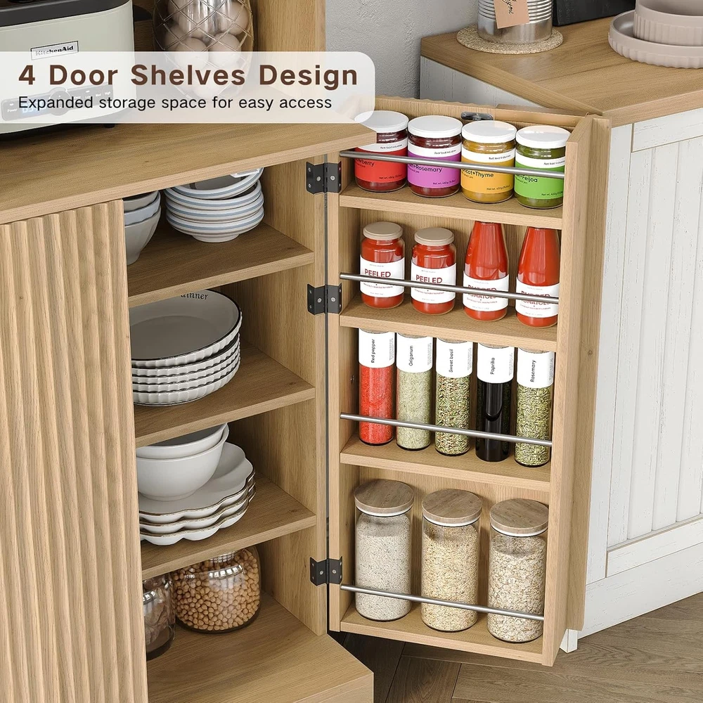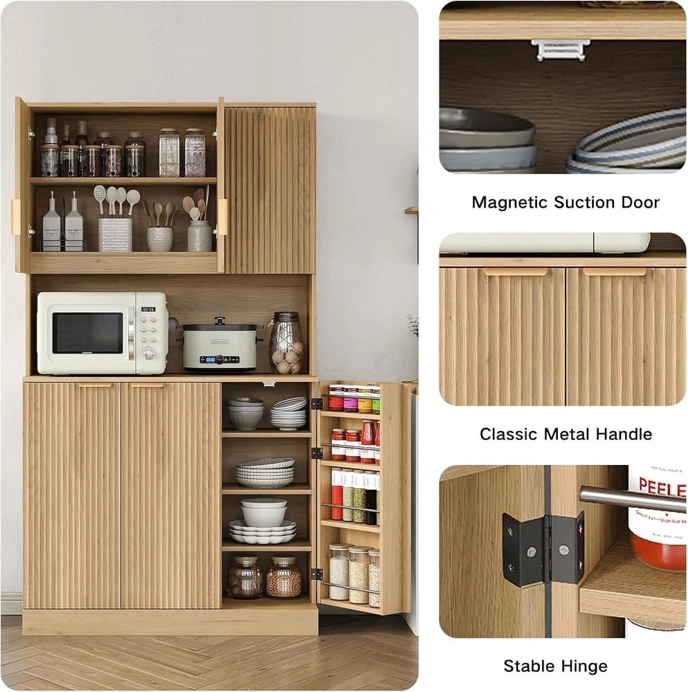 Product Description About this item • Spacious & Smart Storage Solution: Maximize your kitchen organization with this extra-large pantry featuring 10 shelves (1 adjustable) and 4 door-mounted racks—perfect for storing dry goods, cookware, and small appliances. The enclosed storage keeps items dust-free, while the sturdy top platform accommodates heavy appliances like microwaves and coffee makers with ease • Durable and Reliable Construction: Crafted from premium P2-grade medium density board, this kitchen pantry cabinet is built to last. Each door is equipped with dual hinges for smooth, wobble-free operation, while integrated magnetic locks ensure effortless opening and closing. For added safety, we've included anti-tip hardware to securely anchor the cabinet to your wall, preventing any accidental tipping • Elegant & Unique Style: The fluted panel design add a touch of sophistication, elevating your kitchen’s aesthetic. Its versatile modern style blends seamlessly into any space • Pefect for Any Space: With its compact dimensions of 40.78"W x 71"H x 15.4"D, this multifunctional storage cabinet seamlessly adapts to various spaces throughout your home. Its sleek, minimalist design effortlessly complements kitchens, dining rooms, living areas, and home offices. Use it as a kitchen organizer, coffee bar cabinet , buffet cabinet, or beverage bar - the possibilities are endless • Easy to Assemble: Designed for hassle-free setup, this tall kitchen hutch comes with clear instructions and all necessary hardware. You’ll have it ready in no time, so you can start organizing right away. If you have any questions during the setup or product, our dedicated customer service team is here to assist you