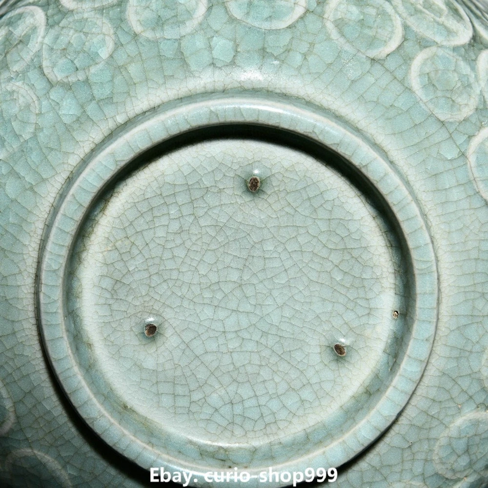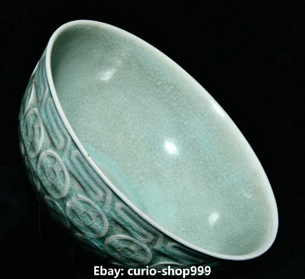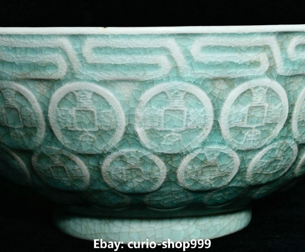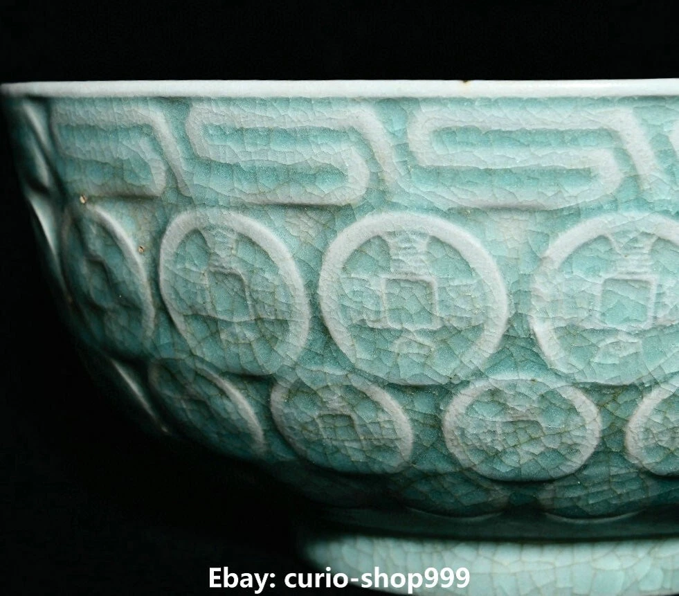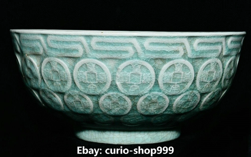 Height: 14in. (35.5cm) Seller Notes: “7.1" Old Song Dynasty Ru Kiln Porcelain Coin Money Pattern Treasure Bowl Statue” Maker: Size : Height 3.1 Long 7.1 breadth (inch) Primary Material: Ru Kiln Porcelain Region of Origin: China