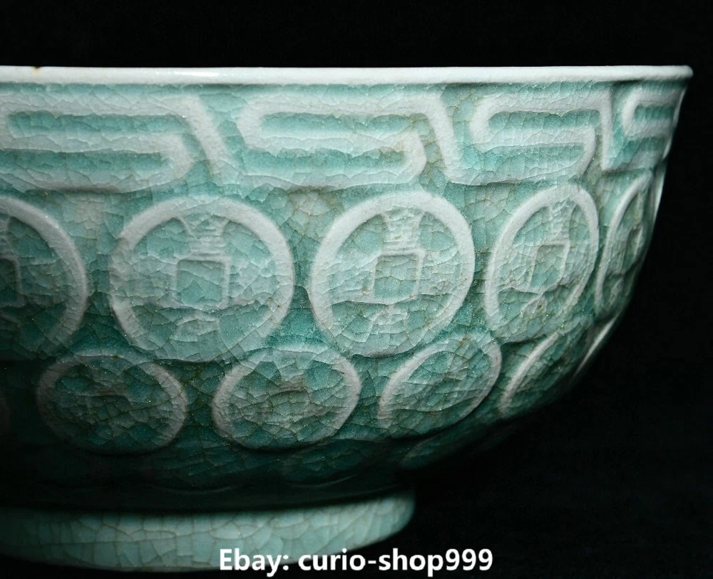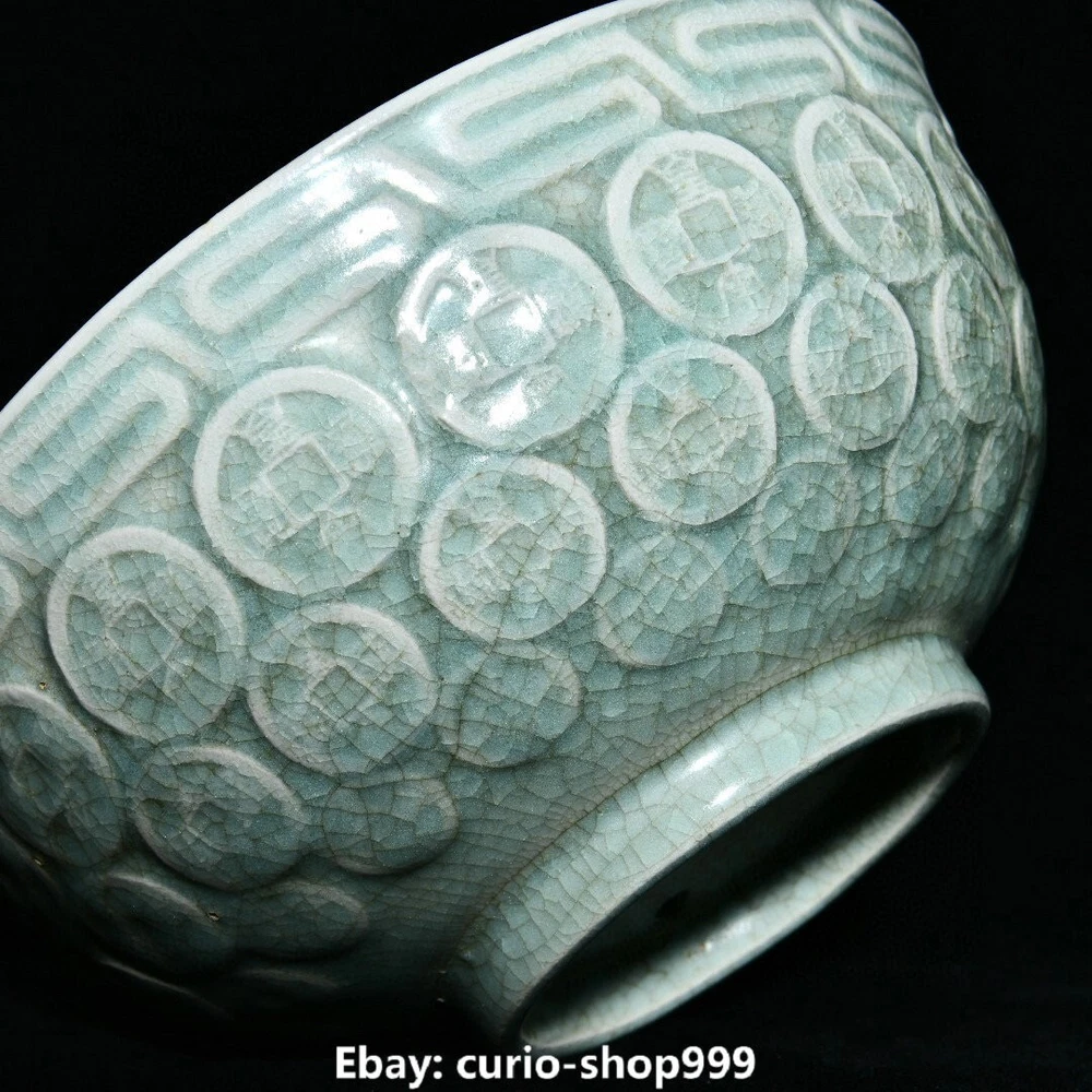 7.1" Old Song Dynasty Ru Kiln Porcelain Coin Money Pattern Treasure Bowl Statue