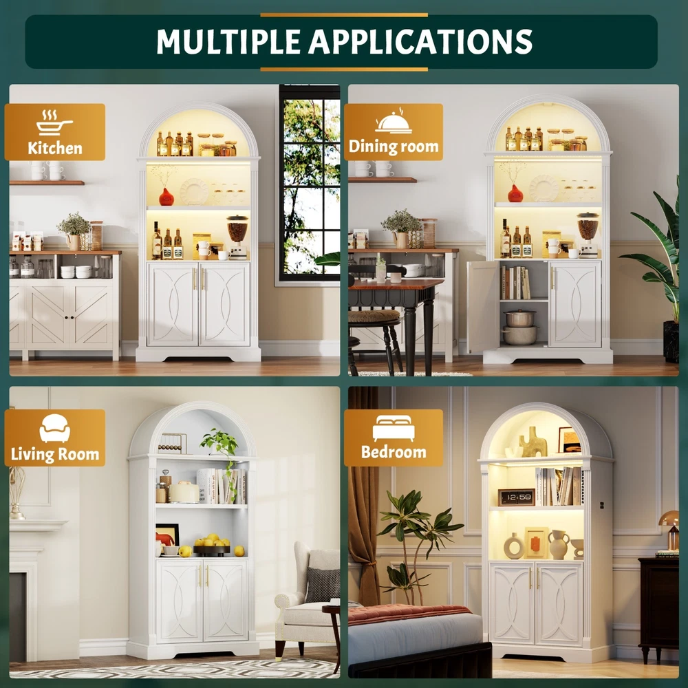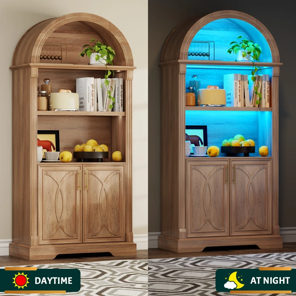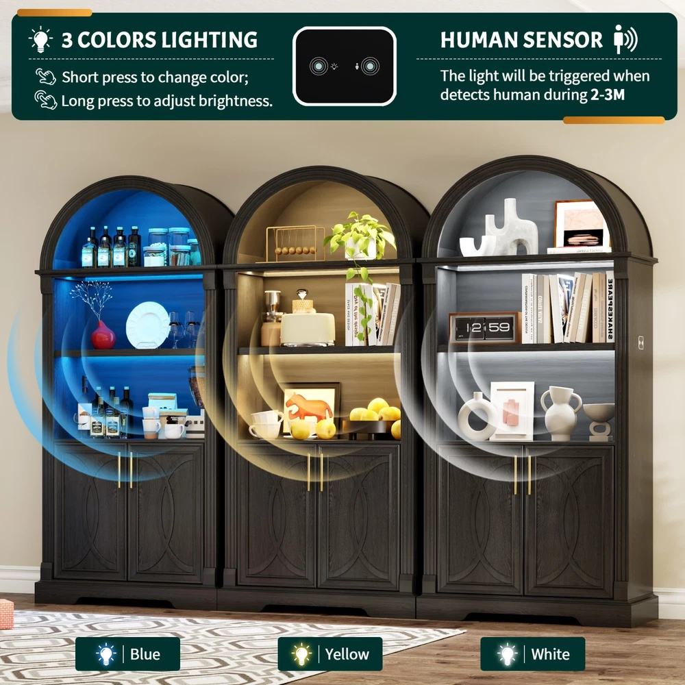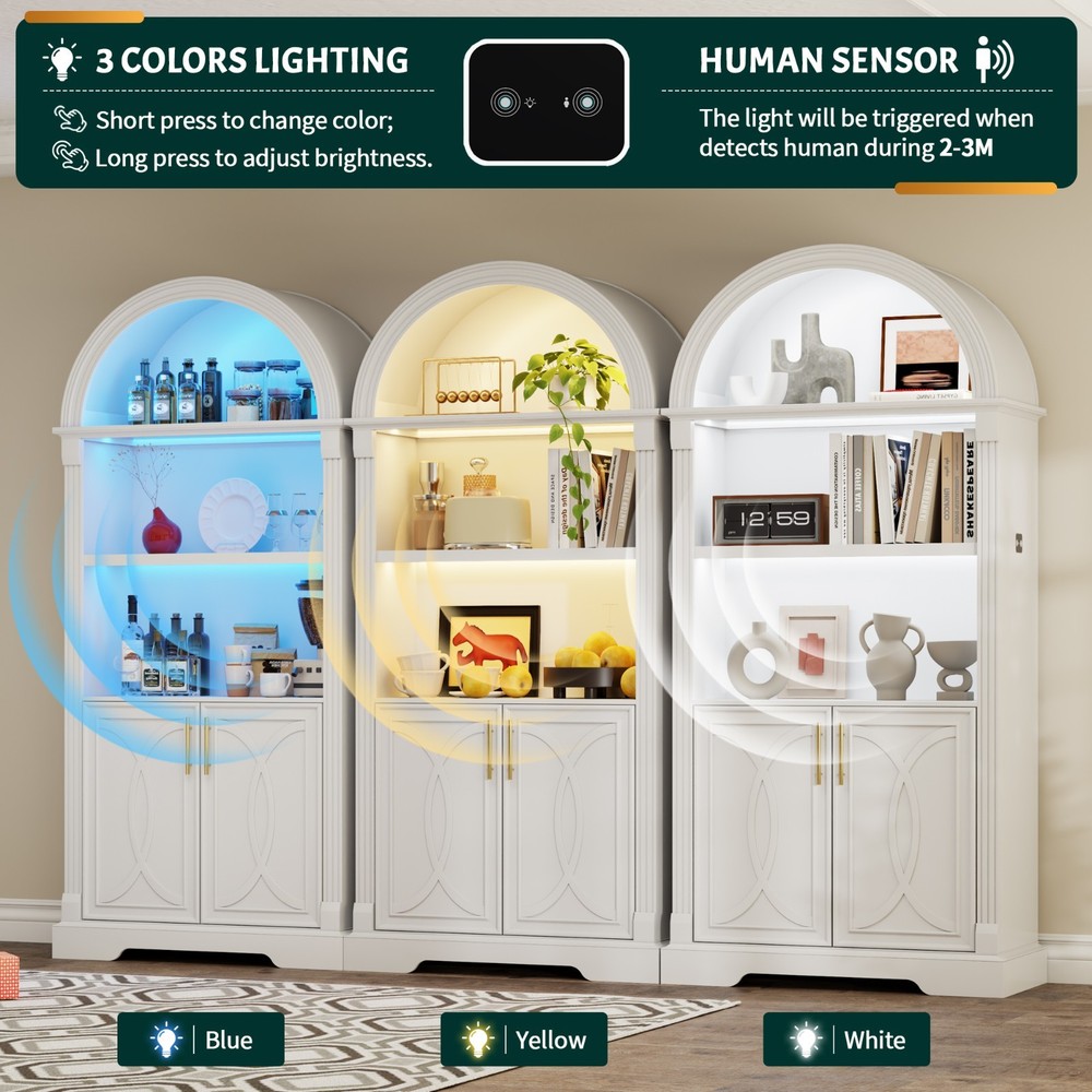 【Body Sensor Switch】Our arched cabinet includes a human body sensor light that automatically turns on when somebody is nearby, ensuring safety in the dark by preventing falls or collisions, automatically turns off after a set time when no one is around, making it energy-efficient and convenient 【Human Sensor LED Light with 3 Color Modes】Our arch cabinet equipped with a human sensor LED strip, this arched cabinet lights up automatically when you approach it. , you can also adjust the light's brightness by pressing and holding the control button, fix for different atmospheres 【Overall Dimensions】 70.8" H x 31.5" L x 15.7" W,This arched cabinet includes 3 extra-wide shelves and roomy interior,providing ample space for display or storage, suitable for use as arched bookcase,kitchen pantry cabinet, arched bookshelf, arched storage cabinet, arched china cabinet,living room display 【Arched Design】Arched cabinet is a stunning blend of design and practicality.The open arched shelves complement the design, offering both visual appeal and easy access to essentials.This arch cabinet a perfect fit for modern and luxury home styles, adding a touch of refined beauty 【Easy To Assemle】The packaging contains detailed installation instructions, making the assembly process simple and easy. It is recommended that 2 people install, usually within 1 hour to complete the installation.If you encounter any problems during the assembly, the seller will provide you with a satisfactory solution within 24 hours! 3 COLORS LIGHTING AND HUMAN SENSOR Double the Value, Double the Fun! PROTUCT DIMENSIONS 3 Colors to Choose From – There's Always One That's Perfect for You!