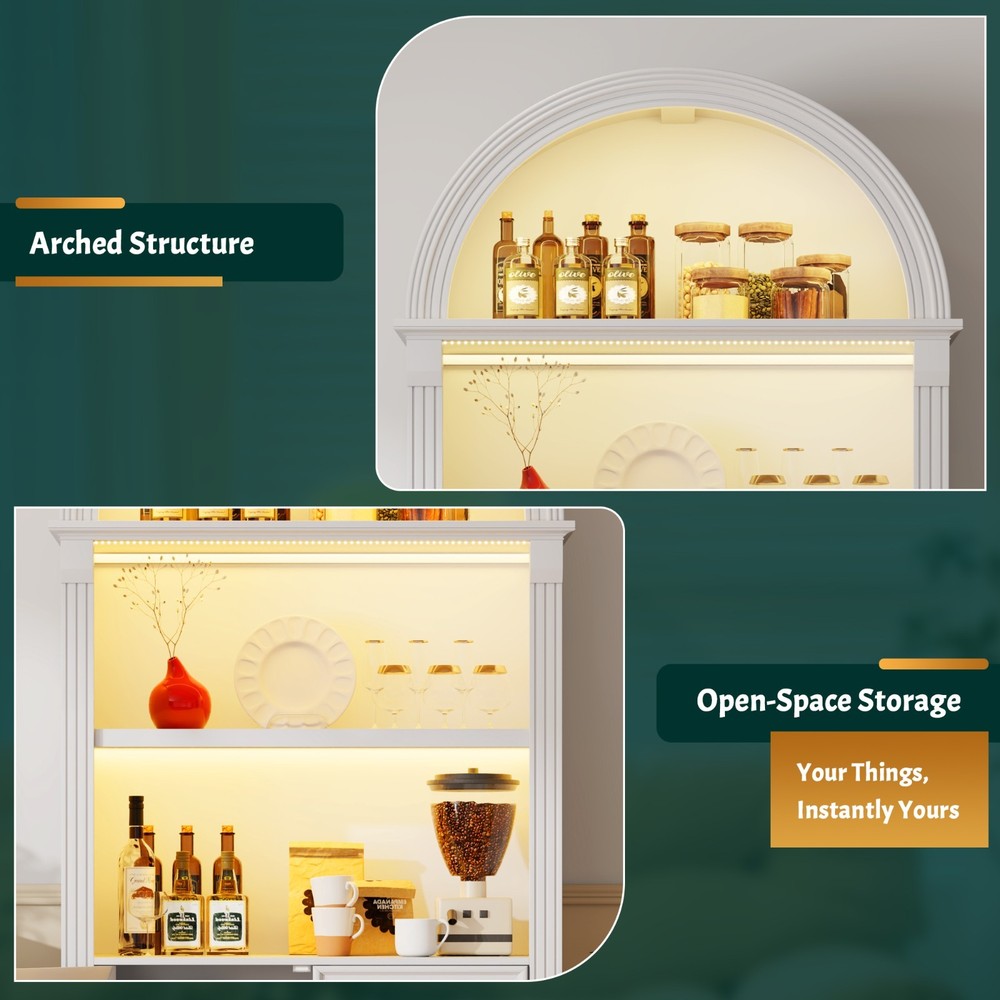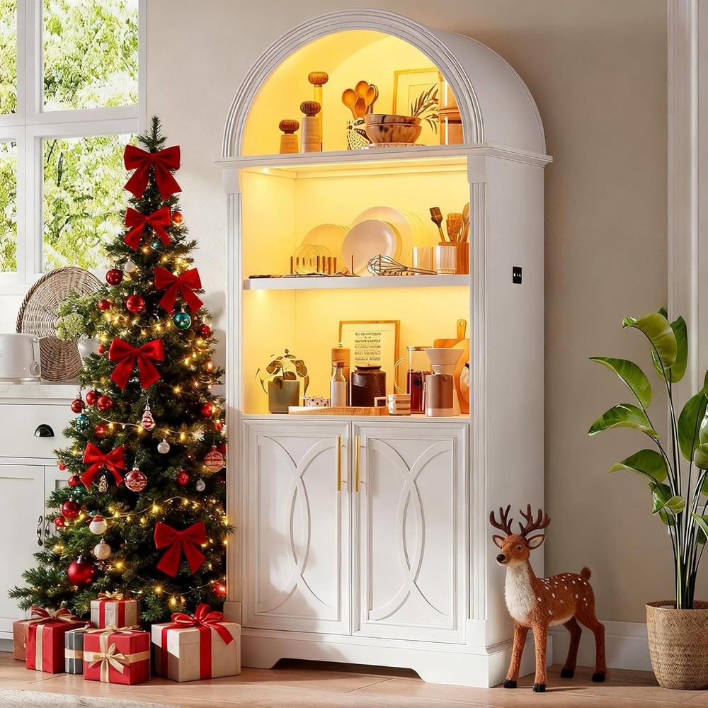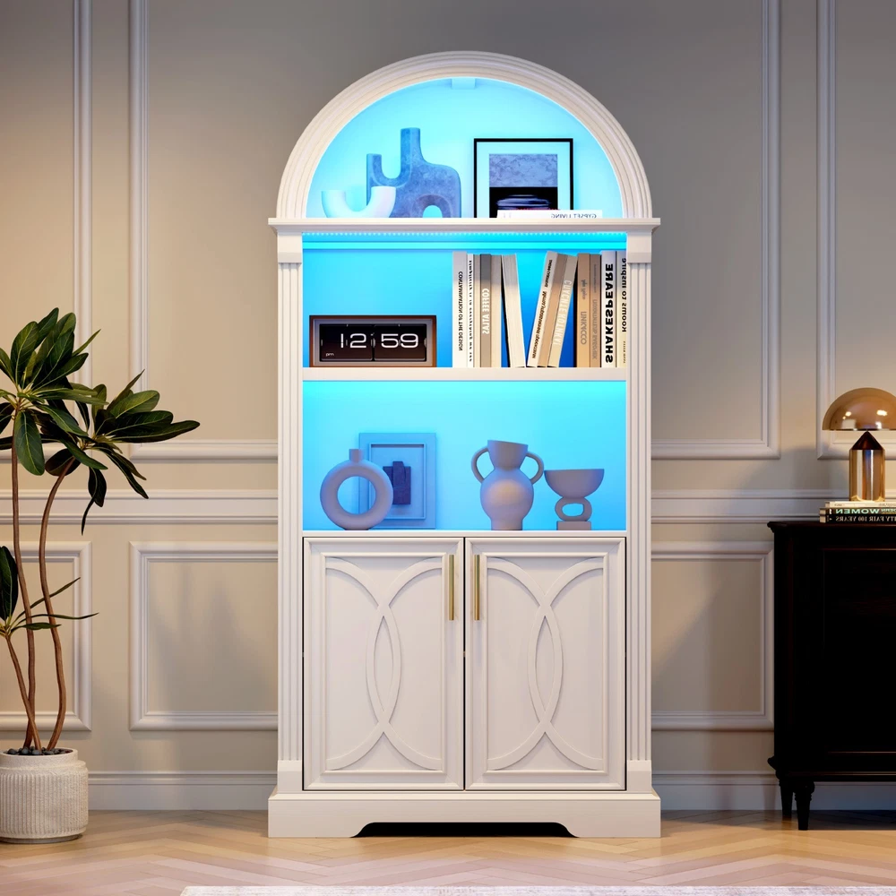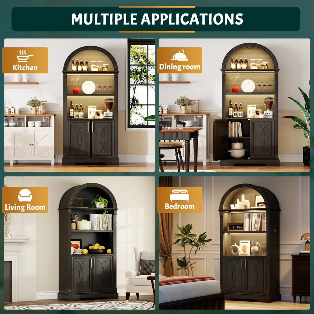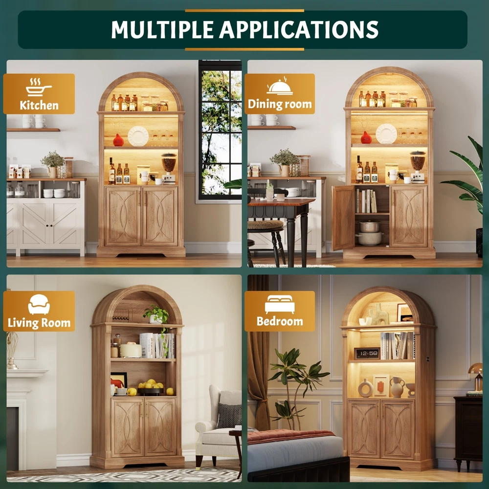 【Body Sensor Switch】Our arched cabinet includes a human body sensor light that automatically turns on when somebody is nearby, ensuring safety in the dark by preventing falls or collisions, automatically turns off after a set time when no one is around, making it energy-efficient and convenient 【Human Sensor LED Light with 3 Color Modes】Our arch cabinet equipped with a human sensor LED strip, this arched cabinet lights up automatically when you approach it. , you can also adjust the light's brightness by pressing and holding the control button, fix for different atmospheres 【Overall Dimensions】 70.8" H x 31.5" L x 15.7" W,This arched cabinet includes 3 extra-wide shelves and roomy interior,providing ample space for display or storage, suitable for use as arched bookcase,kitchen pantry cabinet, arched bookshelf, arched storage cabinet, arched china cabinet,living room display 【Arched Design】Arched cabinet is a stunning blend of design and practicality.The open arched shelves complement the design, offering both visual appeal and easy access to essentials.This arch cabinet a perfect fit for modern and luxury home styles, adding a touch of refined beauty 【Easy To Assemle】The packaging contains detailed installation instructions, making the assembly process simple and easy. It is recommended that 2 people install, usually within 1 hour to complete the installation.If you encounter any problems during the assembly, the seller will provide you with a satisfactory solution within 24 hours! 3 COLORS LIGHTING AND HUMAN SENSOR Double the Value, Double the Fun! PROTUCT DIMENSIONS 3 Colors to Choose From – There's Always One That's Perfect for You!